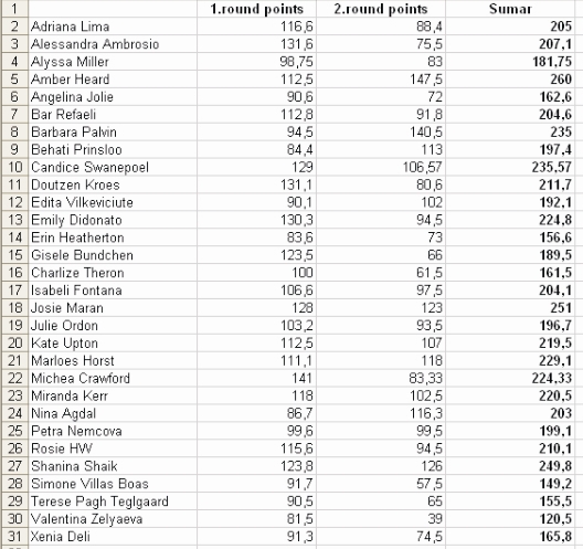 In the end of the round, points are counted together with the points from the previous rounds and first 10 women with the most points make it to the final round.