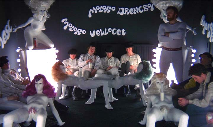 In London, Alex DeLarge (Malcolm McDowell) is the leader of his "droogs", Pete (Michael Tarn), Georgie (James Marcus), and Dim (Warren Clarke), one of several youth gangs. One night, after intoxicating themselves on "milk plus", they engage in an evening of "the old ultra-violence", including beating an elderly vagrant (Paul Farrell) and fighting a rival gang led by Billyboy (Richard Connaught). Stealing a car, they drive to the country home of Mr. Alexander (Patrick Magee), where they beat Mr. Alexander to the point of crippling him for life, and then Alex rapes his wife (Adrienne Corri) all while singing "Singin' in the Rain".