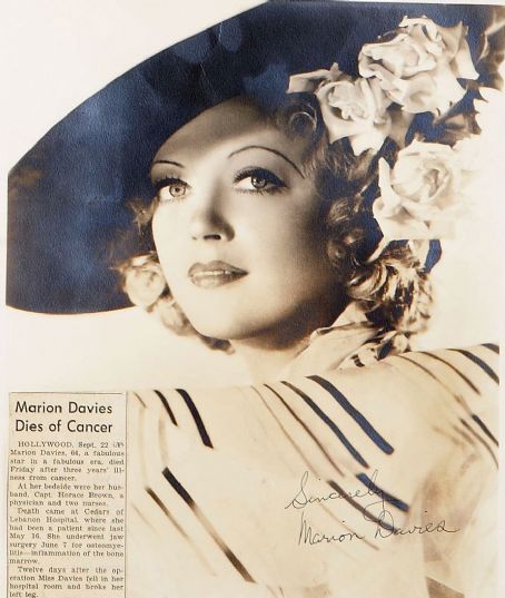 Davies died of cancer on September 22, 1961 in Hollywood, California. Her funeral at Immaculate Heart of Mary Church in Hollywood (donations to the church were from Hollywood celebrities such as Louis B. Mayer's estate (he died in 1957) and Bing Crosby) was attended by many Hollywood celebrities, including Mary Pickford and Mrs. Clark Gable (Kay Spreckels), as well as President Herbert Hoover. She is buried in the Hollywood Forever Cemetery and left an estate estimated at more than $30 million.