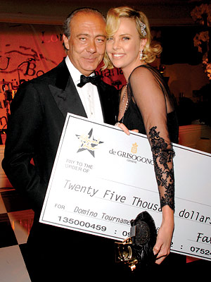 Tinseltown A-listers enjoyed an exotic game night when luxury jeweler de Grisogono hosted the first-ever Hollywood domino tournament at the Beverly Hills Hotel. "You are so beat!" a confident Charlize Theron (in Dior) announced to fellow guests Demi Moore, Salma Hayek and Kate Hudson at the 1940s Night in Havana-themed black-tie gala, which benefited the Art of Elysium. Turns out the actress was right: After being crowned the tournament's big winner, Theron giddily accepted a $25,000 blank check for the charity of her choice.