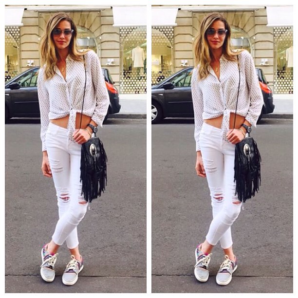 Em Paris, o look de@anabeatrizbarrosofficial pro#instaweek de hoje mostra o poder dos detalhes. No lugar do look branco liso, ela veste jeans rasgado, camisa de bolinha com amarração e tênis listrado. Ficou perfeito pra turistar, Ana! Get the look: camisa @equipment_fr, calça@frame_denim, óculos@maisonvalentino, bolsa#saintlaurentparis e tênis