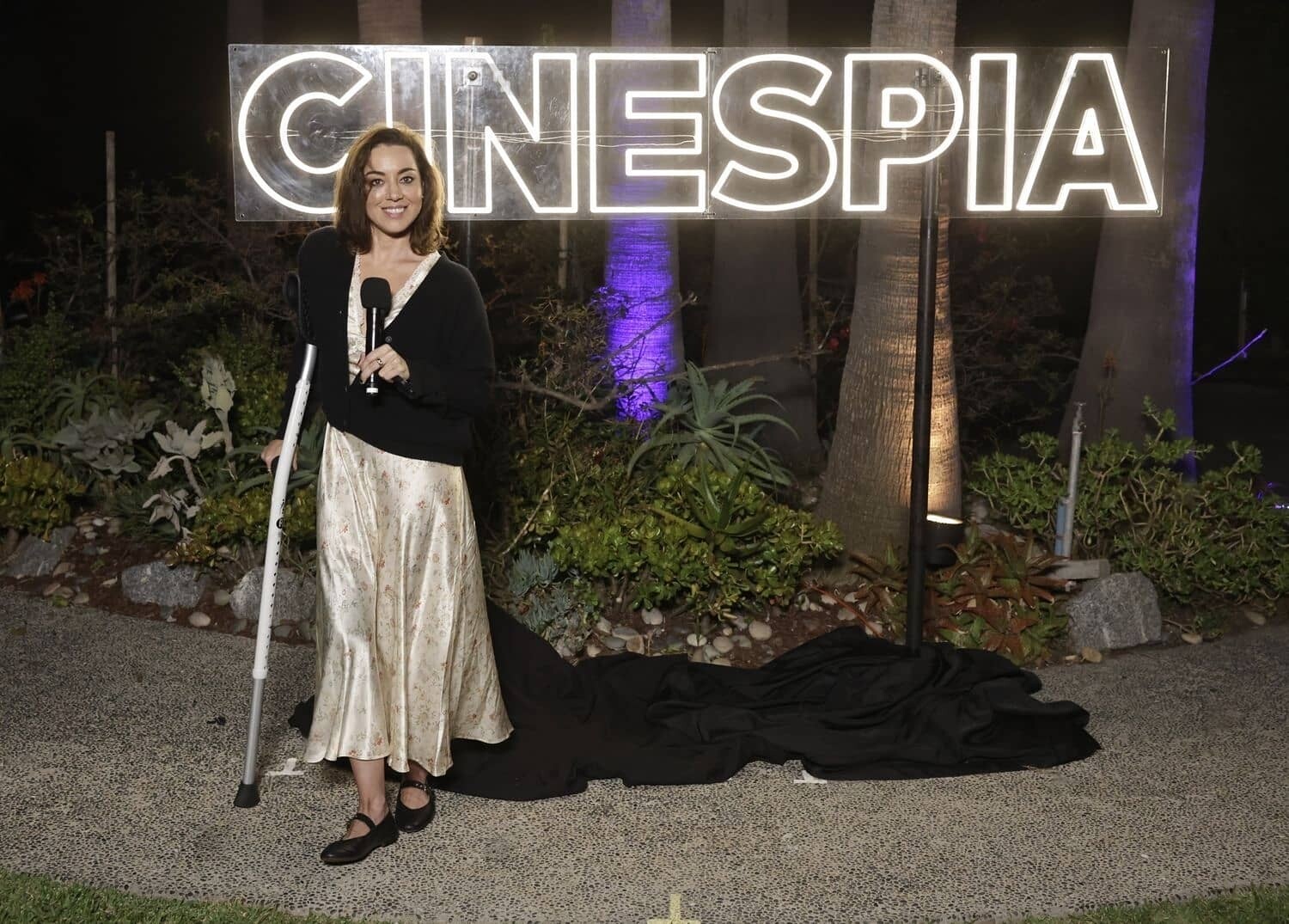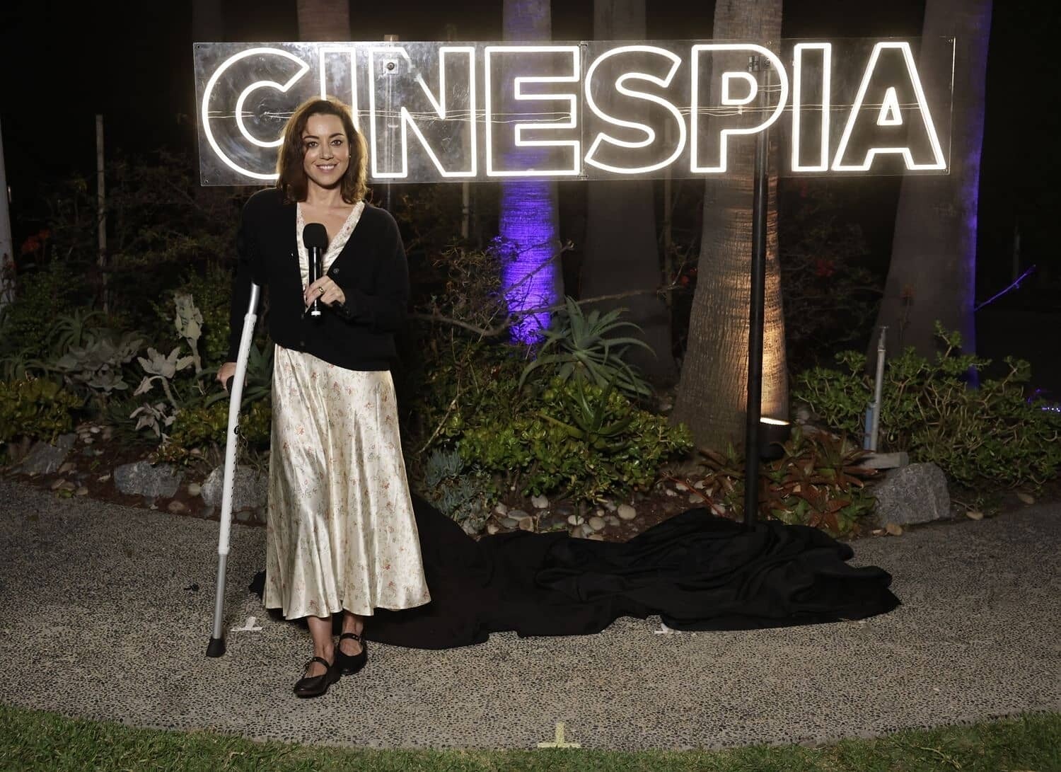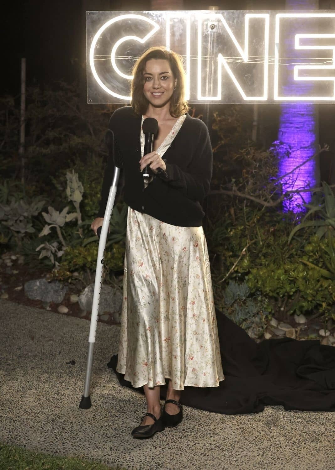 Aubrey Plaza, at the 2024 WNBA All-Star Game, on July 20, 2024, in Phoenix, Arizona, tore her ACL and had to use crutches to walk