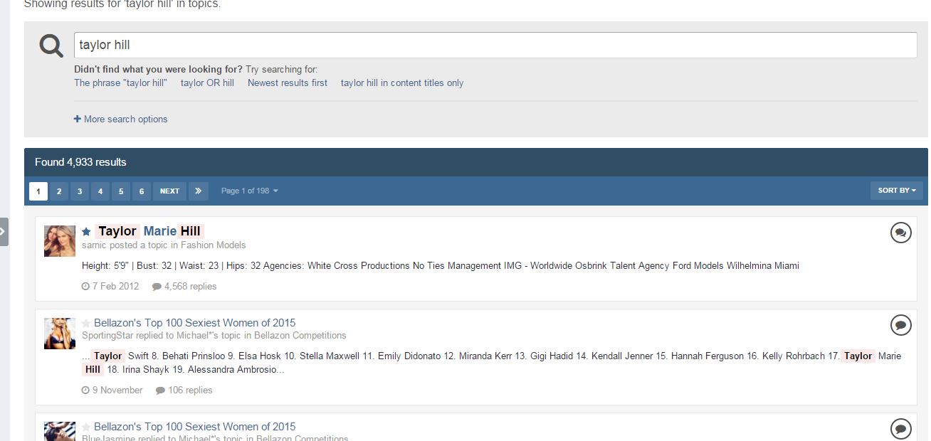 Are you searching for Taylor then within the model forum or the main site page? You also may be hitting "This Forum" search refinner instead of just Topics. Because when I search just topics Taylor Hill's topic comes up as the very first result: