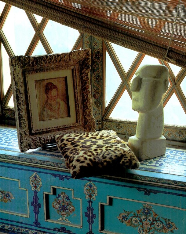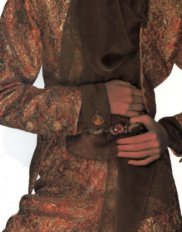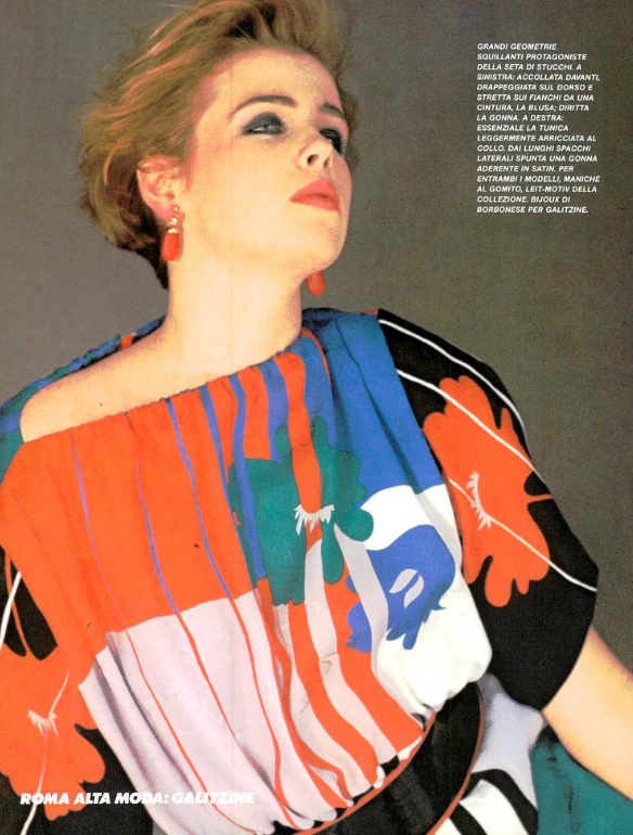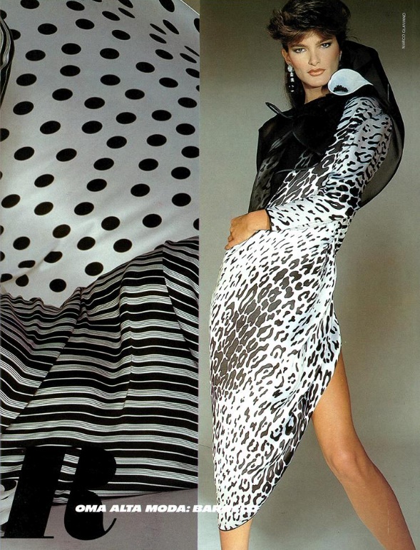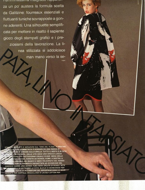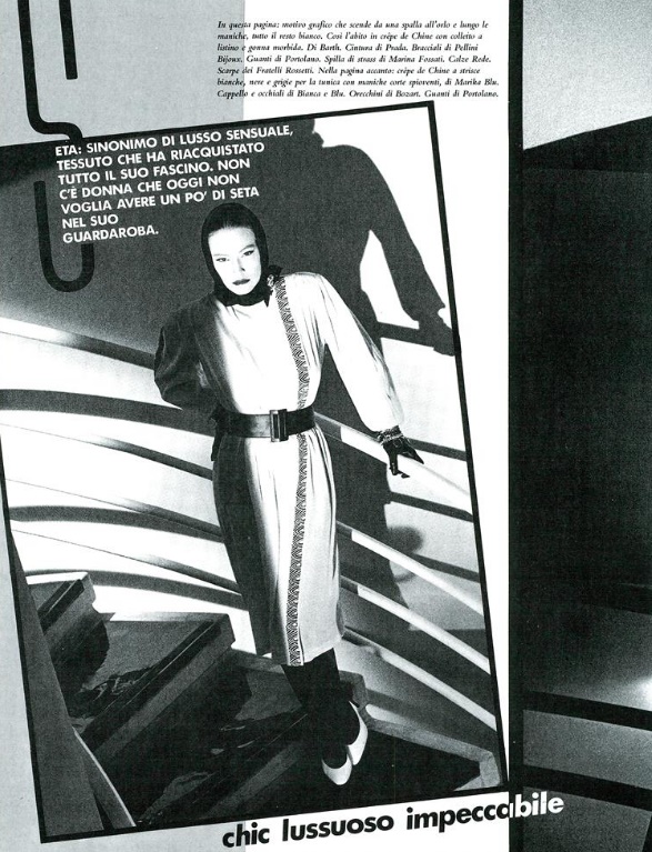 "seta stampata, lino intarsiato" VOGUE Italia, March 1983 Photographer: Marco Glaviano