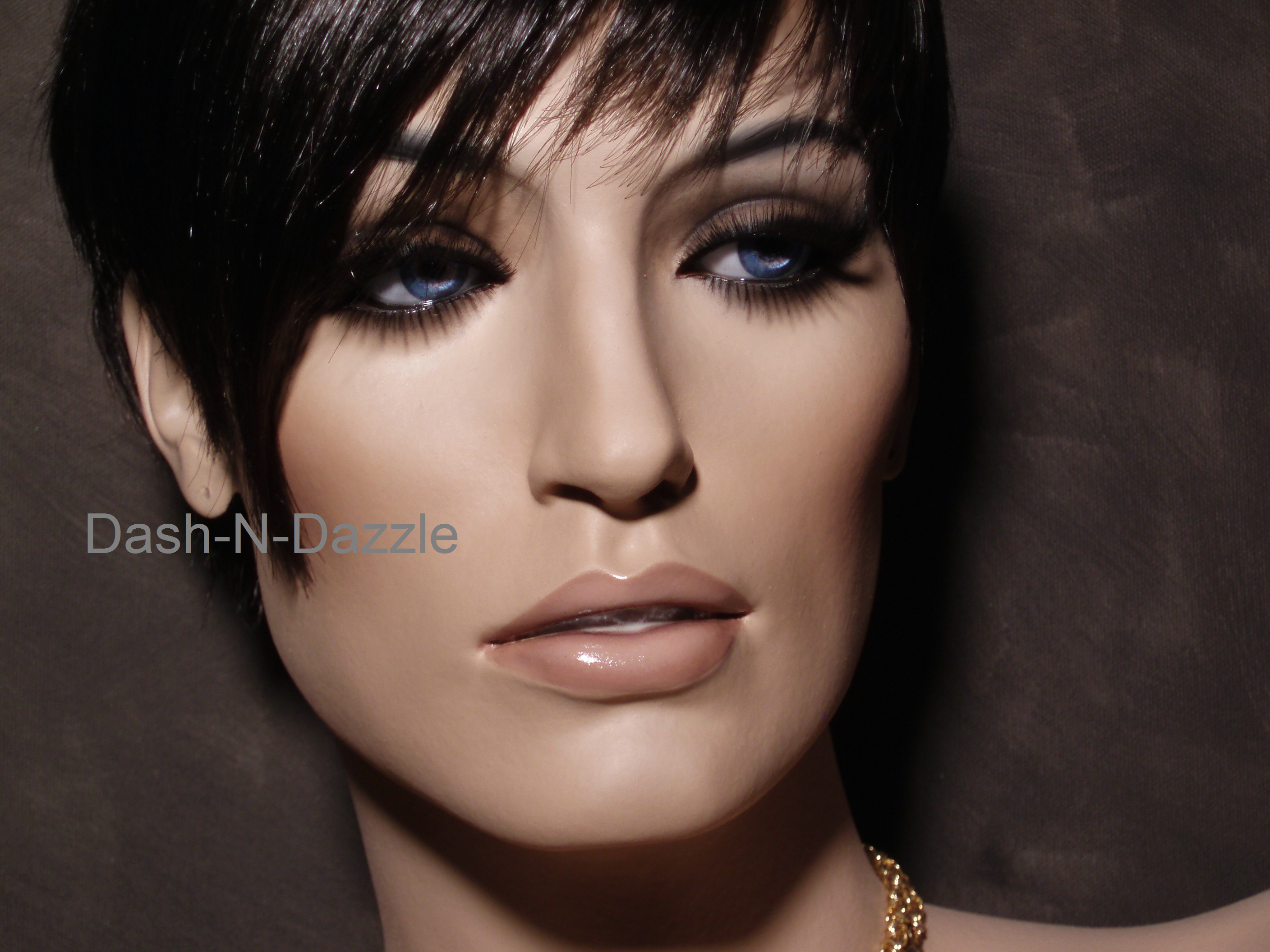 Michelle has a mannequin made after her. Here she is posing with the mannequin.
