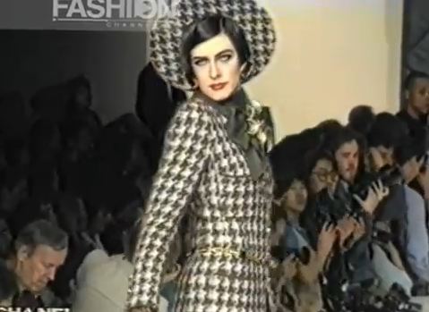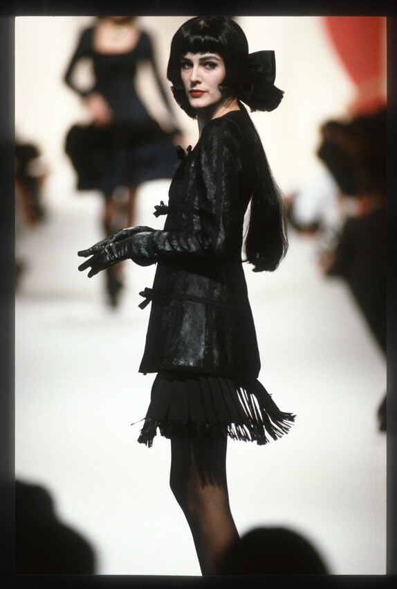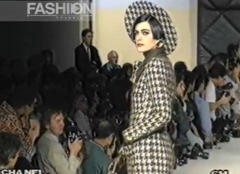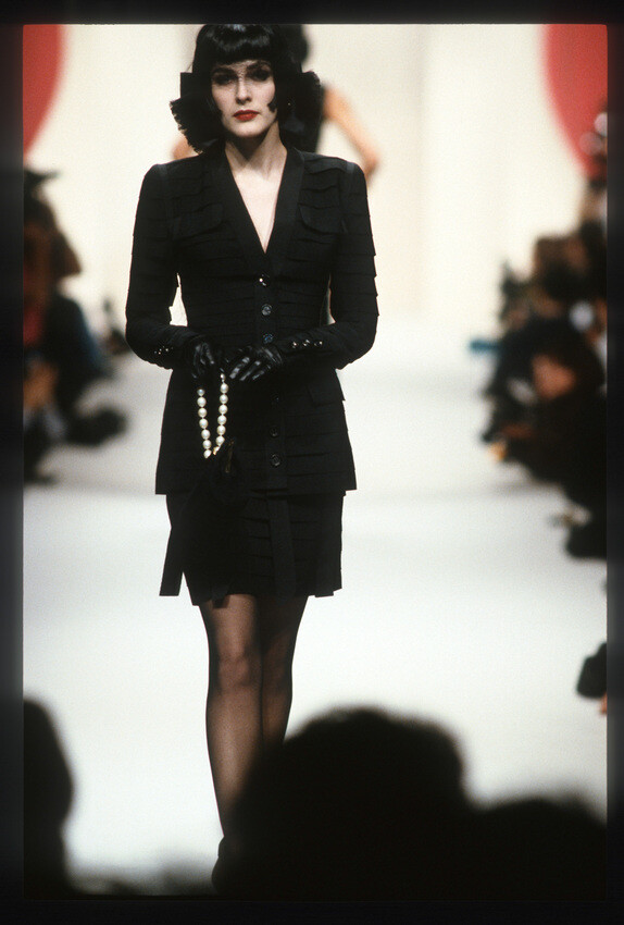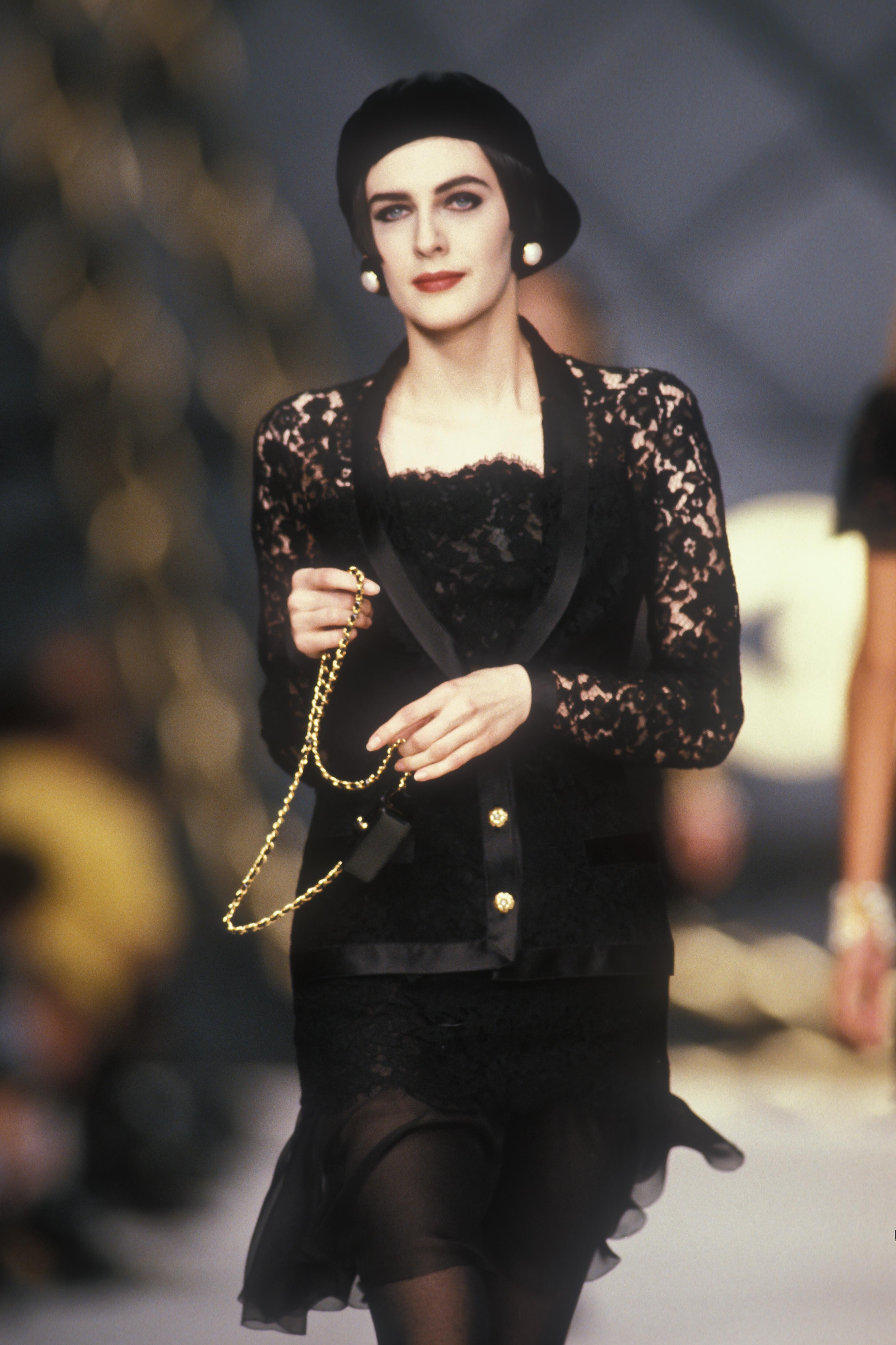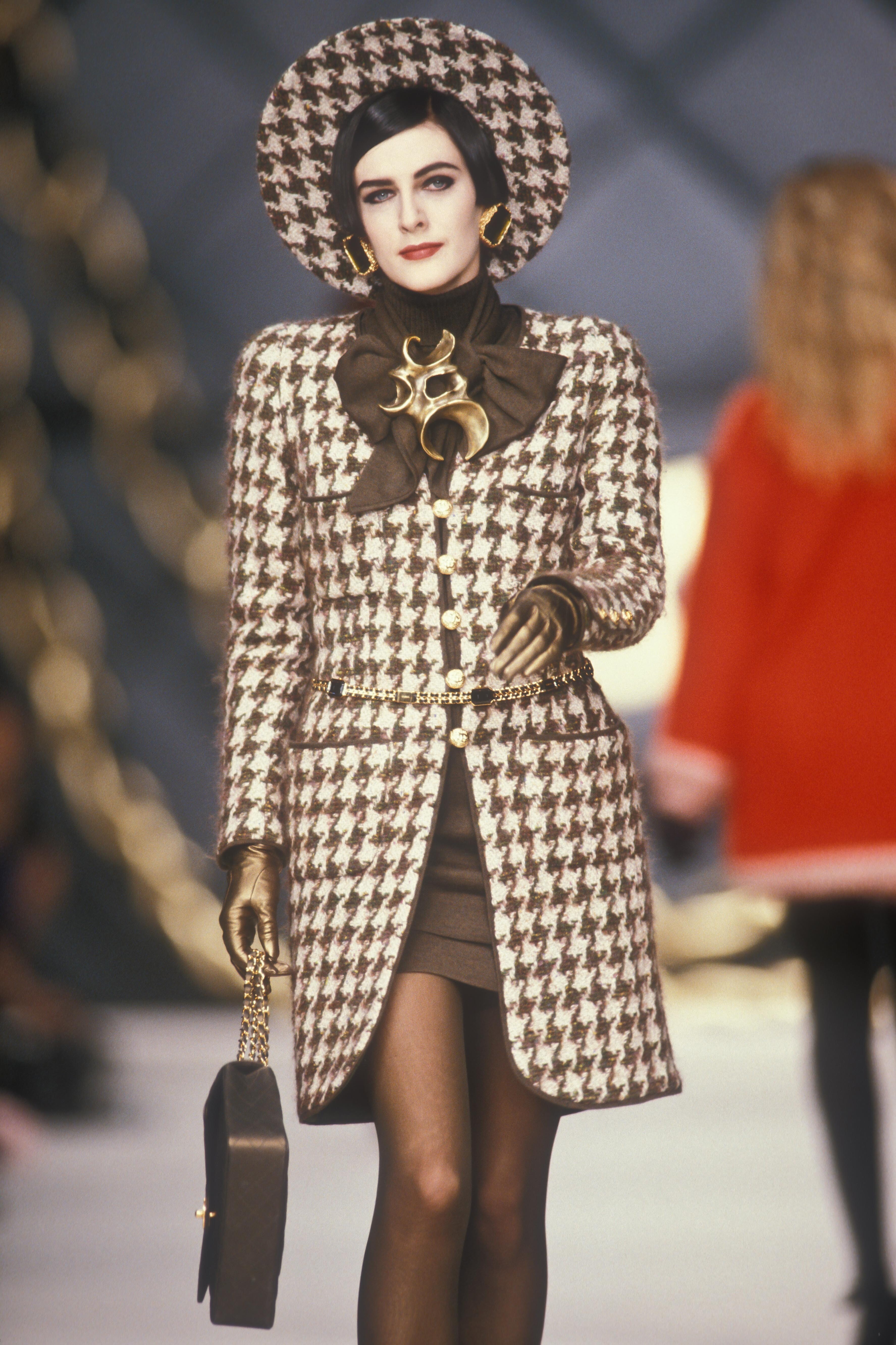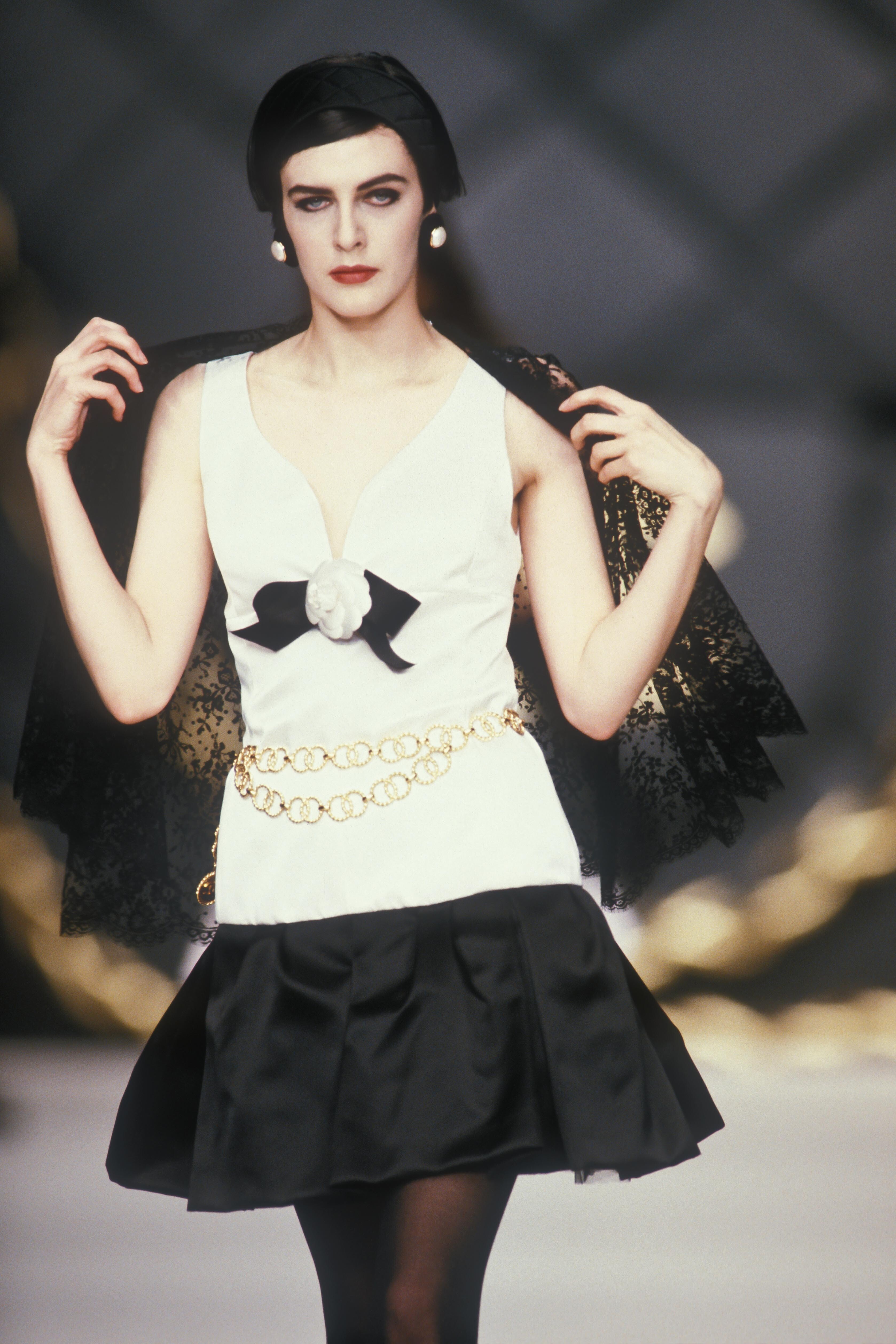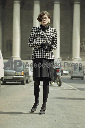 A model presents a black wool-crepe above-the-knee skirt worn with a black and white tweed jacket, a preview of the 1989-90 fall-winter haute couture collection of designer Karl Lagerfeld for Chanel fashion house in Paris, France, July 20, 1989. (AP Photo/Remy de la Mauviniere)