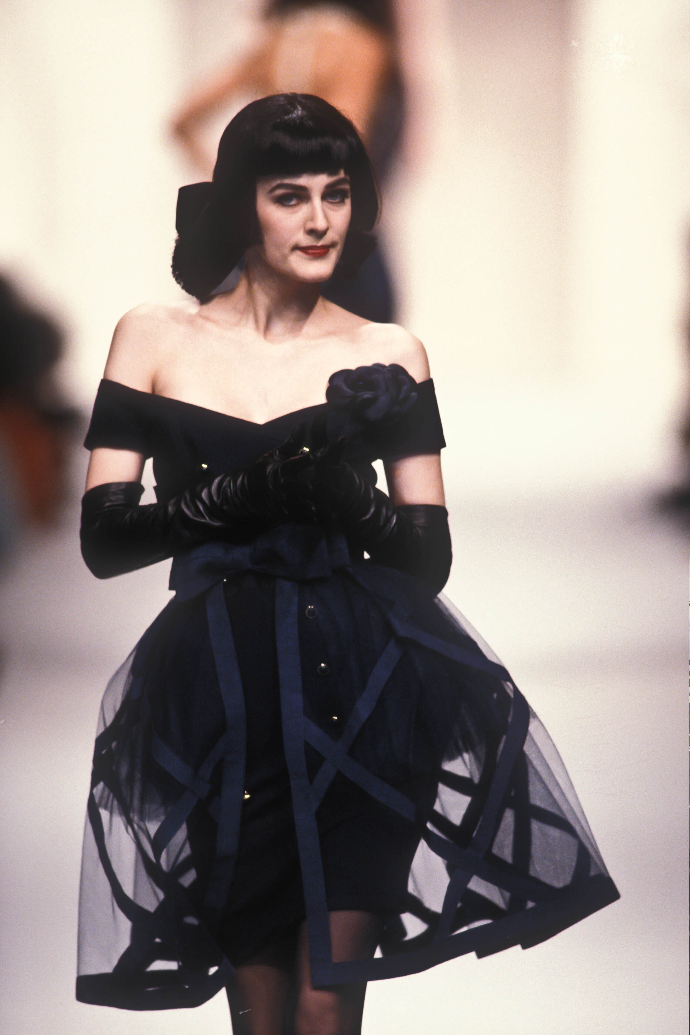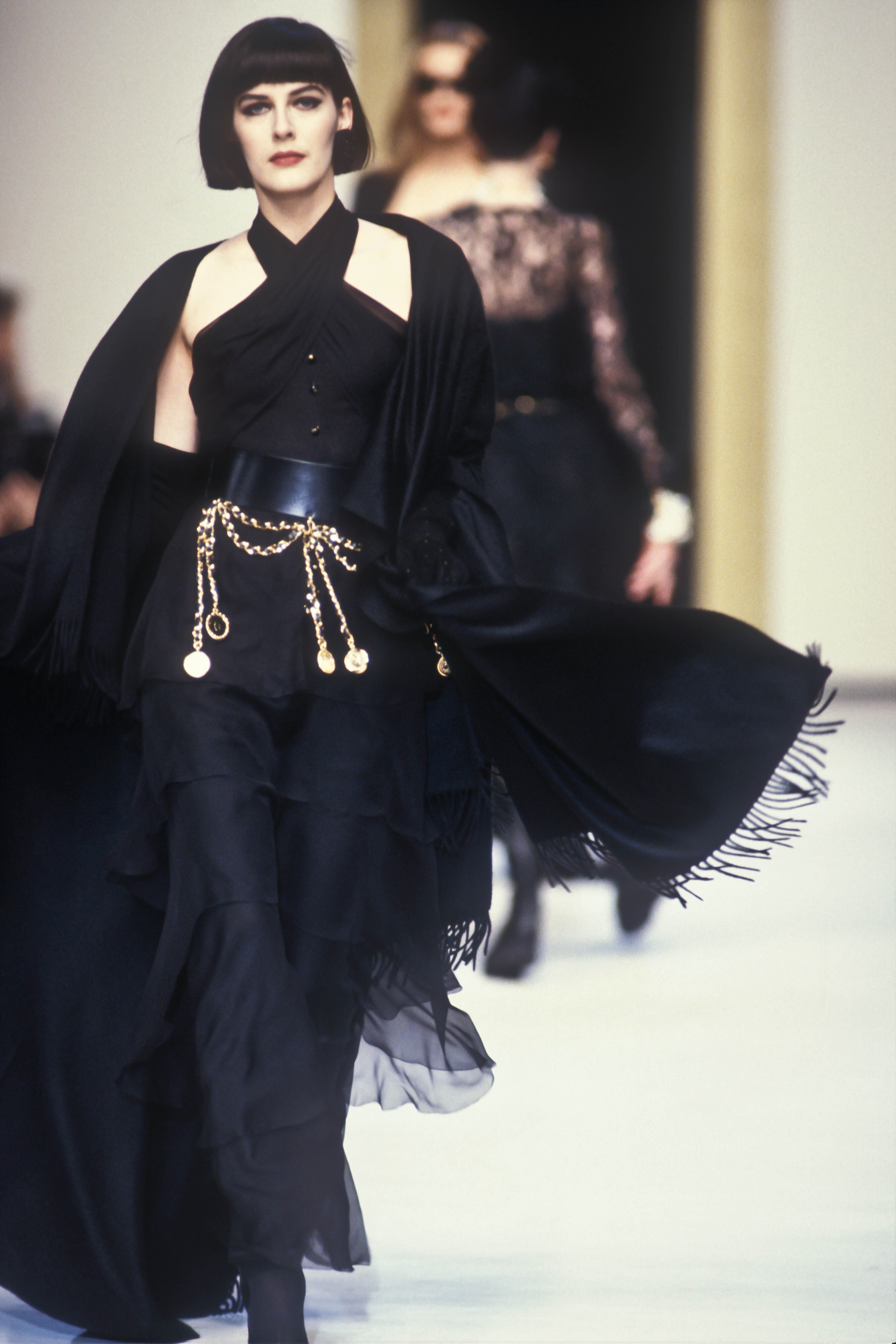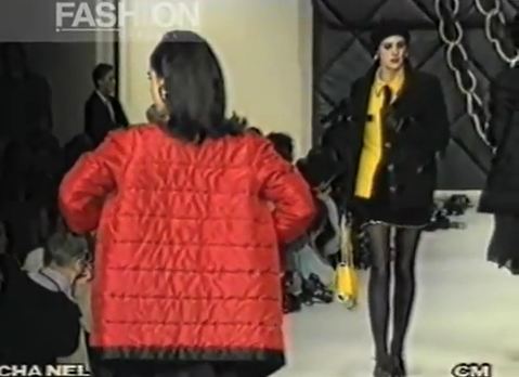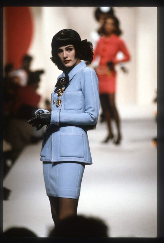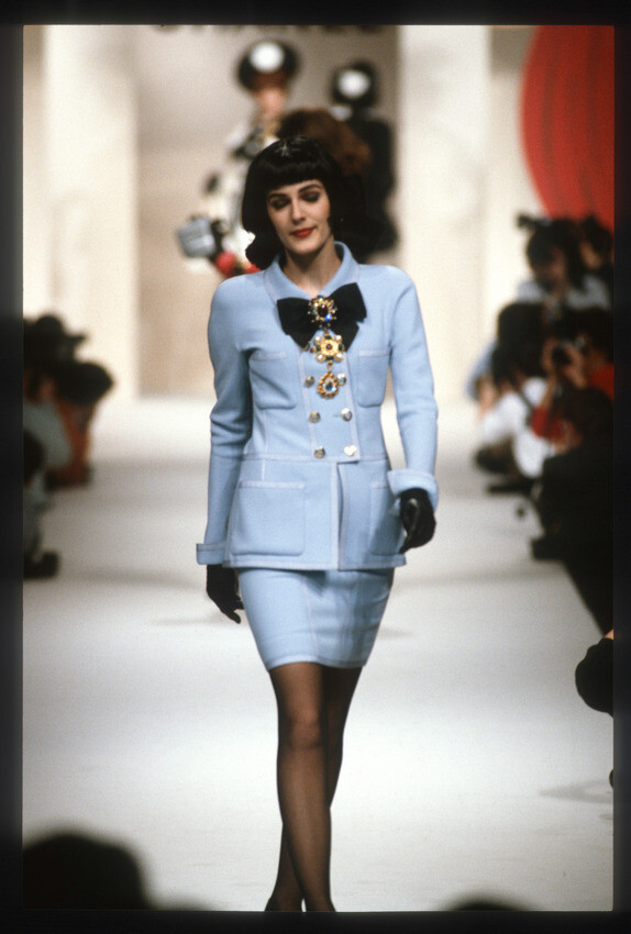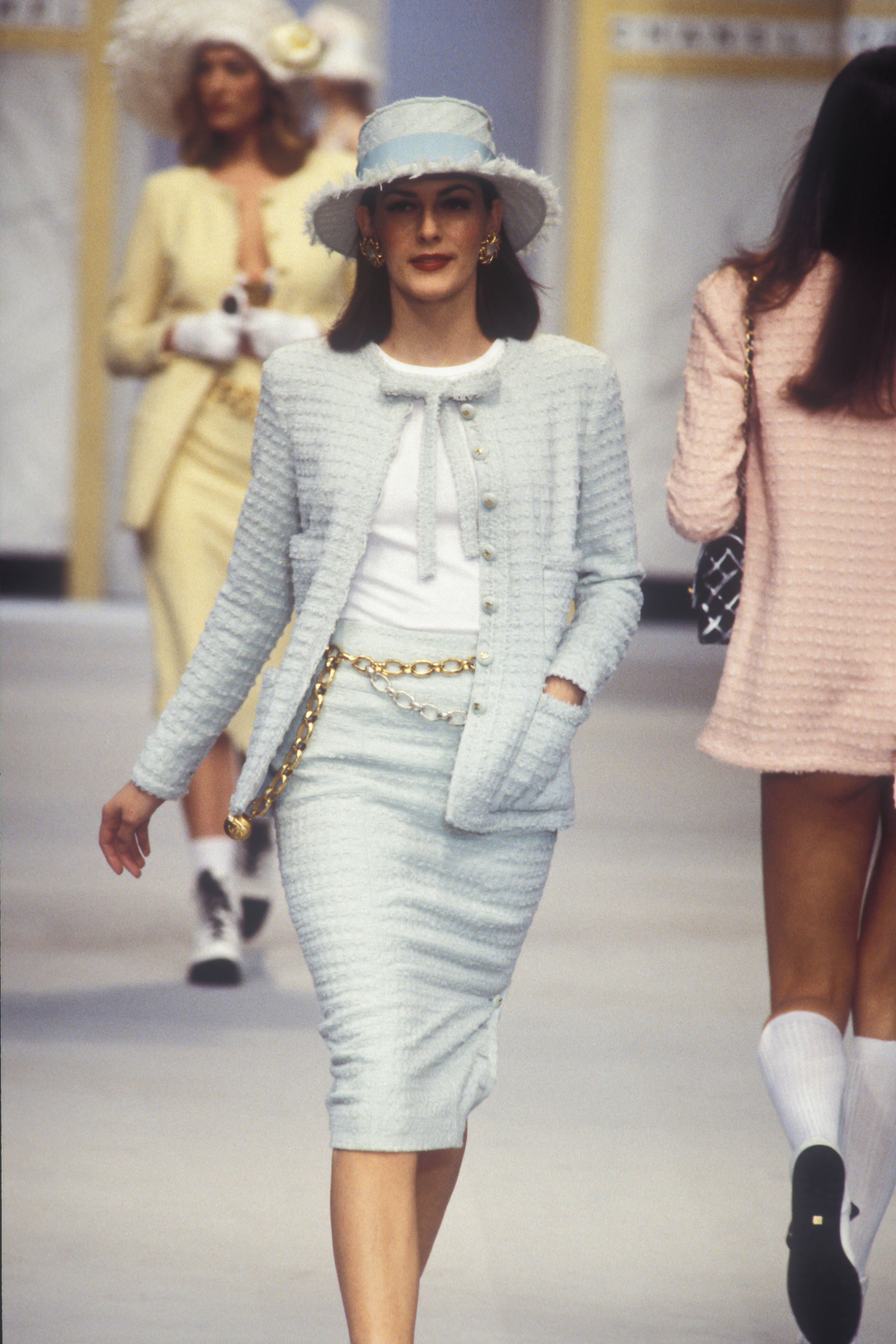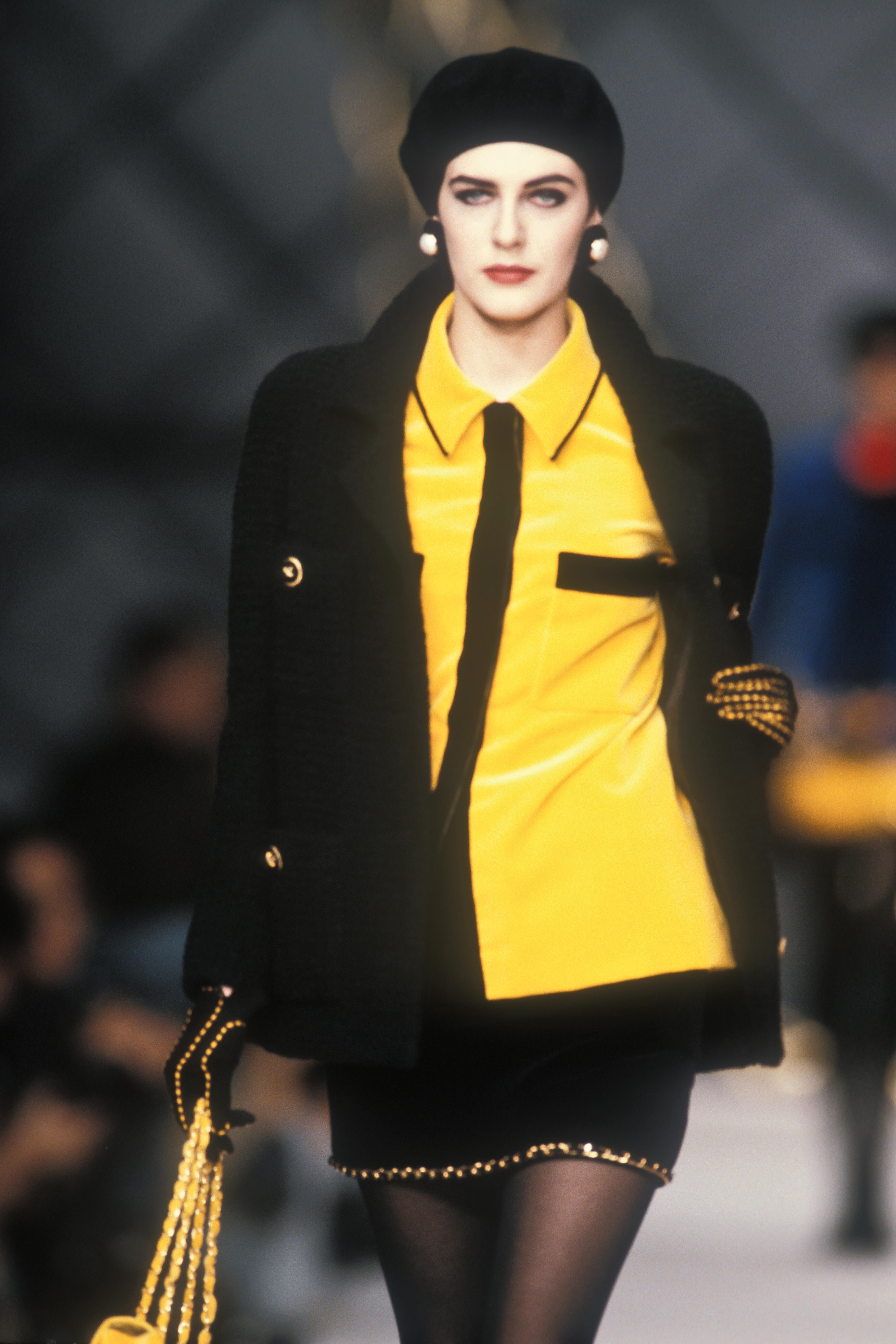A model presents a black wool-crepe above-the-knee skirt worn with a black and white tweed jacket, a preview of the 1989-90 fall-winter haute couture collection of designer Karl Lagerfeld for Chanel fashion house in Paris, France, July 20, 1989. (AP Photo/Remy de la Mauviniere)