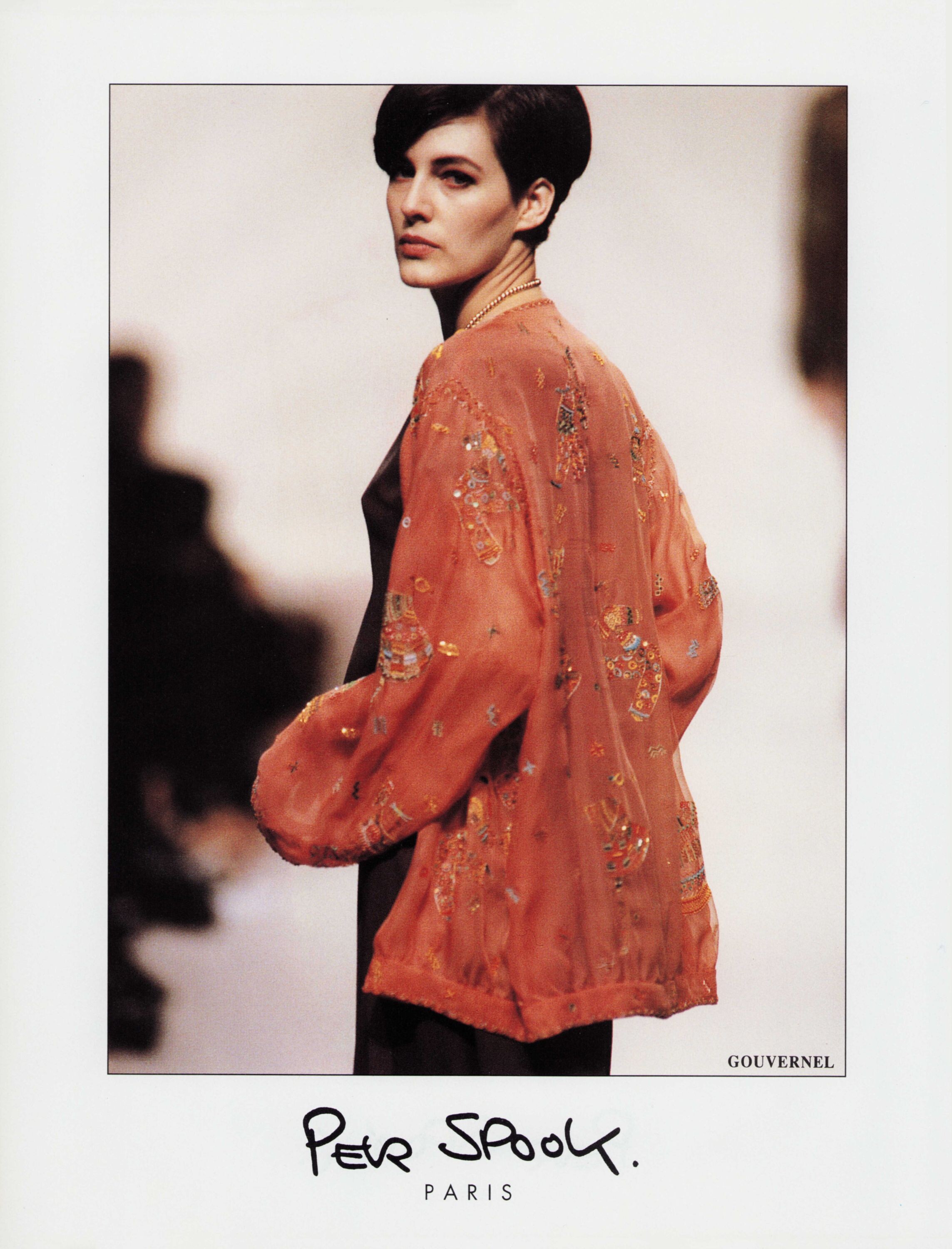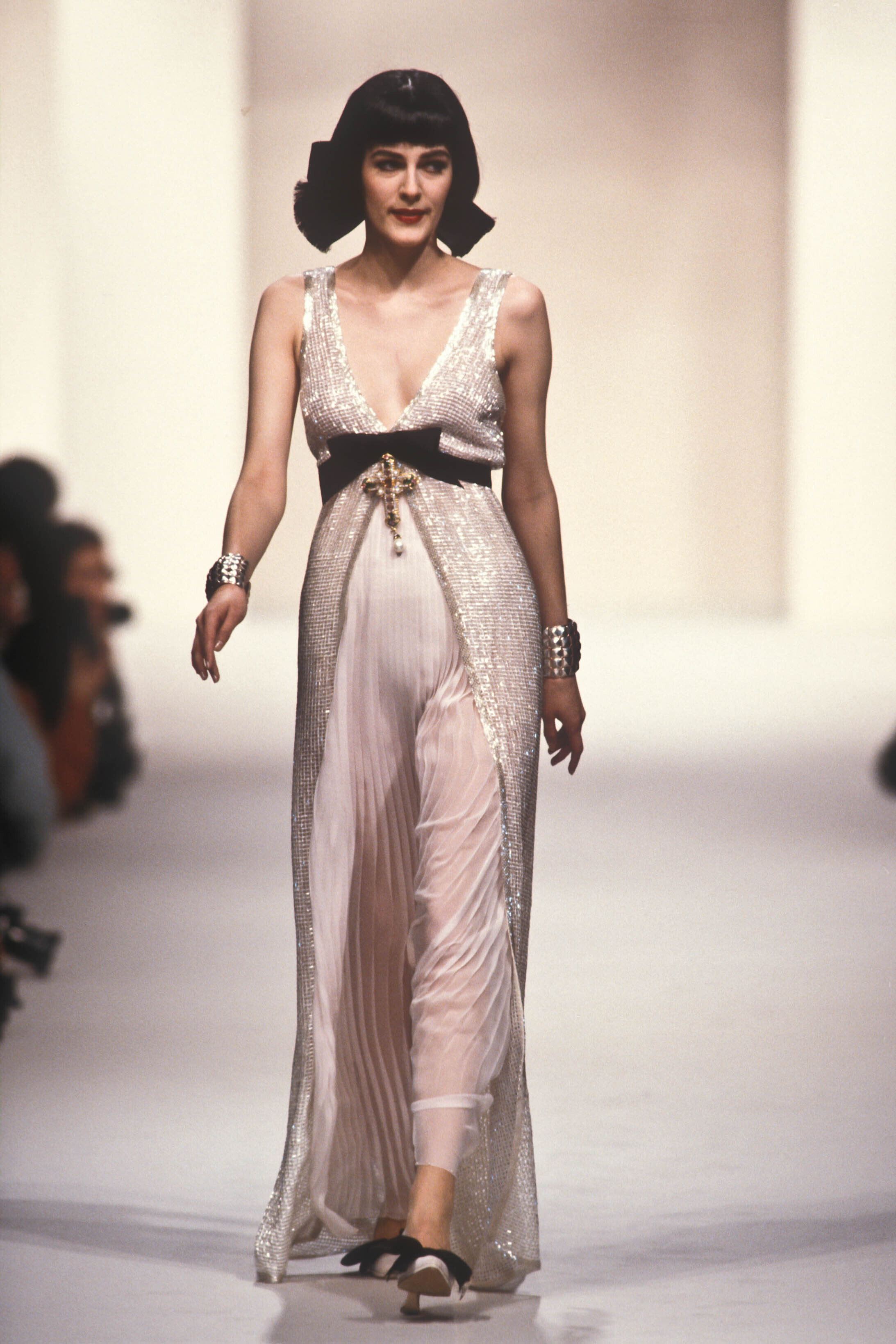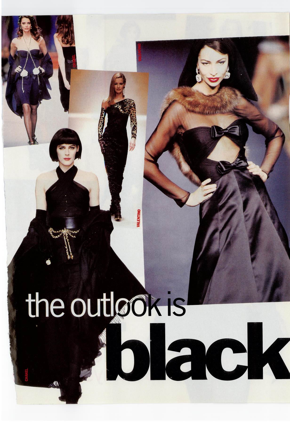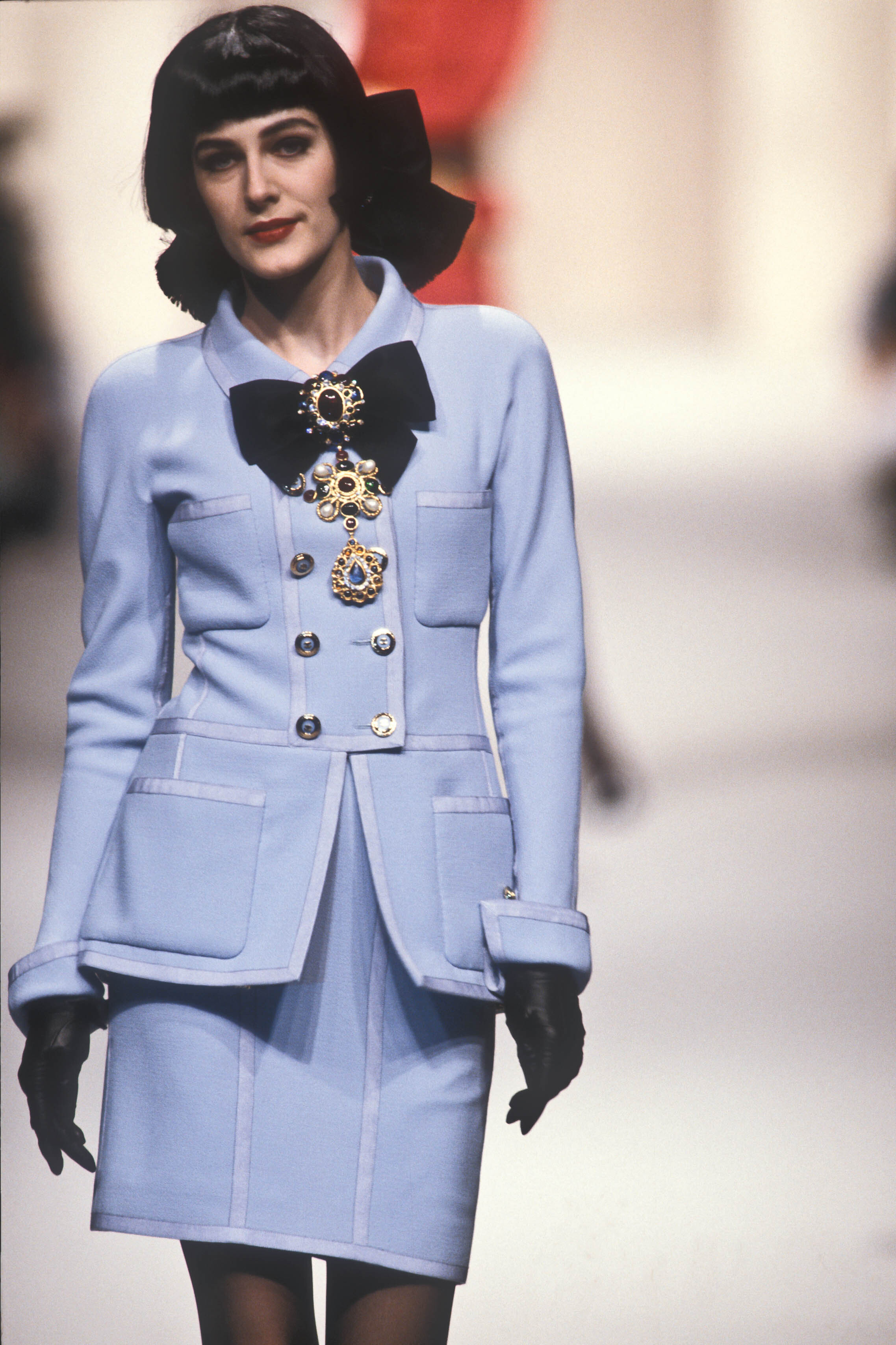 A model presents a black wool-crepe above-the-knee skirt worn with a black and white tweed jacket, a preview of the 1989-90 fall-winter haute couture collection of designer Karl Lagerfeld for Chanel fashion house in Paris, France, July 20, 1989. (AP Photo/Remy de la Mauviniere)