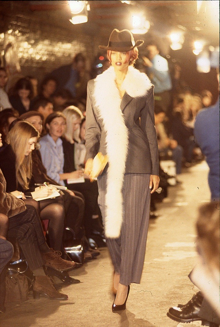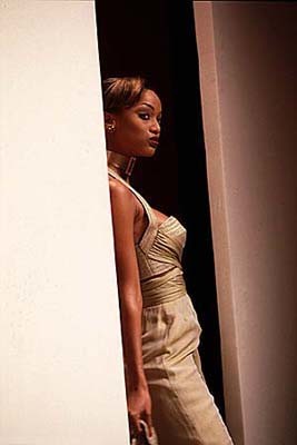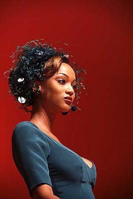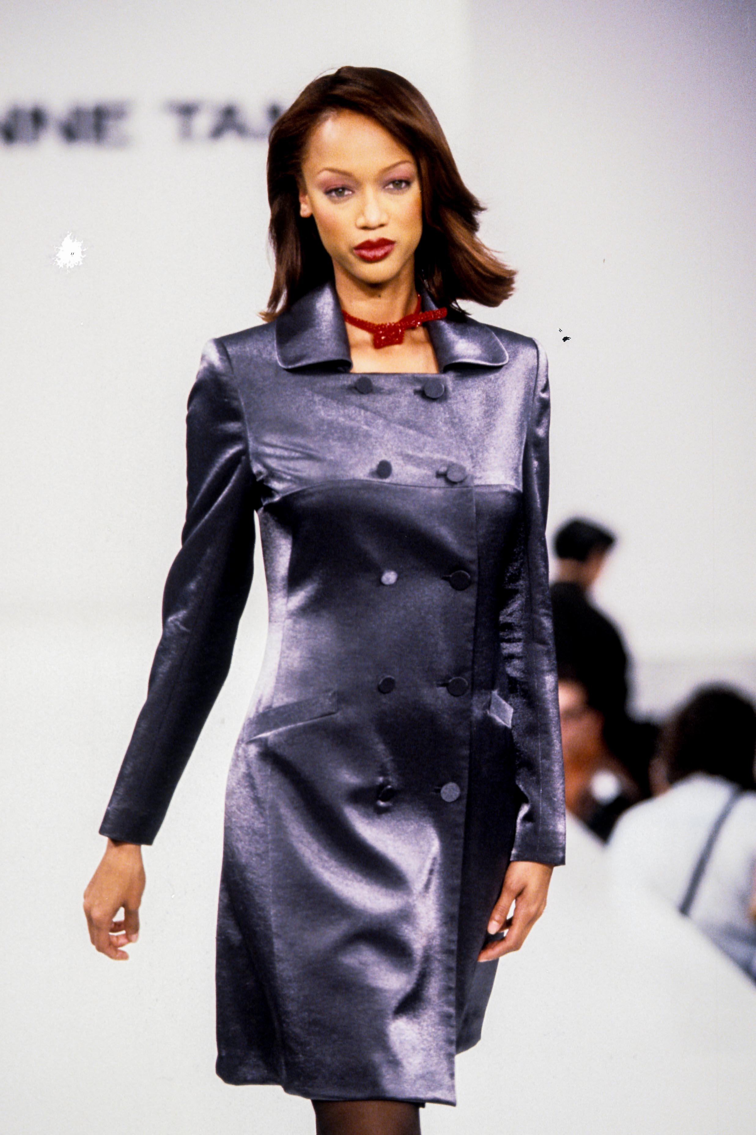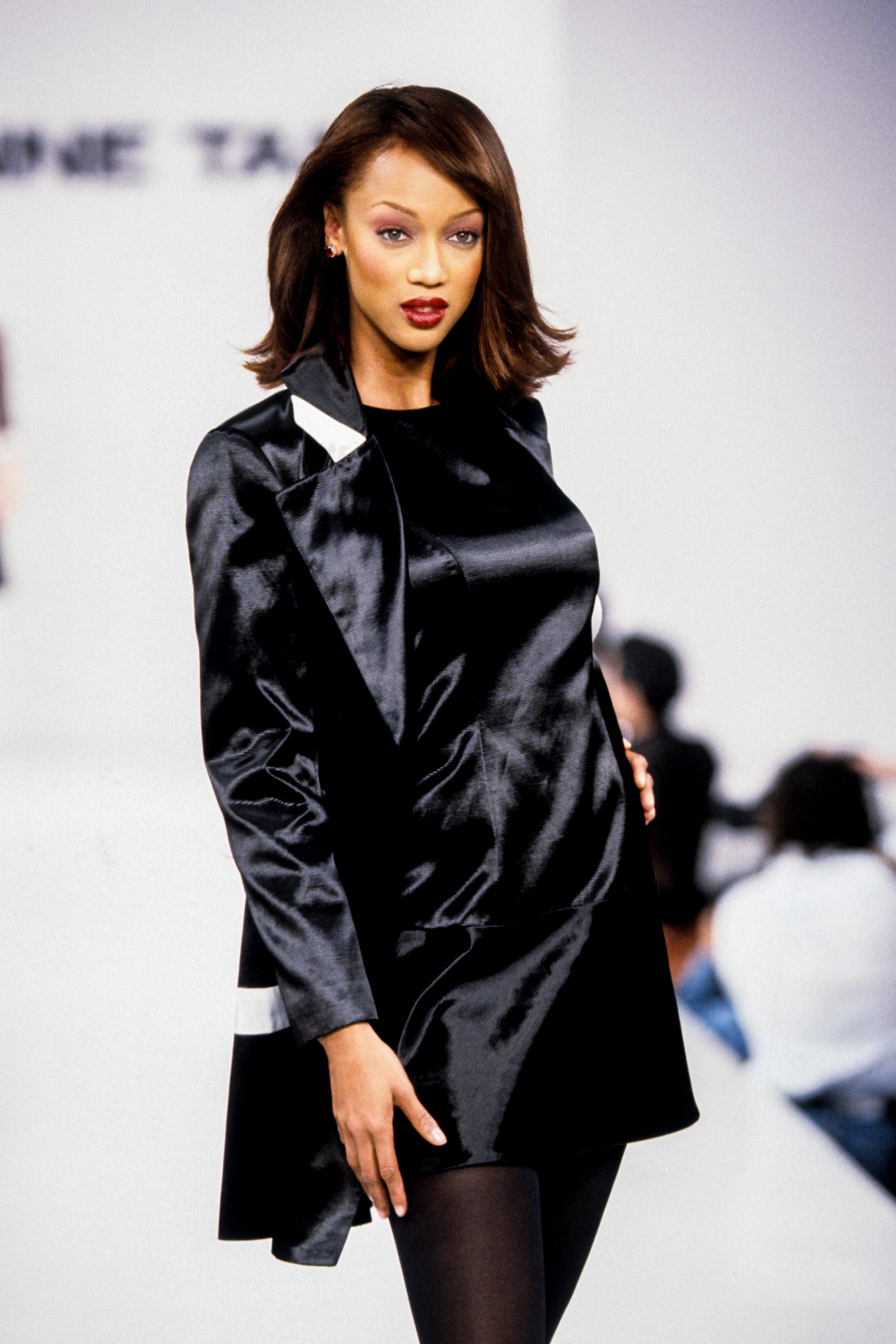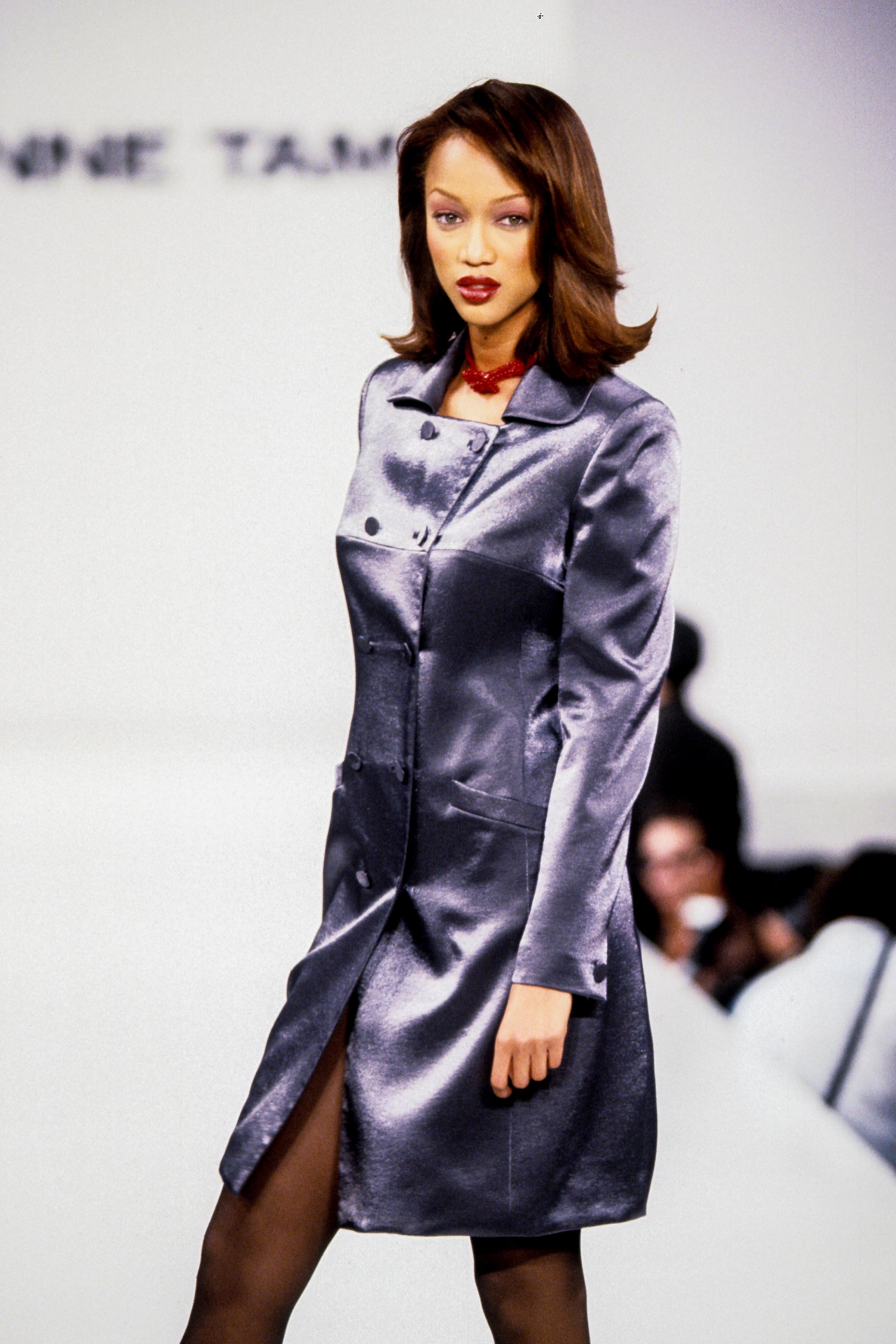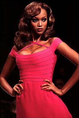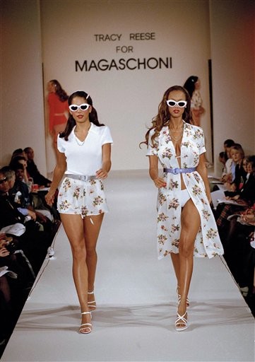 Models Veronica Webb, left, and Tyra Banks present the latest outfits fro designer Tracy Reese for Magaschoni during the showing of their Spring 1995 women's wear collection in New York, Nov. 1, 1994. Veronica wears a white knit v-neck shirt over floral silk shorts and Tyra wears a floral silk dress with belt. (AP Photo/Kathy Willens)
