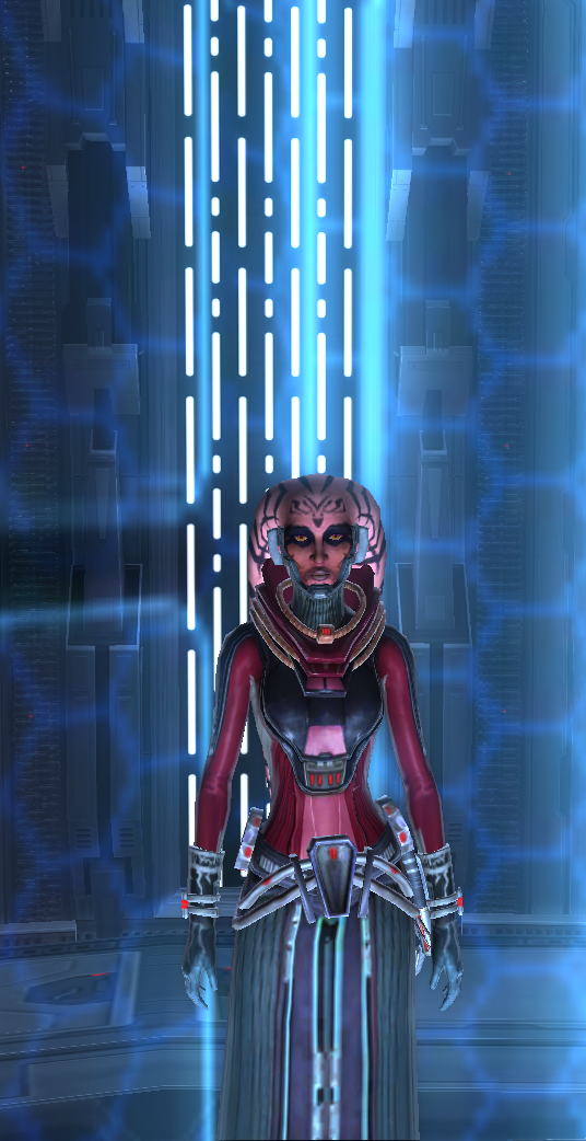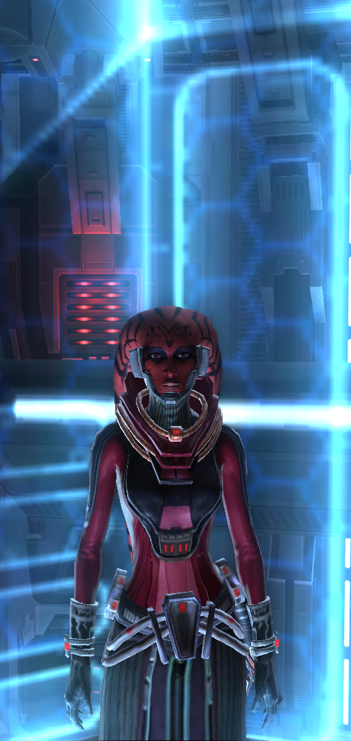 She is supposed to be a lethan(red) but when you get to a new dark side tier, you start to change. For some stupid reason it made my Twi'lek baby pink...(oo scary! ....)