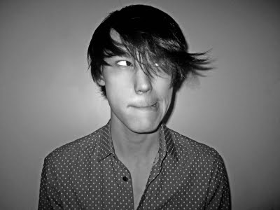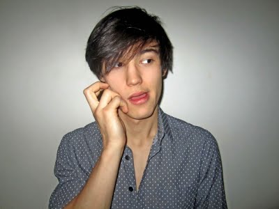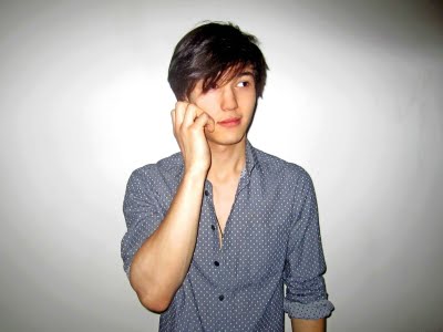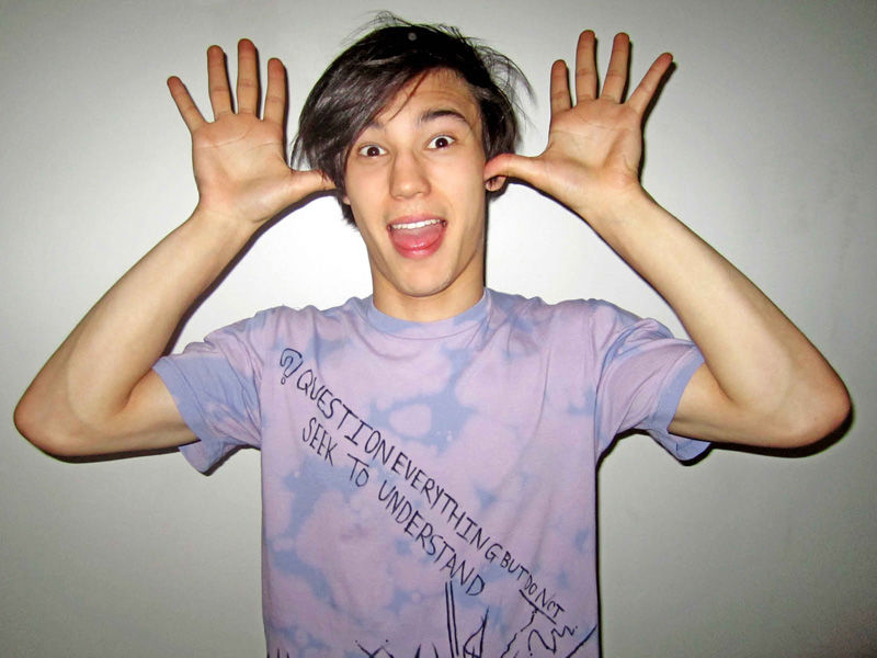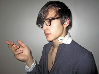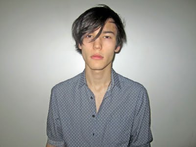 Clothing: grey dotted print dress shirt by Timo Weiland; color dye t-shirt by American Apparel, customized and drawn by Chris Colton; necklace & jeans, Chris's own
