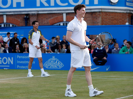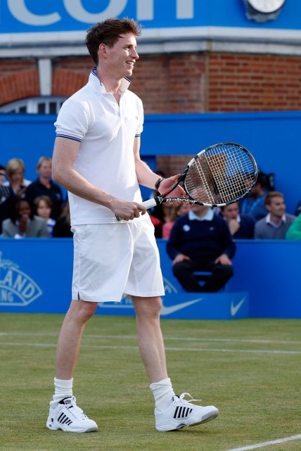 The actor showed off his ball skills during a tournament at Queen's Tennis Club, partnering sporting ace Tim Henman for one of a series of Rally Against Cancer games.