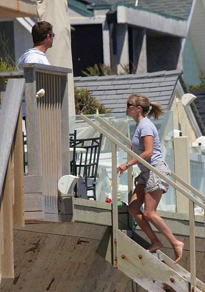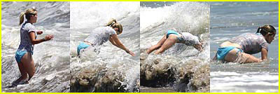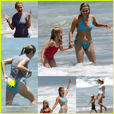Malibu, CA :: Reese Witherspoon enjoyed the beautiful weather this weekend with her daughter Ava and son Deacon. Although Reese has vowed never to strip on-screen again because she has "cellulite and saggy boobs," she wore a bikini to the beach and almost lost her bottom to a crashing wave! Reese's full quote to Vanity Fair: "I have cellulite. I have stretch marks.My breasts are not what they were before I breast-fed two children. If I ever have to do a bikini scene, it will become a kaftan scene... I'm trying to make movies that have nothing to do with my body. It makes me nervous when I see a woman with her midriff showing. When I was growing up, I wasn't allowed to wear bikinis because it was inappropriate."