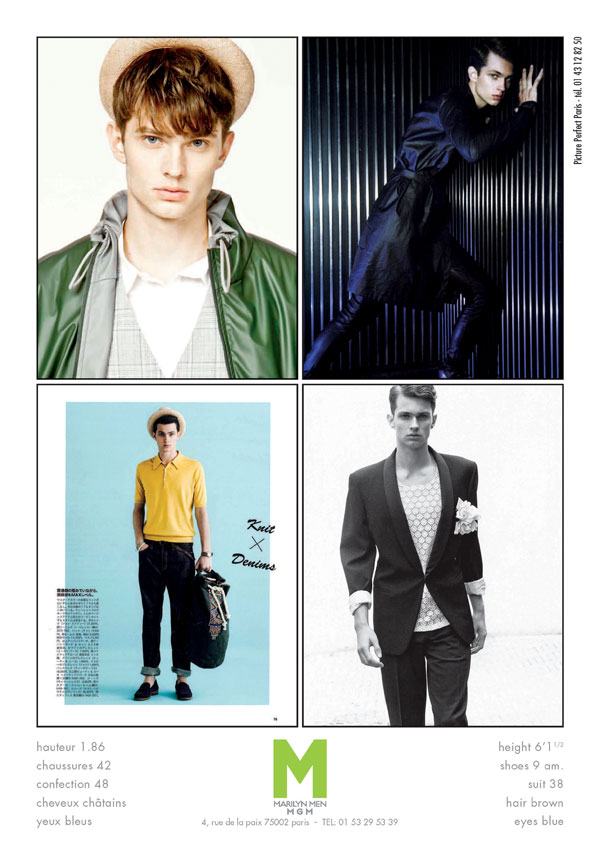 Agencies: New York Model Management (New York), MGM (Paris), Elite (Milan), 1st Option Mgmt (Copenhagen), Jill (Antwerp)