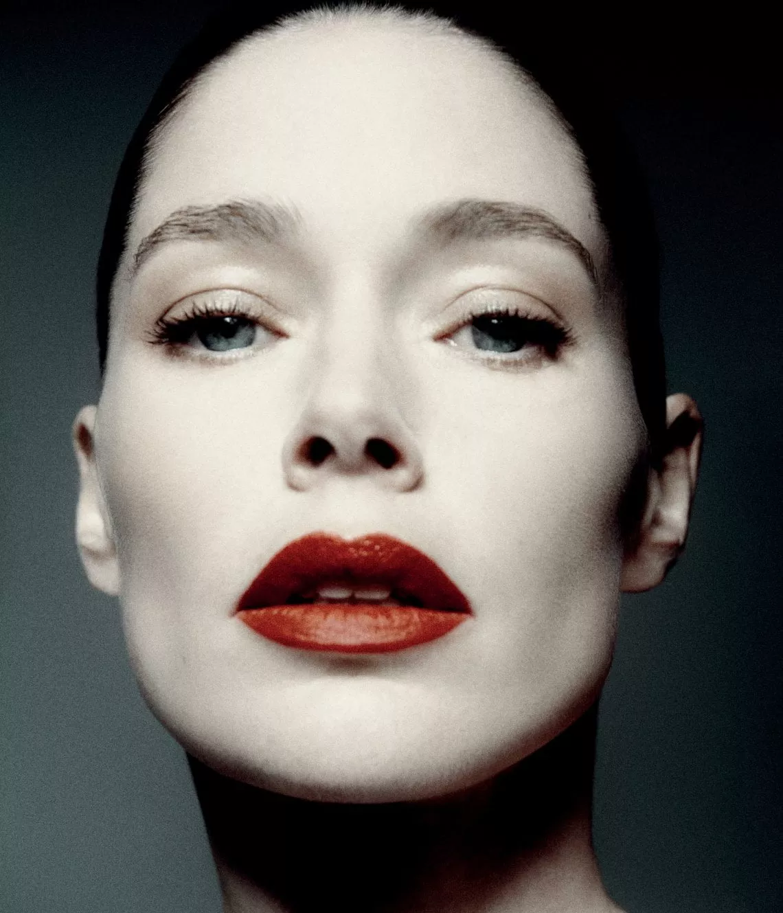 She looks into the camera with a intense gaze in her eyes, good lighting and makeup, good art direction and photography, styling, etc.