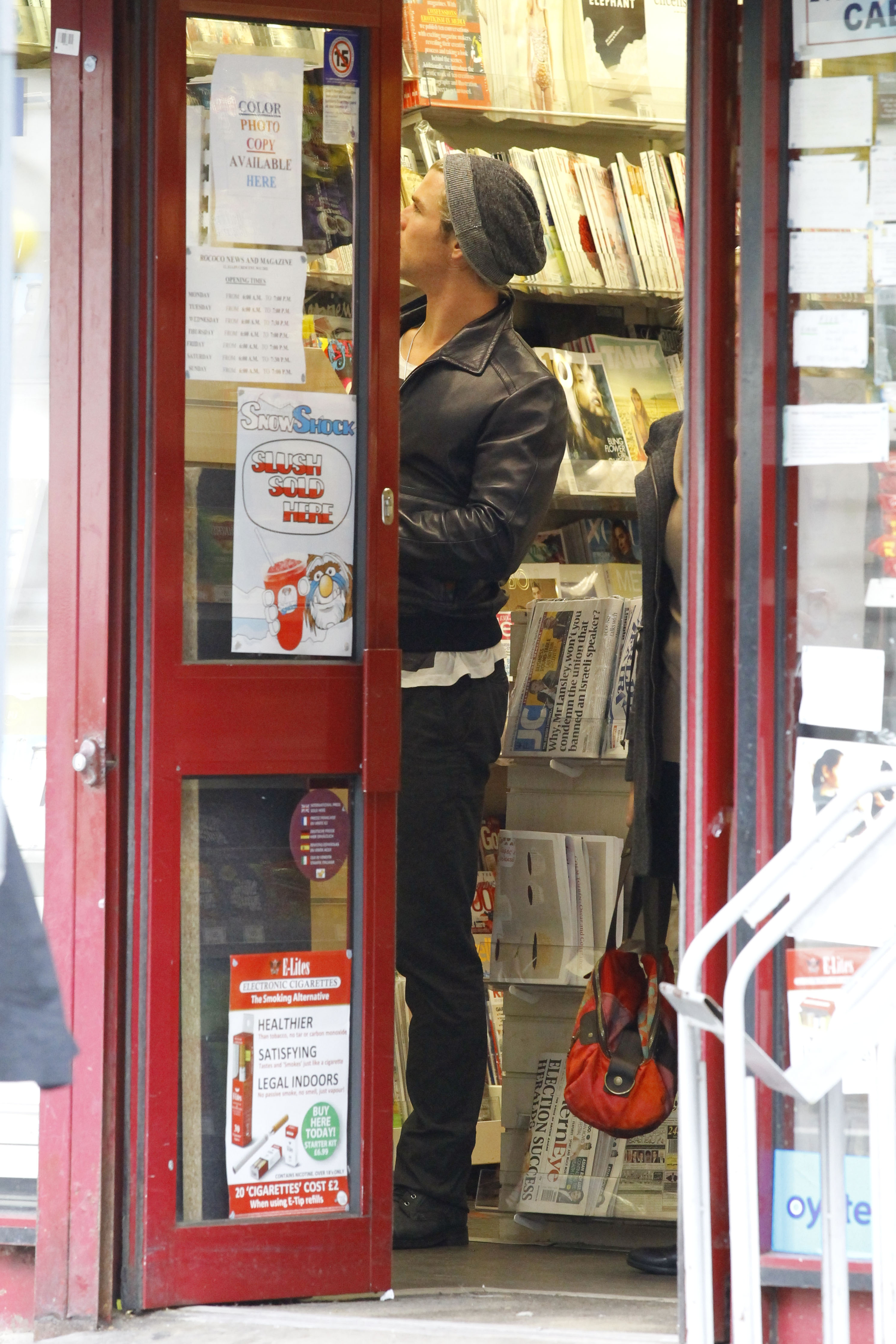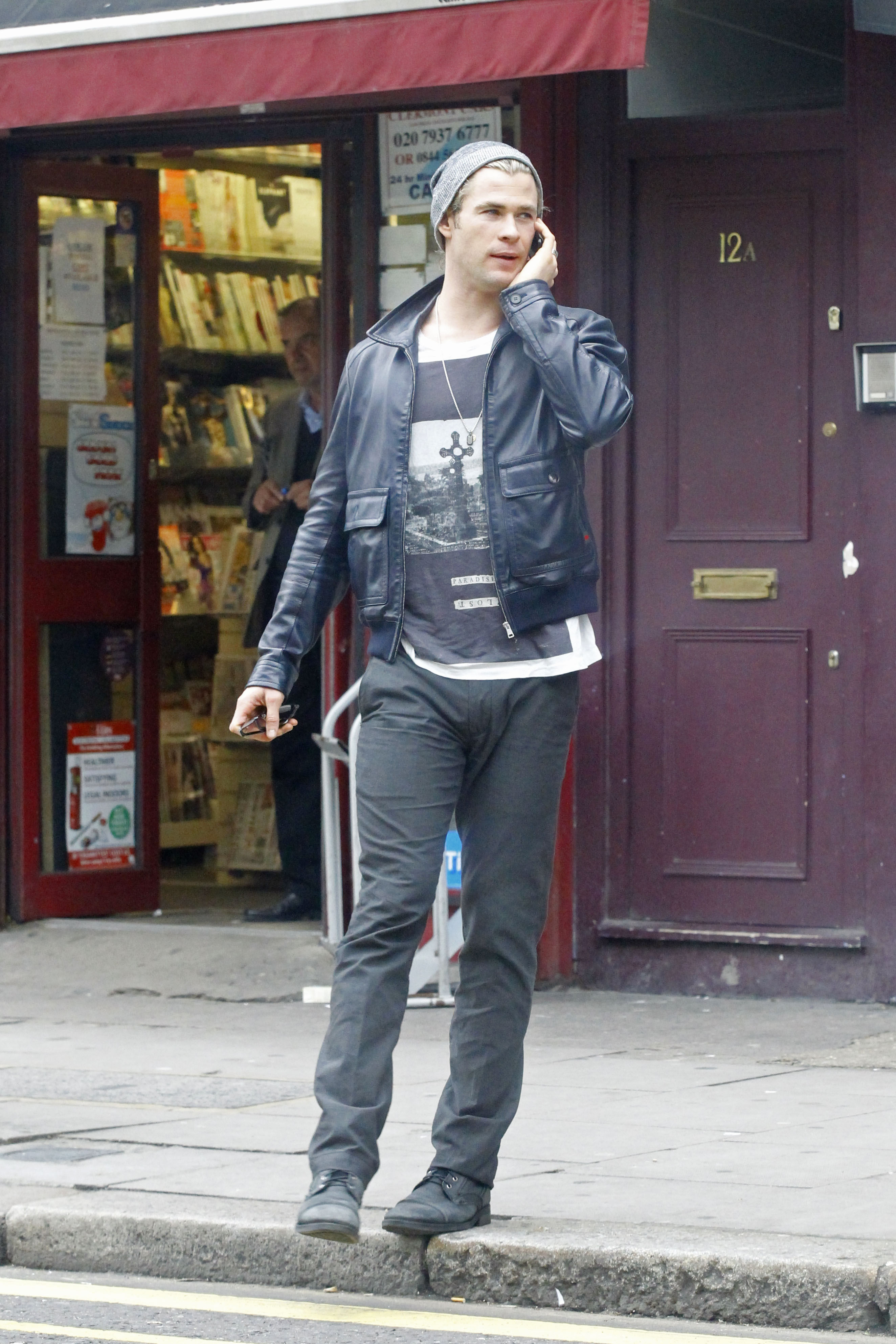 Chris Hemsworth chats on his cell phone as he exits a newsstand on Thursday (May 10) in London, England.