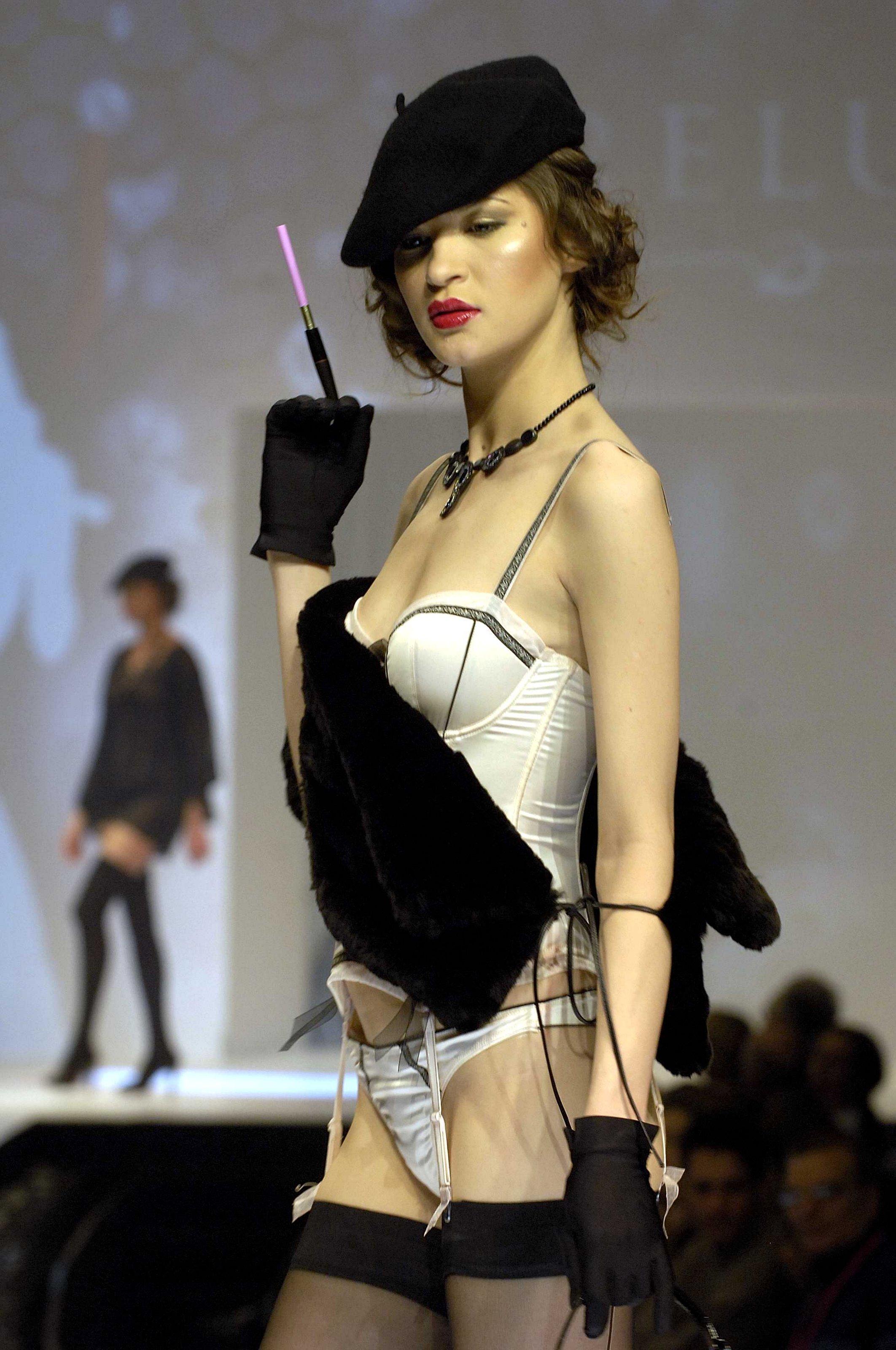 Who is the girl in the red stockings and bra?