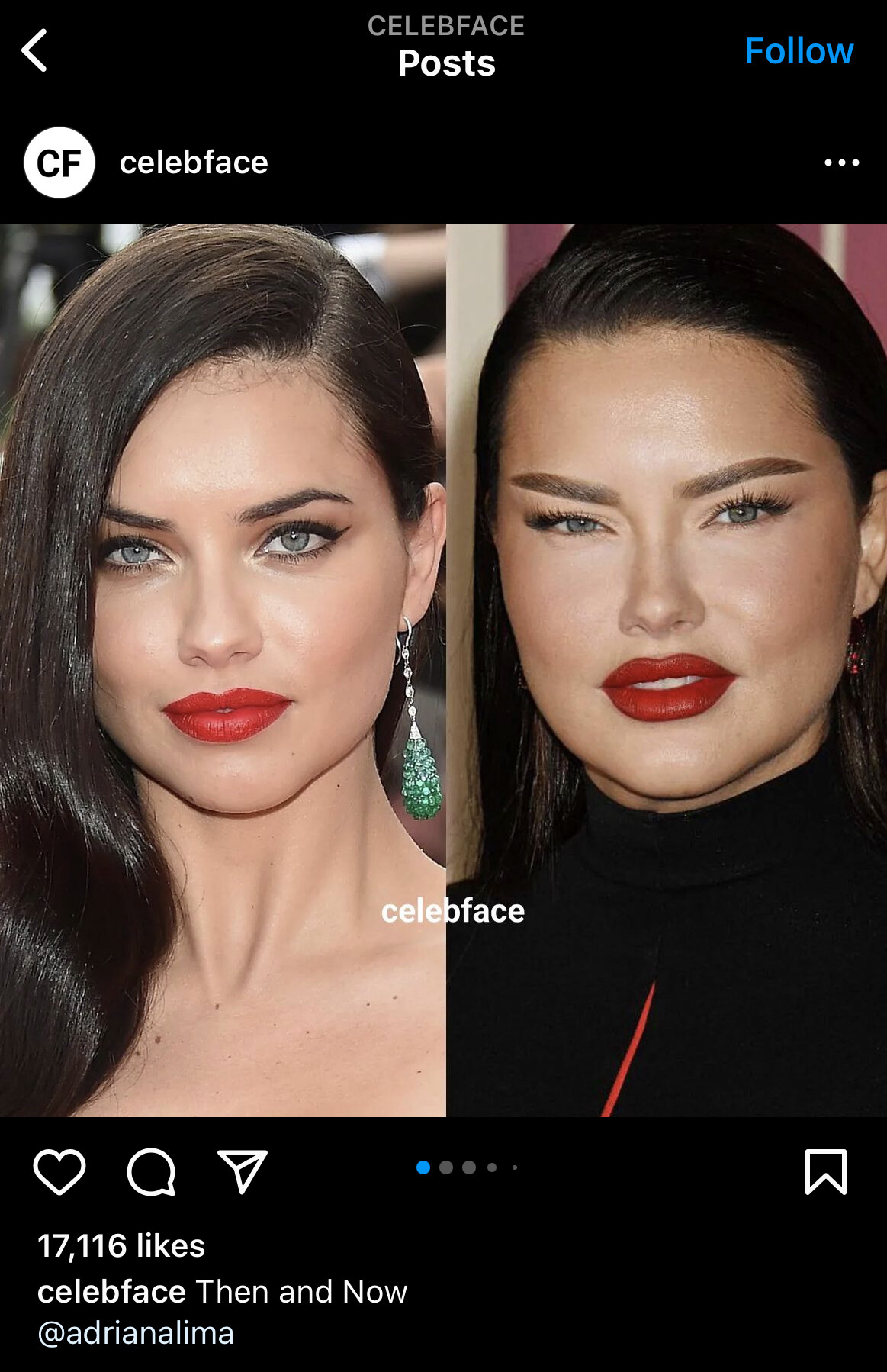 This is a shame. I am starting to understand the people who were afraid for Adriana moving to a place like LA. Whether she looks like this because she did something stupid to her face or she looks like this because she insists on using a makeup artist who dramatically changes her natural features, either way she is agreeing to things that make her look outstandingly different. She is approving looking dramatically different. And for whatever reason, she tends to back away from looks where she looks more like herself. Like she even tends to post the terrible looks rather than post the lighter looks/looks where we can actually recognize her