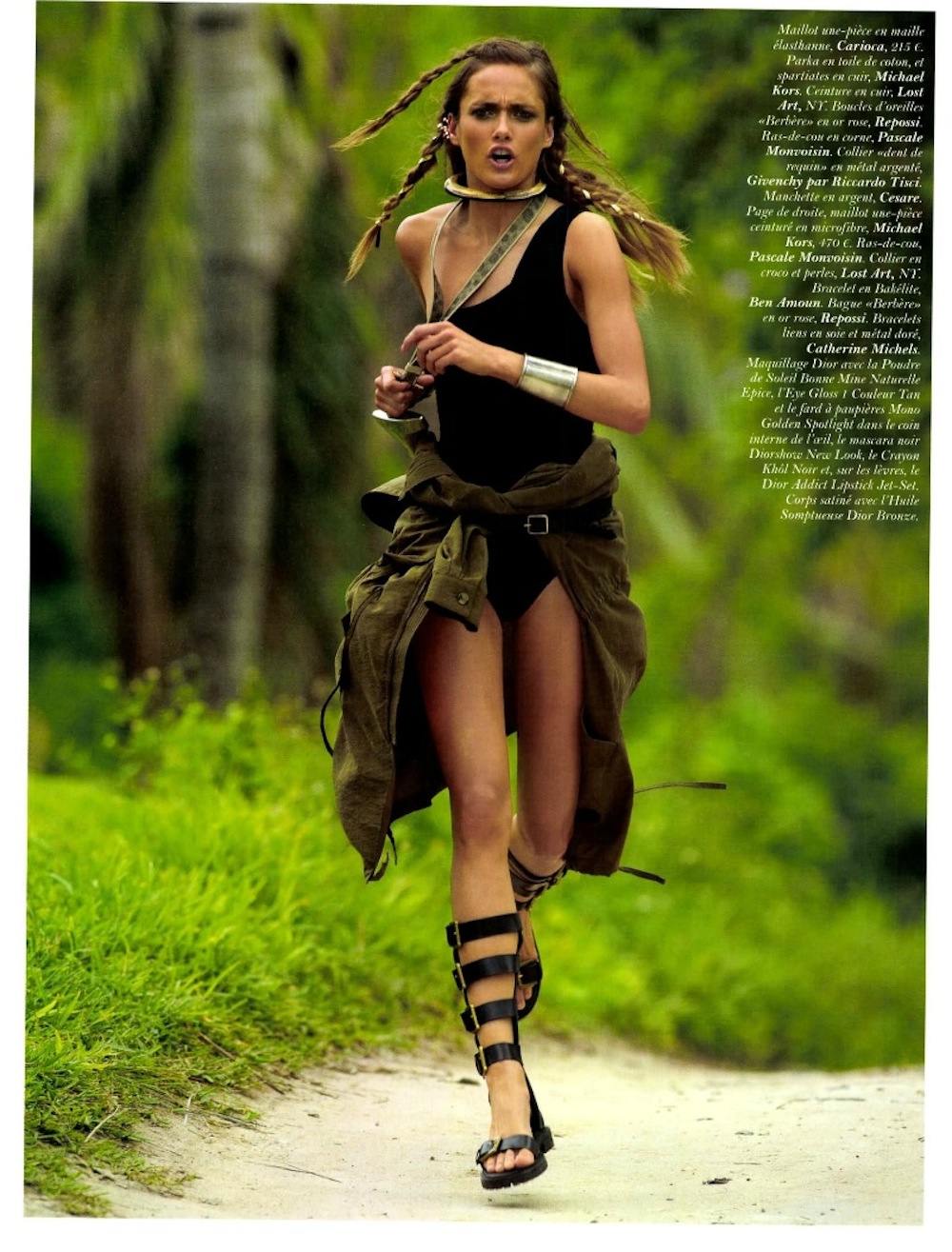 Elle France August 5th, 1985 "Army look: les baroudeuses romantiques" Model: Cecilia Chancellor Photographer: Hans Feurer Stylist: Caroline Baker