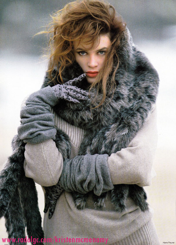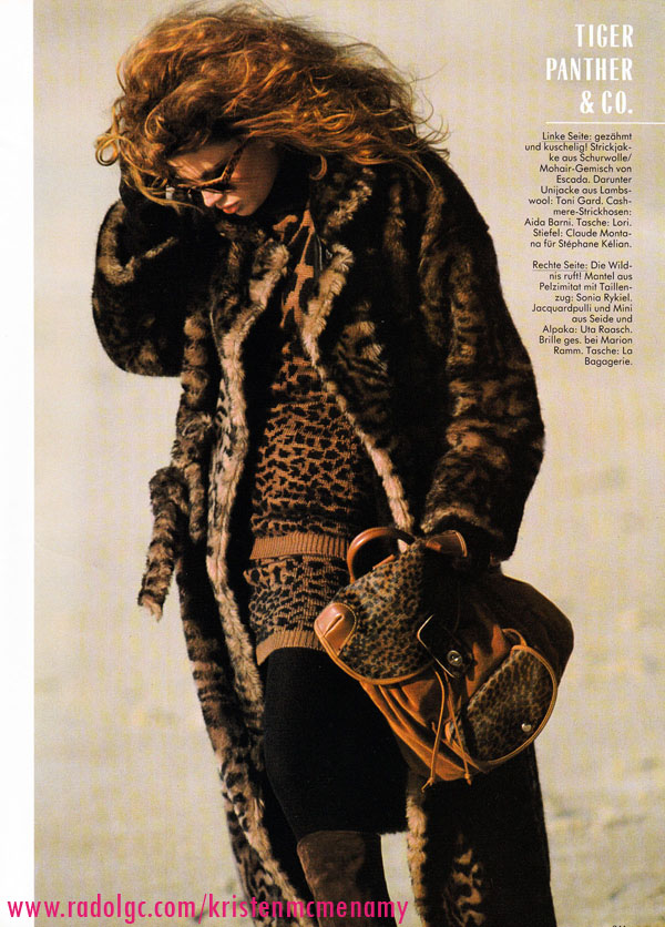 Vogue Germany August 1987 "Tiger Panther & Co." Model: Kristen McMenamy Photographer: Hans Feurer Hair: Mark Garrison Makeup: Brigitte Reiss-Andersen