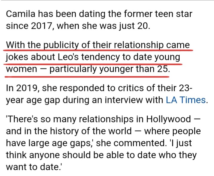 In 2019, Camila went off on social media after being called out about the 22-year age gap between her and Leo. She posted a photo of Humphrey Bogart and Lauren Bacall with the caption "a love like this." Humphrey and Lauren had a 25-year age difference.