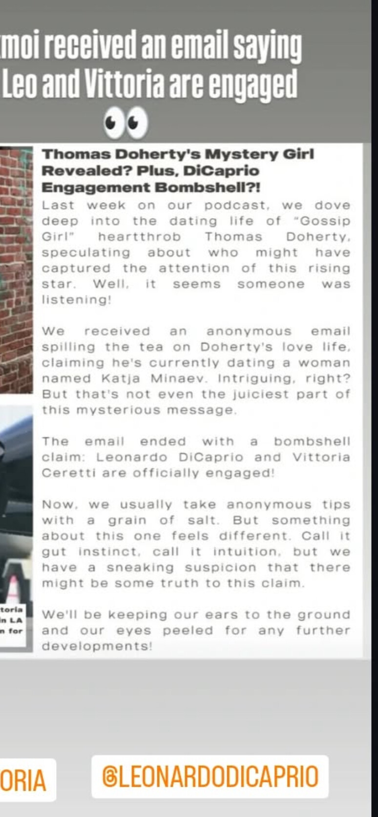 Vittoria came from Richie Akiva as did Camila Morrone and most of the others all the way back to Gisele Bundchen; there is nothing unique about this relationship. Leo is aging out, so who knows how much longer he will do these PR relationships. Most of his recent DM stories do not have that many comments.