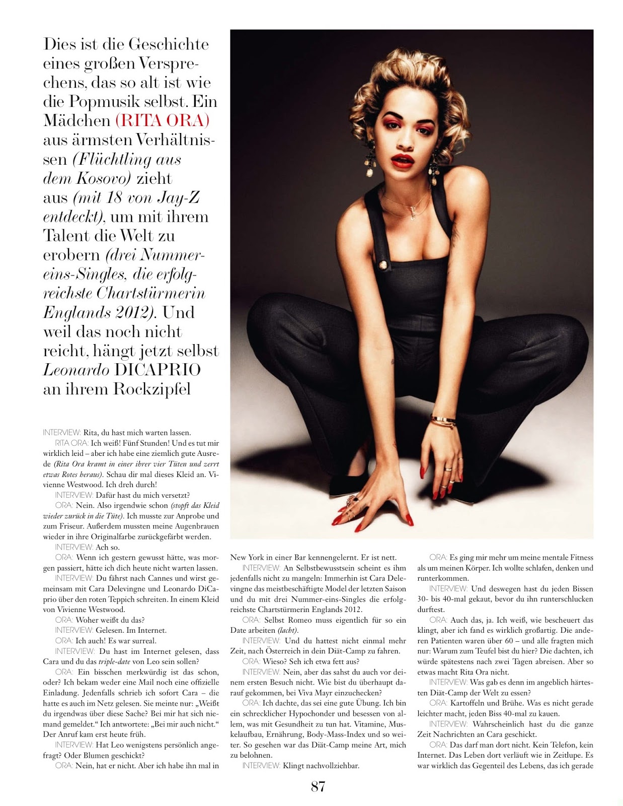 She heard about the rumor - read it - in the internet and called Cara, because she didnt know anything about that. Cara read it in the internet too and didnt know anything about that too. Nobody contacted them because of that. The call came at the morning of the interview. Leo didnt call personally or sended flowers. But she met him once in a bar in New York. He is nice. The interviewer says that Leo must have enough self-confidence because he asked the busiest model of the last season and a singer with three number one Singles. Her anwser: Actually even Romeo has to work for such a date. lol