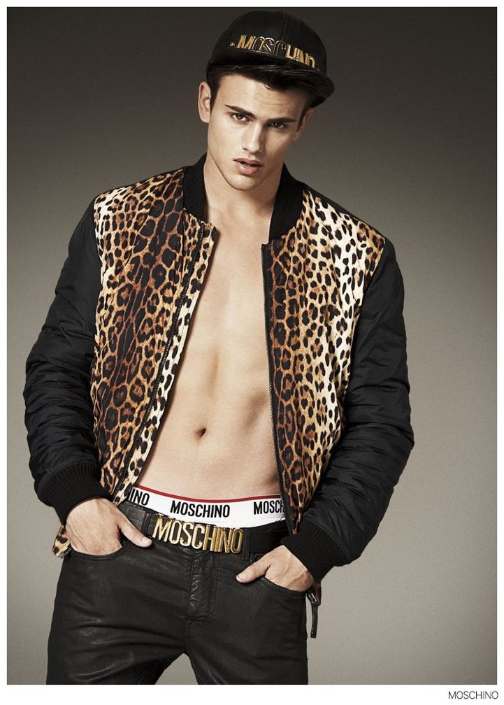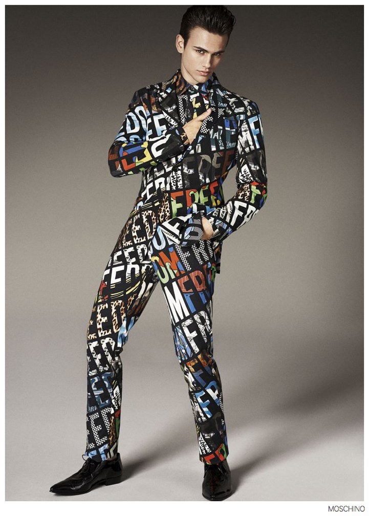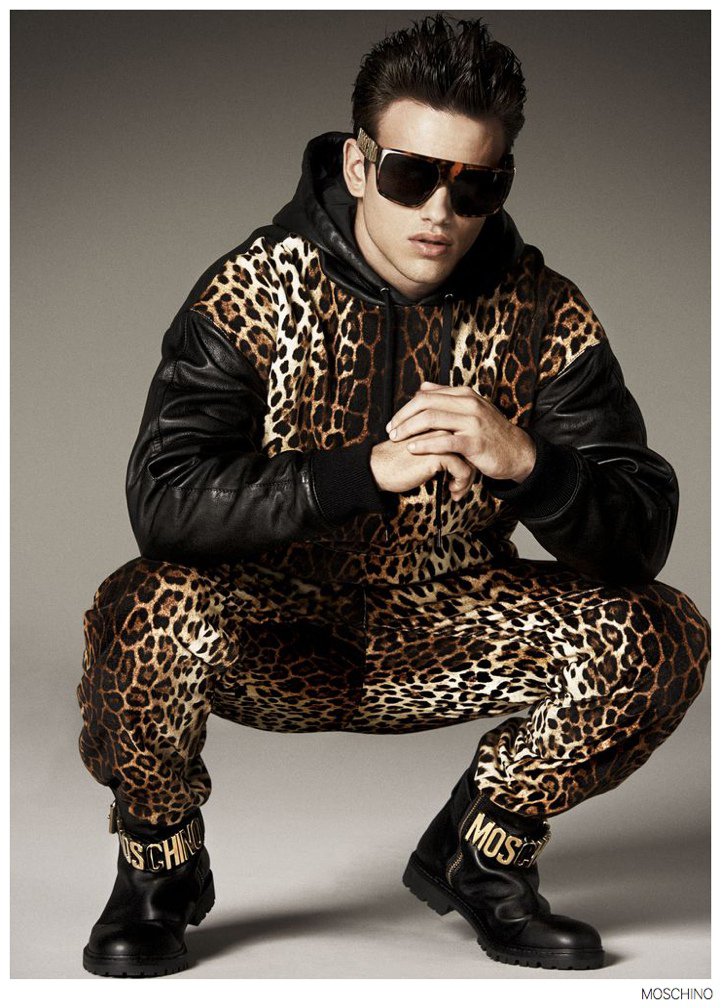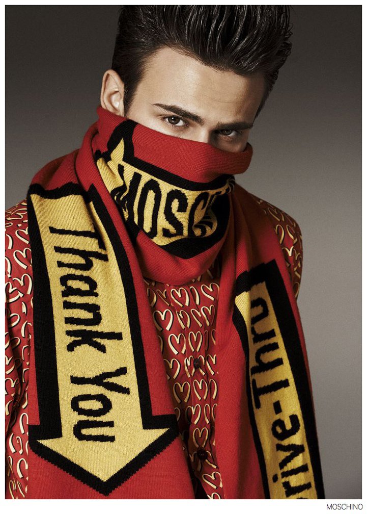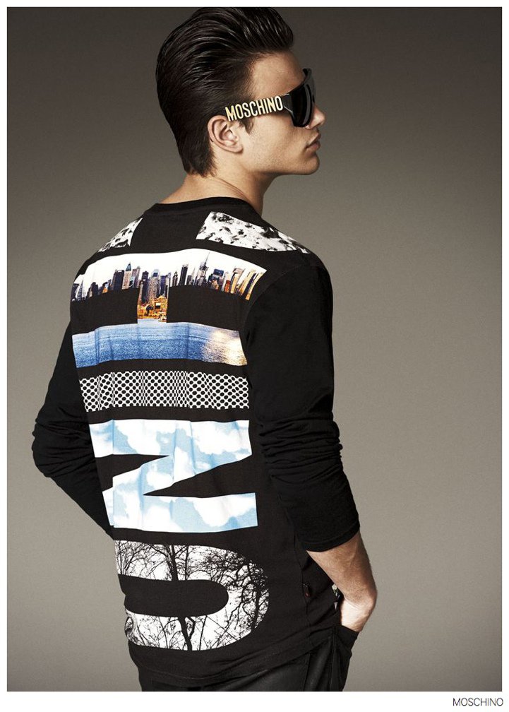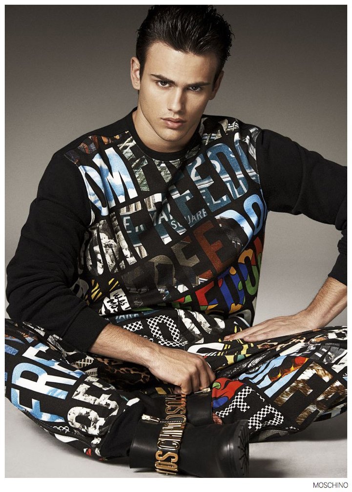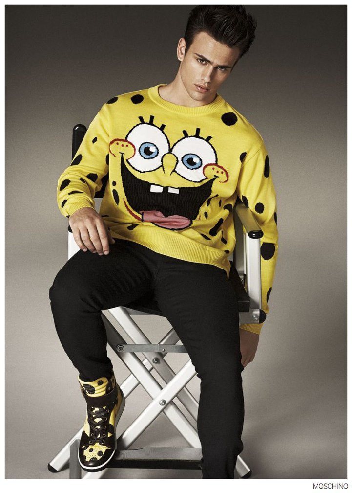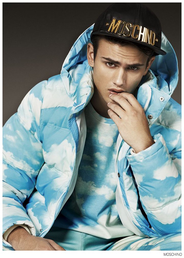 Moschino Fall 2014- After an early preview of its fall/winter 2014 outing, Moschino releases this season’s imagery in its entirety. Wearing designer Jeremy Scott’s debut menswear for the Italian label, model Sergio Carvajal connects with fashion photographer Giampaolo Sgura. Together, the two go on a splashy adventure, showcasing Scott’s eccentric use of prints that fit right in with the fun, fearless heritage of Moschino. Wearing a variety of statement making pieces, Sergio models sportswear that incorporates a McDonalds-inspired motif along with a dreamy cloud sequence, Spongebob Squarepants and animal prints.