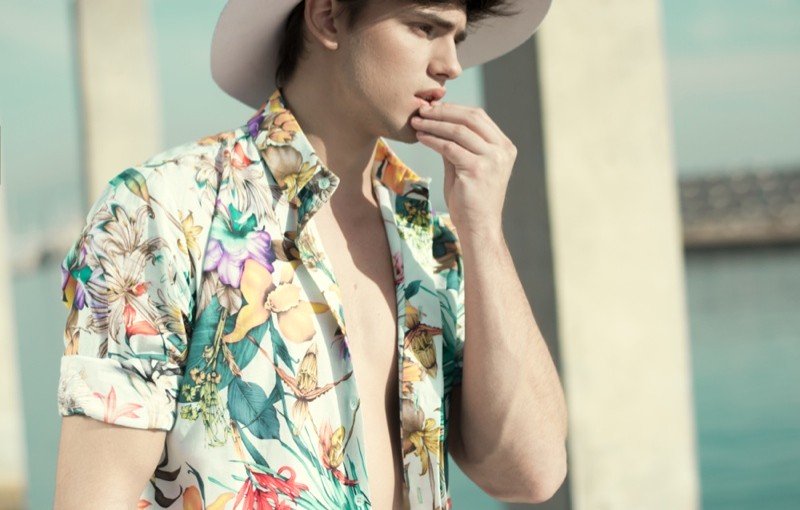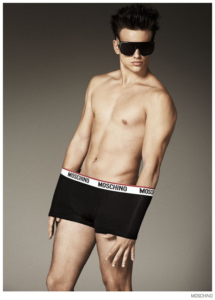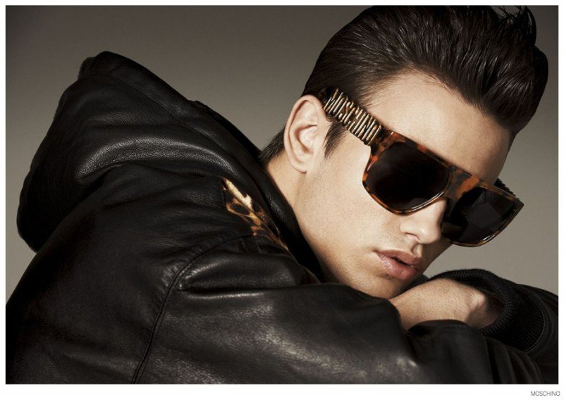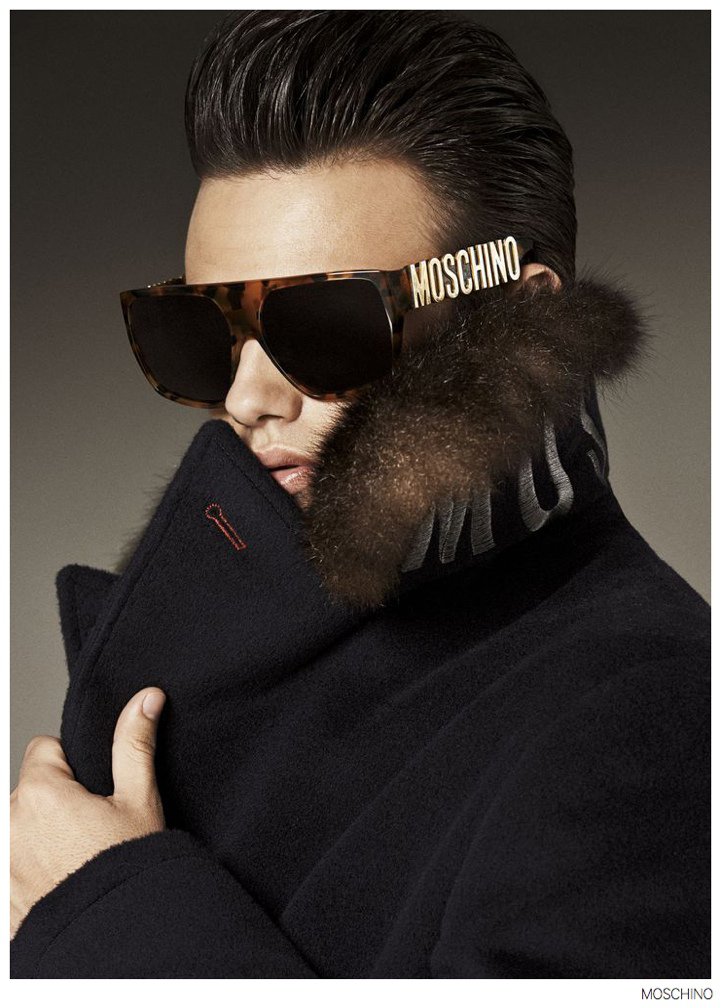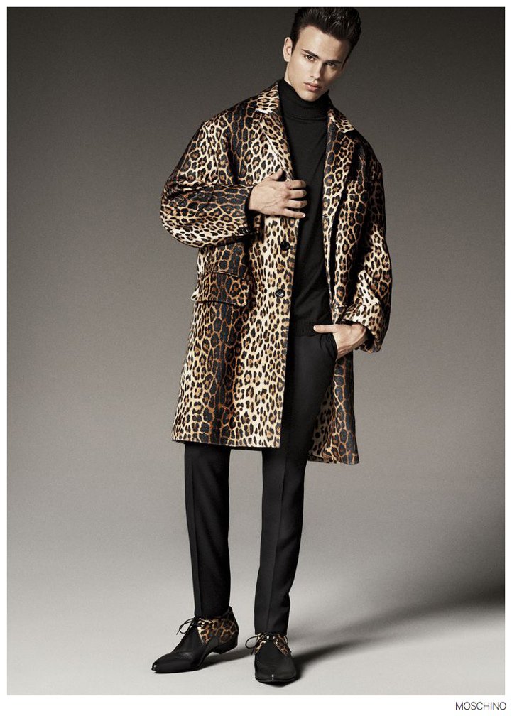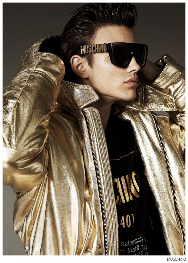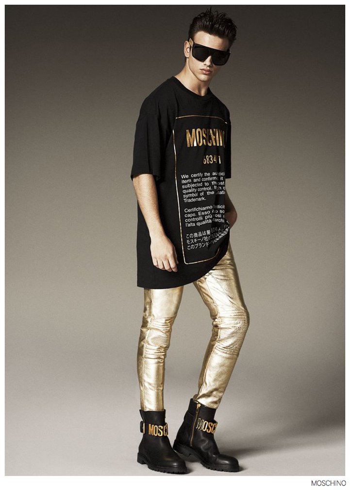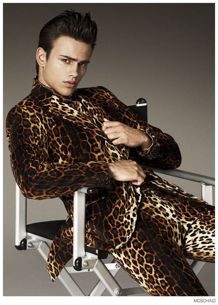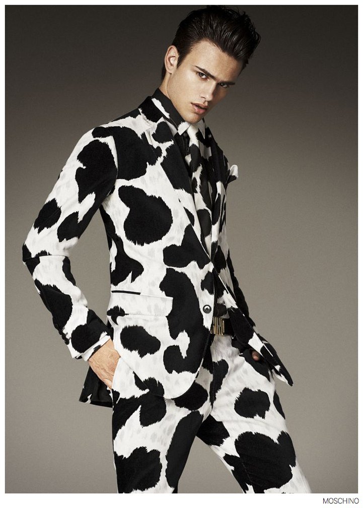 Moschino Fall 2014- After an early preview of its fall/winter 2014 outing, Moschino releases this season’s imagery in its entirety. Wearing designer Jeremy Scott’s debut menswear for the Italian label, model Sergio Carvajal connects with fashion photographer Giampaolo Sgura. Together, the two go on a splashy adventure, showcasing Scott’s eccentric use of prints that fit right in with the fun, fearless heritage of Moschino. Wearing a variety of statement making pieces, Sergio models sportswear that incorporates a McDonalds-inspired motif along with a dreamy cloud sequence, Spongebob Squarepants and animal prints.