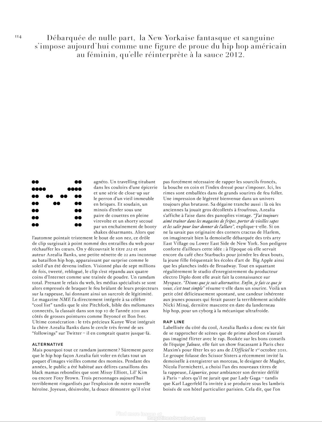 Azealia Amanda Banks (born May 31, 1991) is an American rapper, singer and lyricist from Harlem, New York signed to Interscope/Polydor, and formerly known under the pseudonym Miss Bank$.Banks rose in notability in 2011 when she topped NME´s "Cool List" for the year. On December 5, 2011, the BBC announced that Banks had been nominated for the Sound of 2012, where she ultimately finished third. Her debut single, "212" featuring Lazy Jay, was released on December 6, 2011.