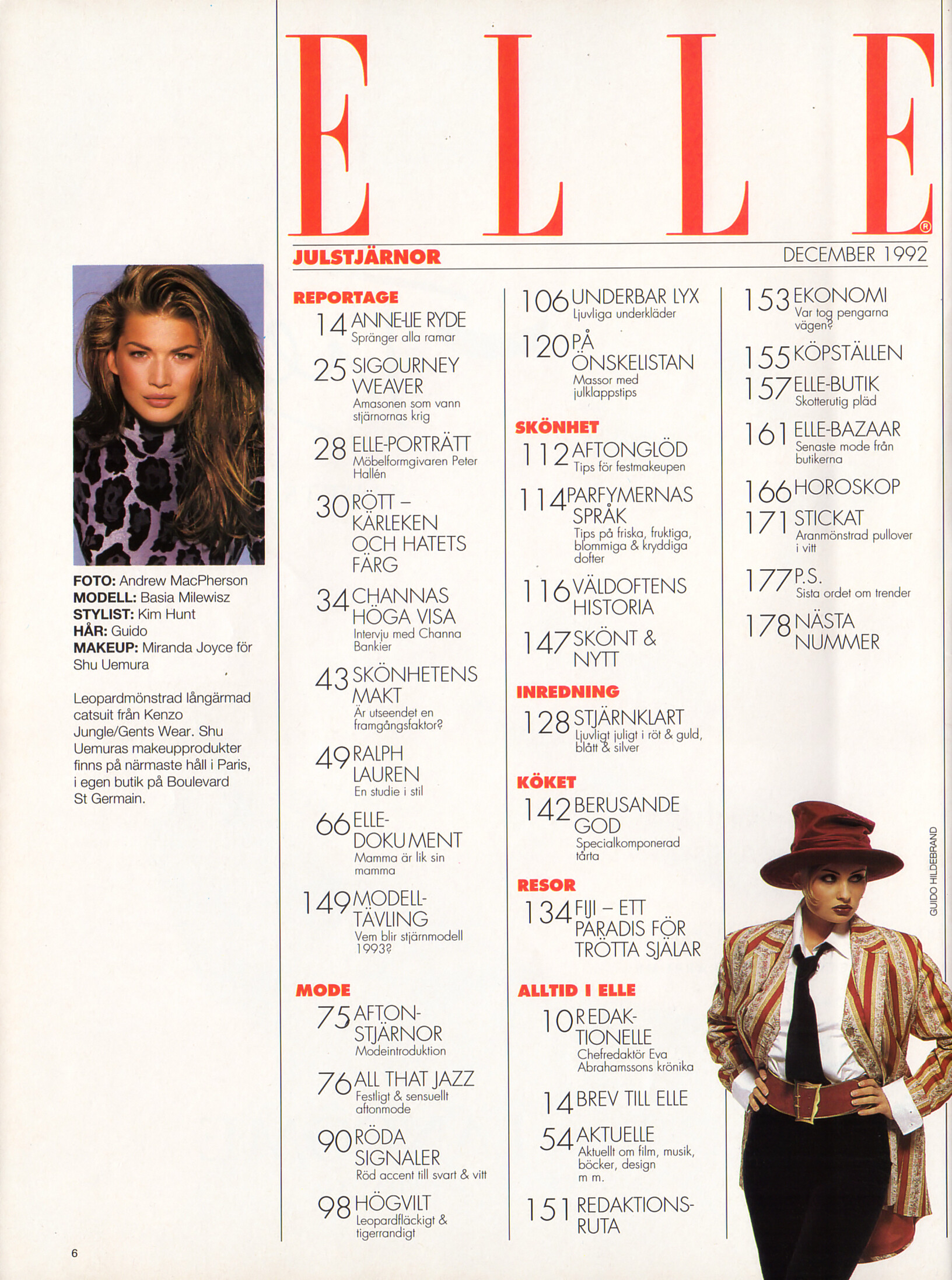 contents + "AFTON STJÄRNOR" + "RÖDA SIGNALER" - ELLE Sweden December 1992 by Guido Hildebrand - also showing Basia Milewicz