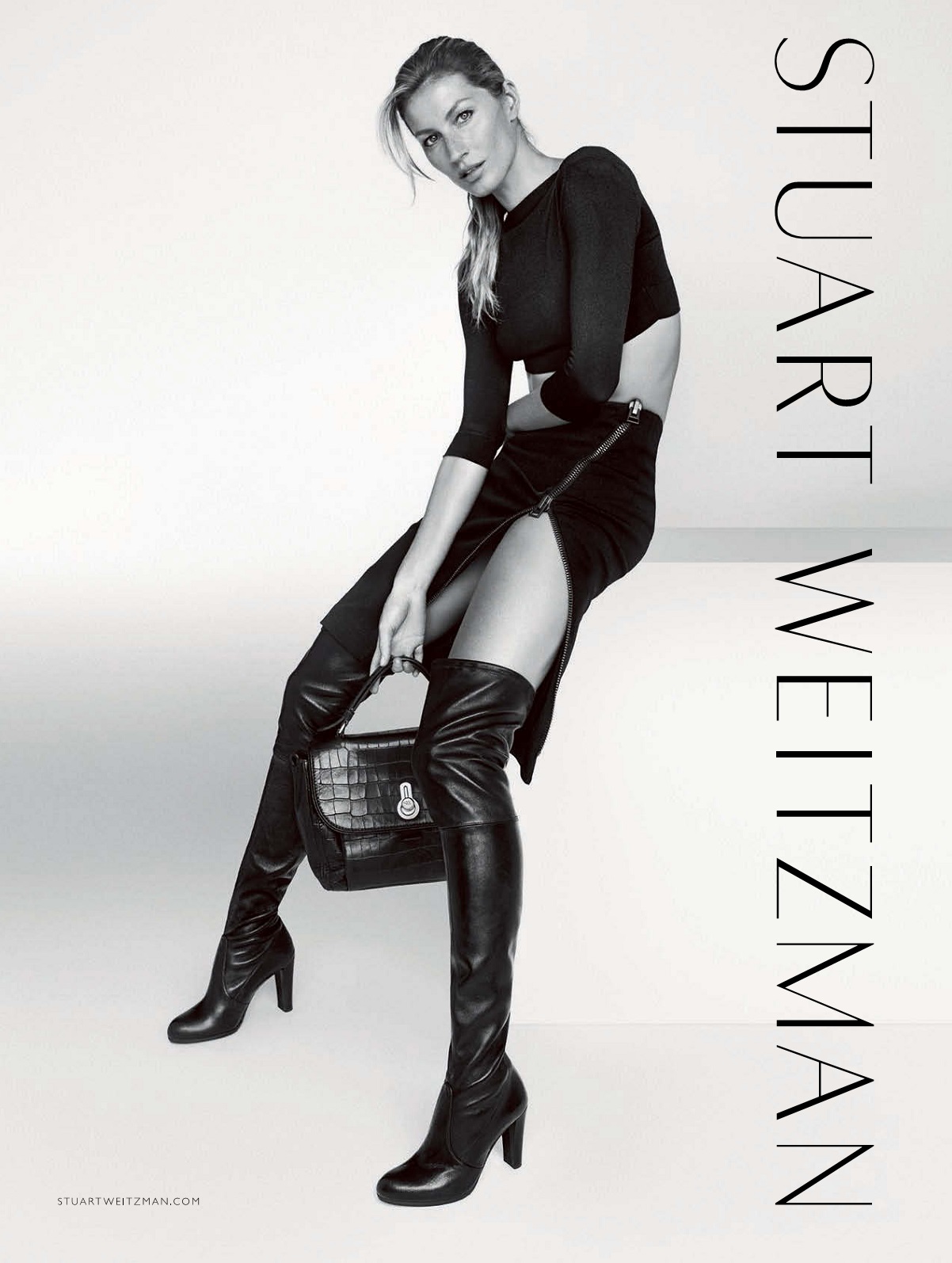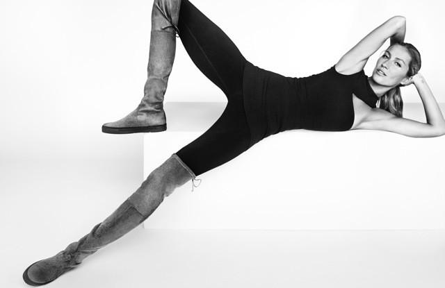 GISELE AND STUART RIDE AGAIN: Gisele Bündchen might havesworn off the catwalk, but she hasn’t leftStuart Weitzman. For fall, the supermodel returns as the face of the footwear brand, fronting its boot-centric campaign. In the black-and-white images shot by Mario Testino, Bündchen appears wearing a pair of the brand’s extreme, 28-inch thigh-high boots — a style aptly named “ALLLEGS.”