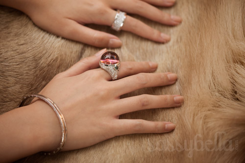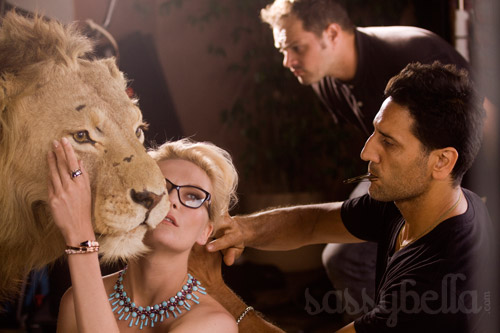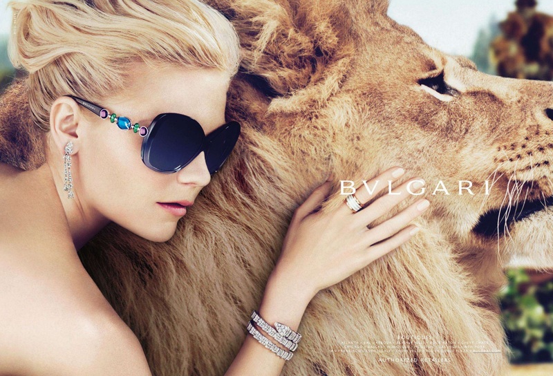 Kirsten Dunst poses with a giant bottle of Bulgari’s Mon Jasmin Noir while sitting next to a lion in the fragrance’s ad campaign.