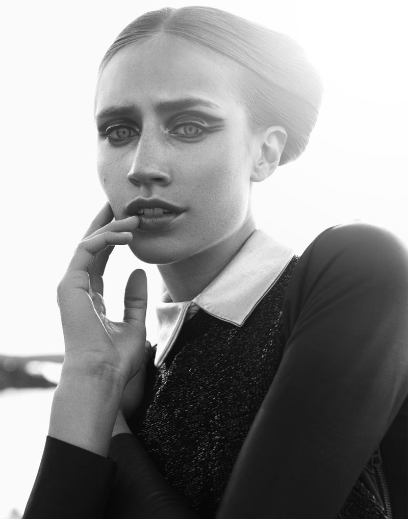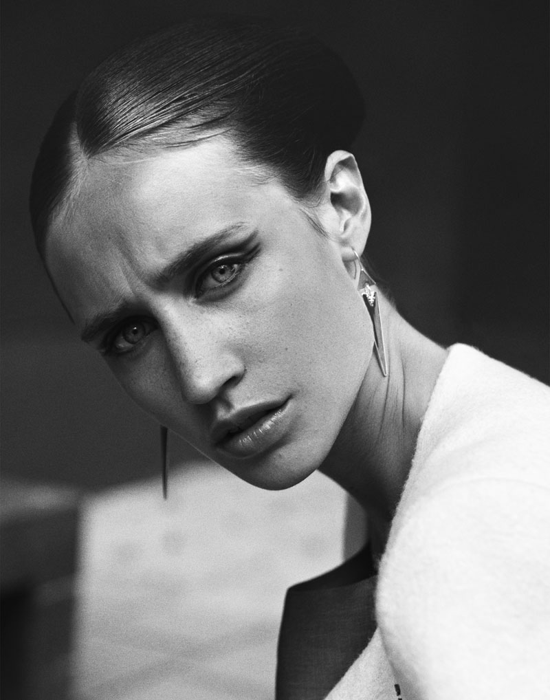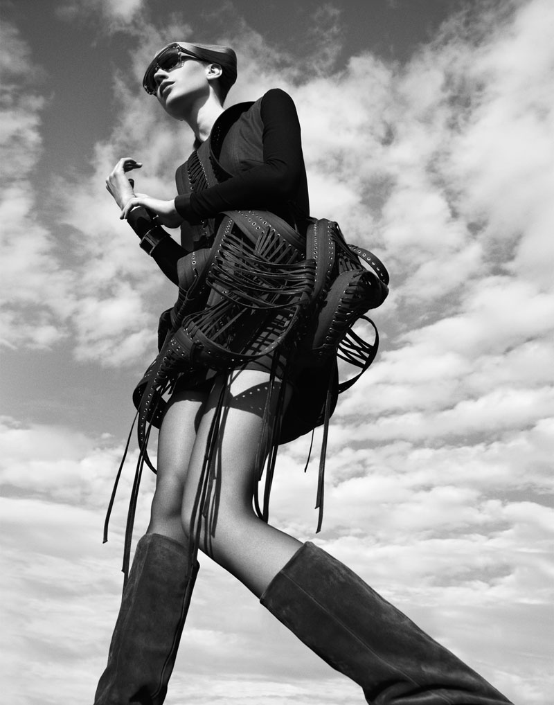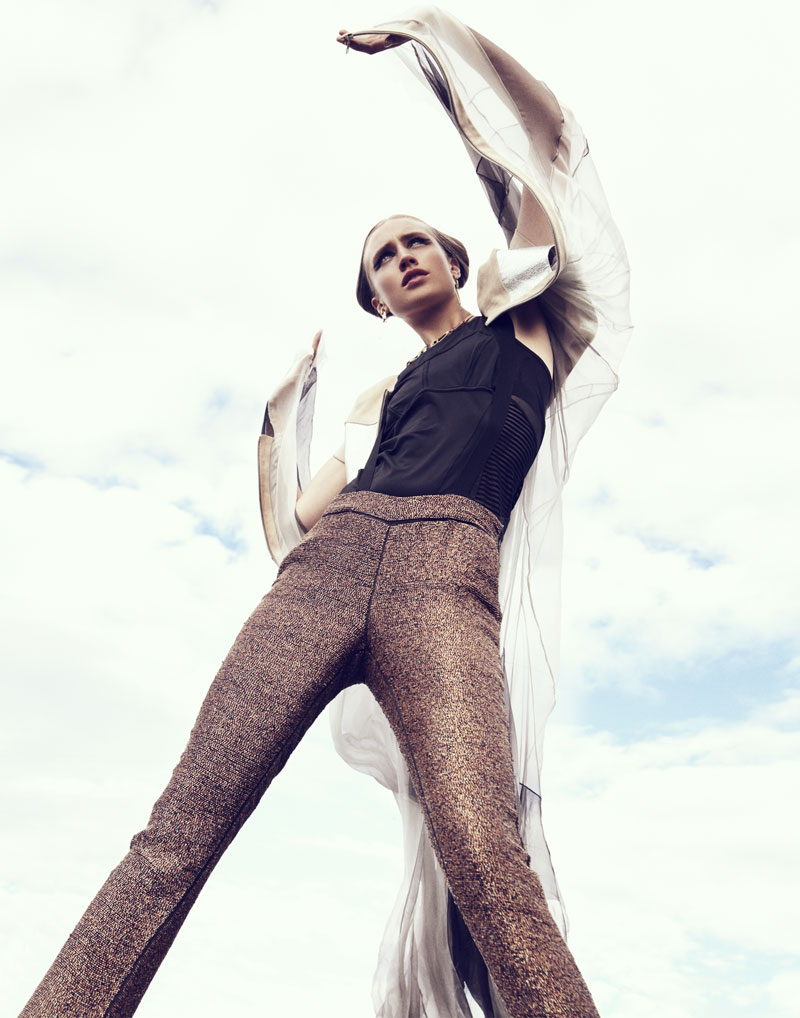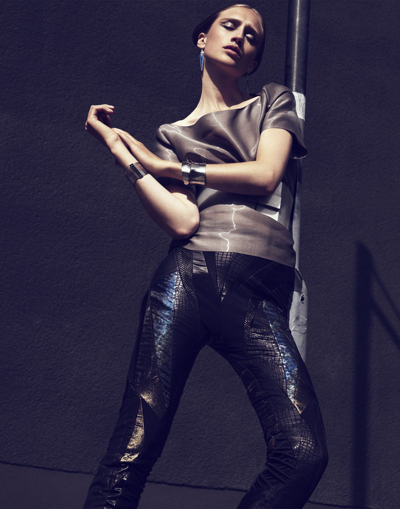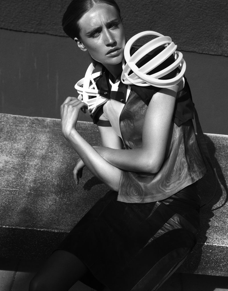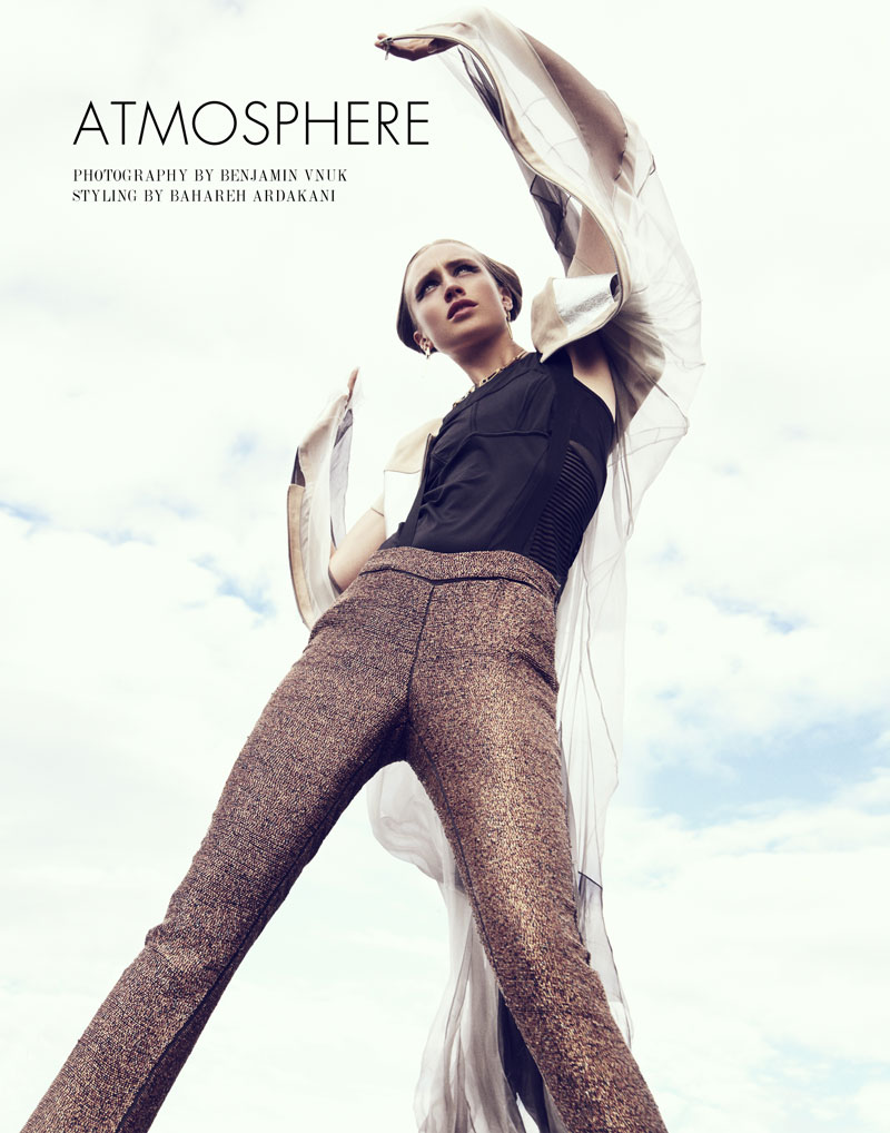 Quote: Atmosphere – Photographer Benjamin Vnuk and stylist Bahareh Ardakani team up for a story of modern style shot for our latest exclusive. Model Karin Hansson wears studded and metallic pieces from the likes of Calvin Klein, Fifth Avenue Shoe Repair, Stella McCartney for Adidas and Acne in the high impact images. Set against sky and concrete, Karin glows with a futuristic coif by hair stylist Peter Johansson and dewy skin by makeup artist Jeanette Törnqvist.