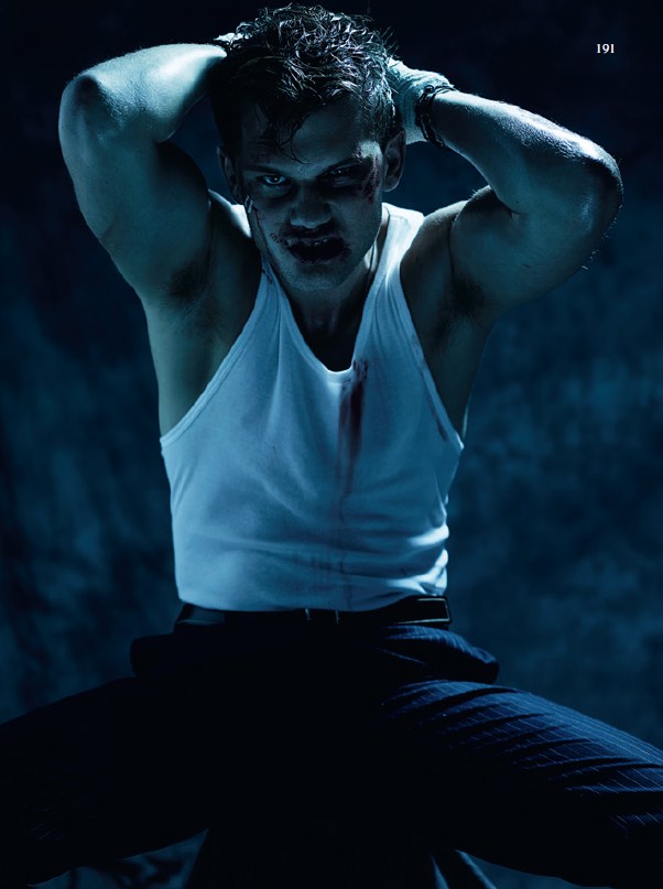 JI: I’d love to get fat on camera. Wouldn’t that be great? I’ll tell you what’s almost as hard though, getting bulked up, getting that big. Here we are in LA and you see guys walking down the street and everyone looks like Arnold Schwarzenegger. That’s really quite grim, if you haven’t done it before. Obviously I’ve had to go up and down a lot and that’s rough as well. I feel that Channing Tatum has just ruined it for all of us! Especially being British! I’m meant to be skinny and wearing tweed jackets and now I have to have a six-pack. It’s horrible! (laughs)