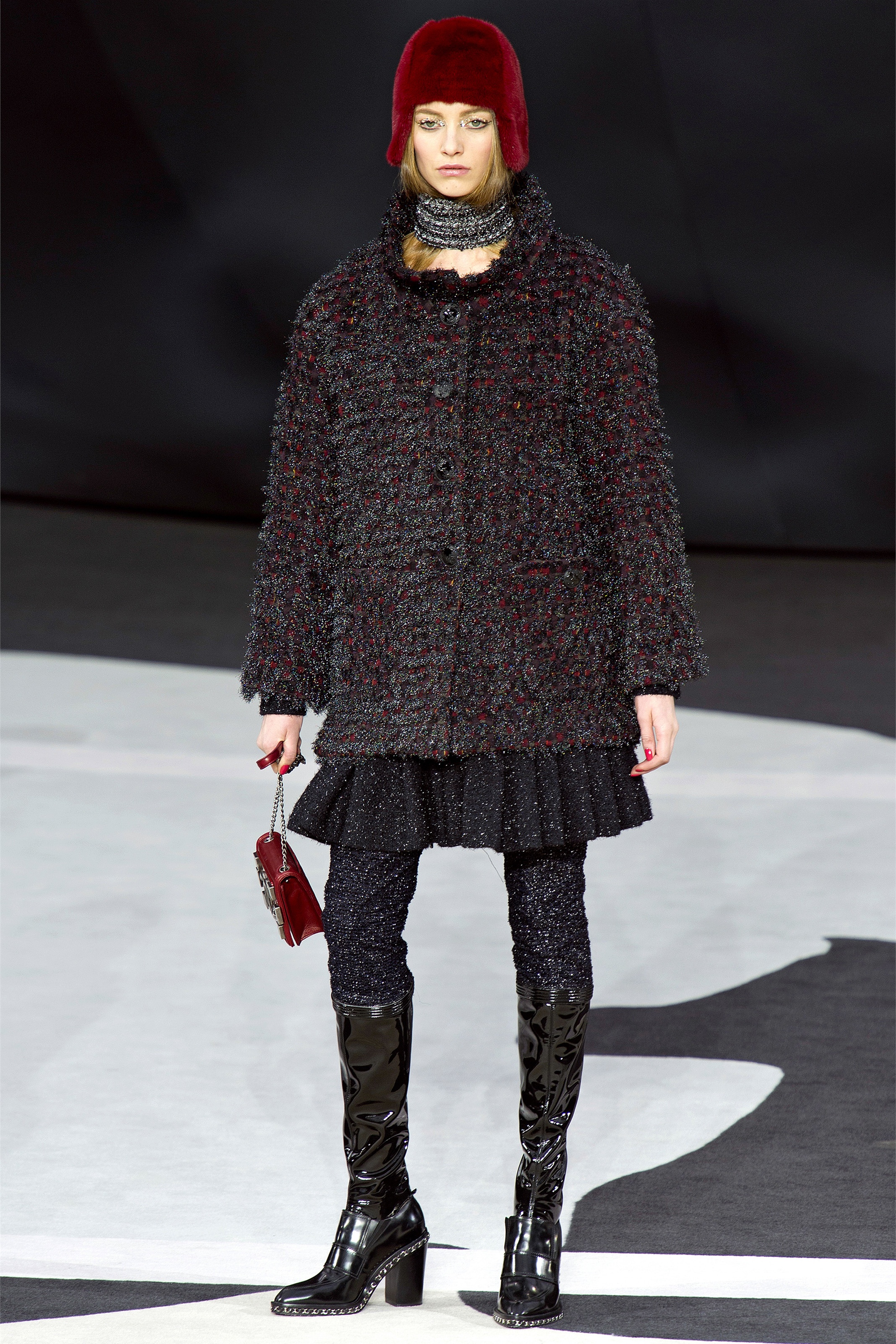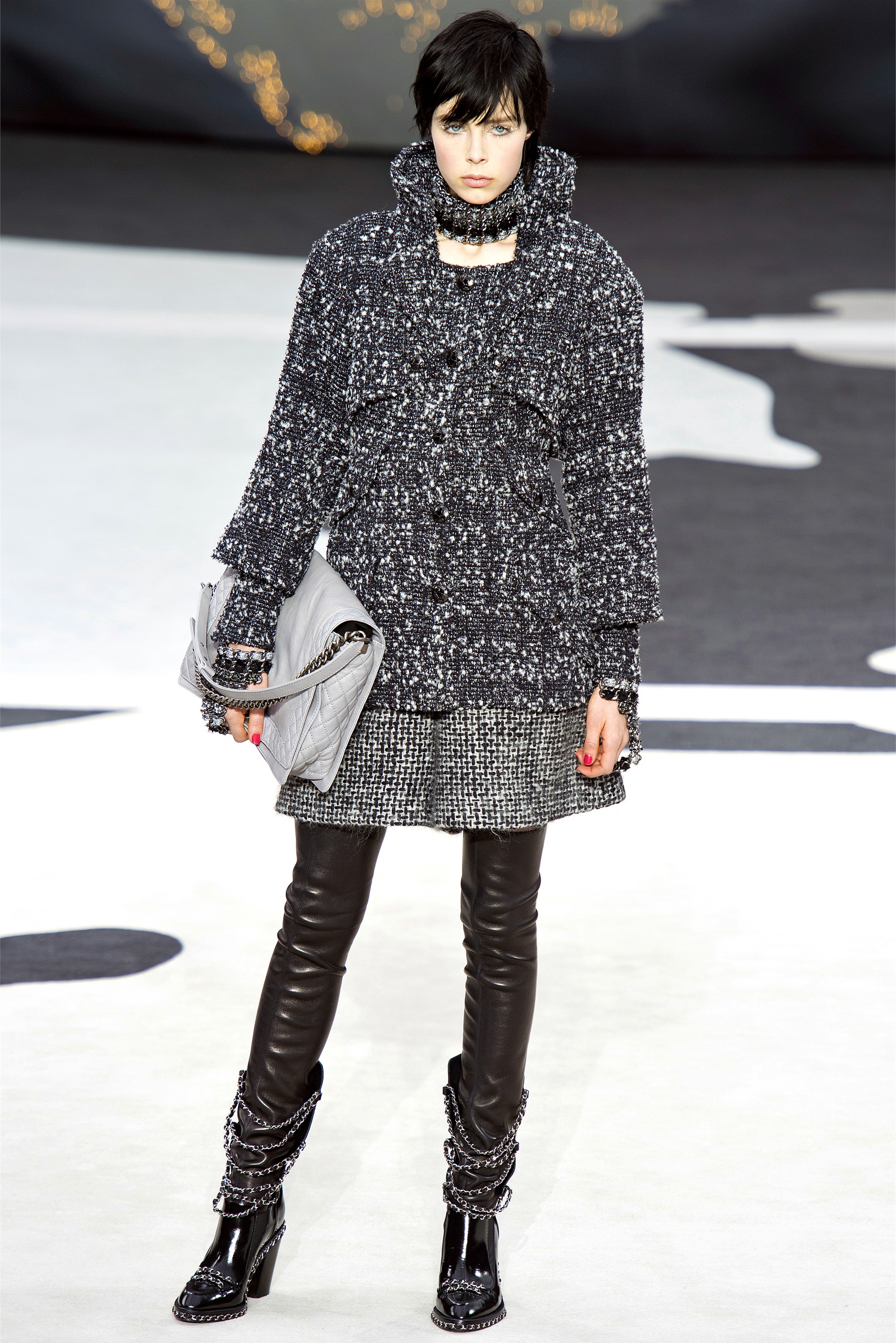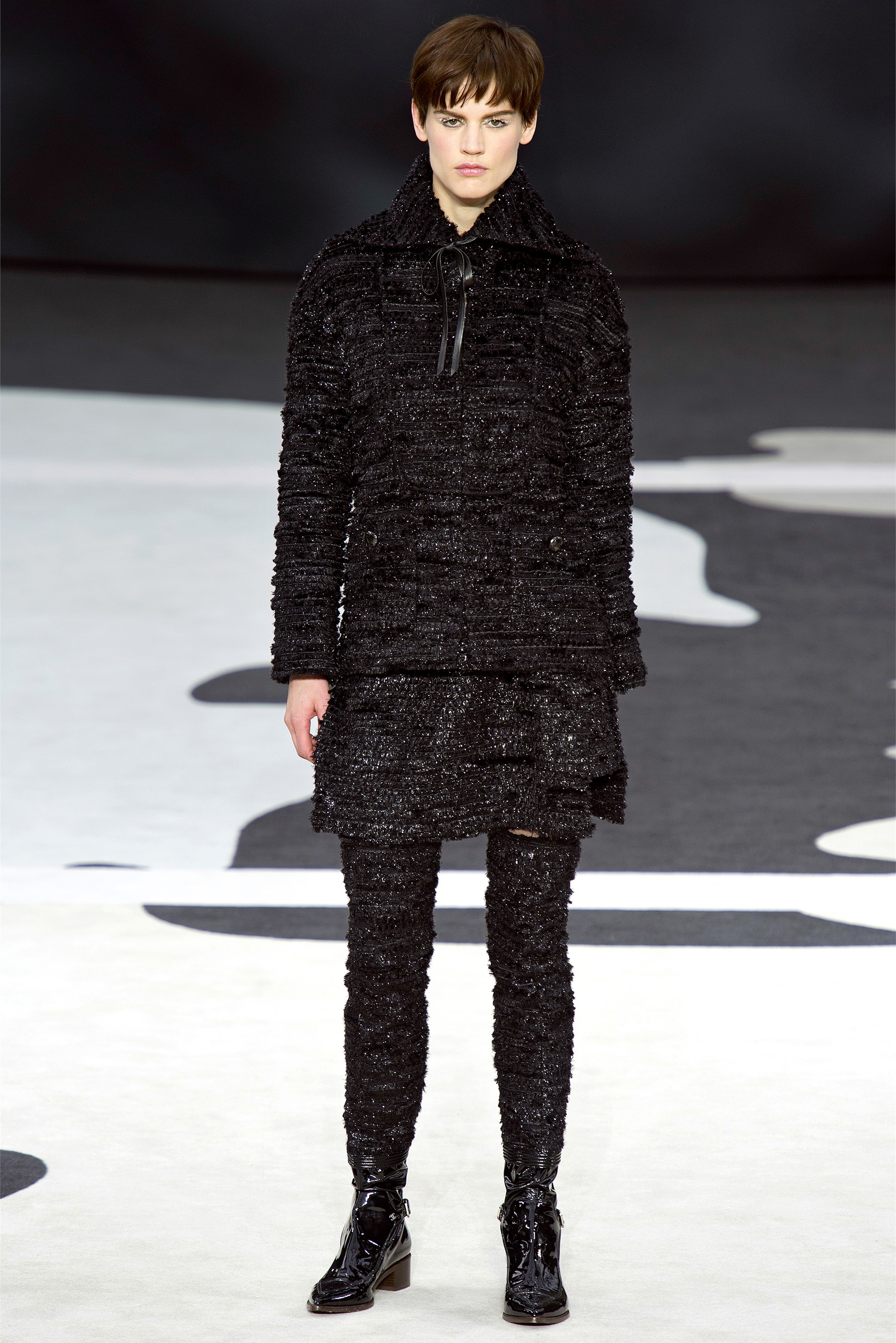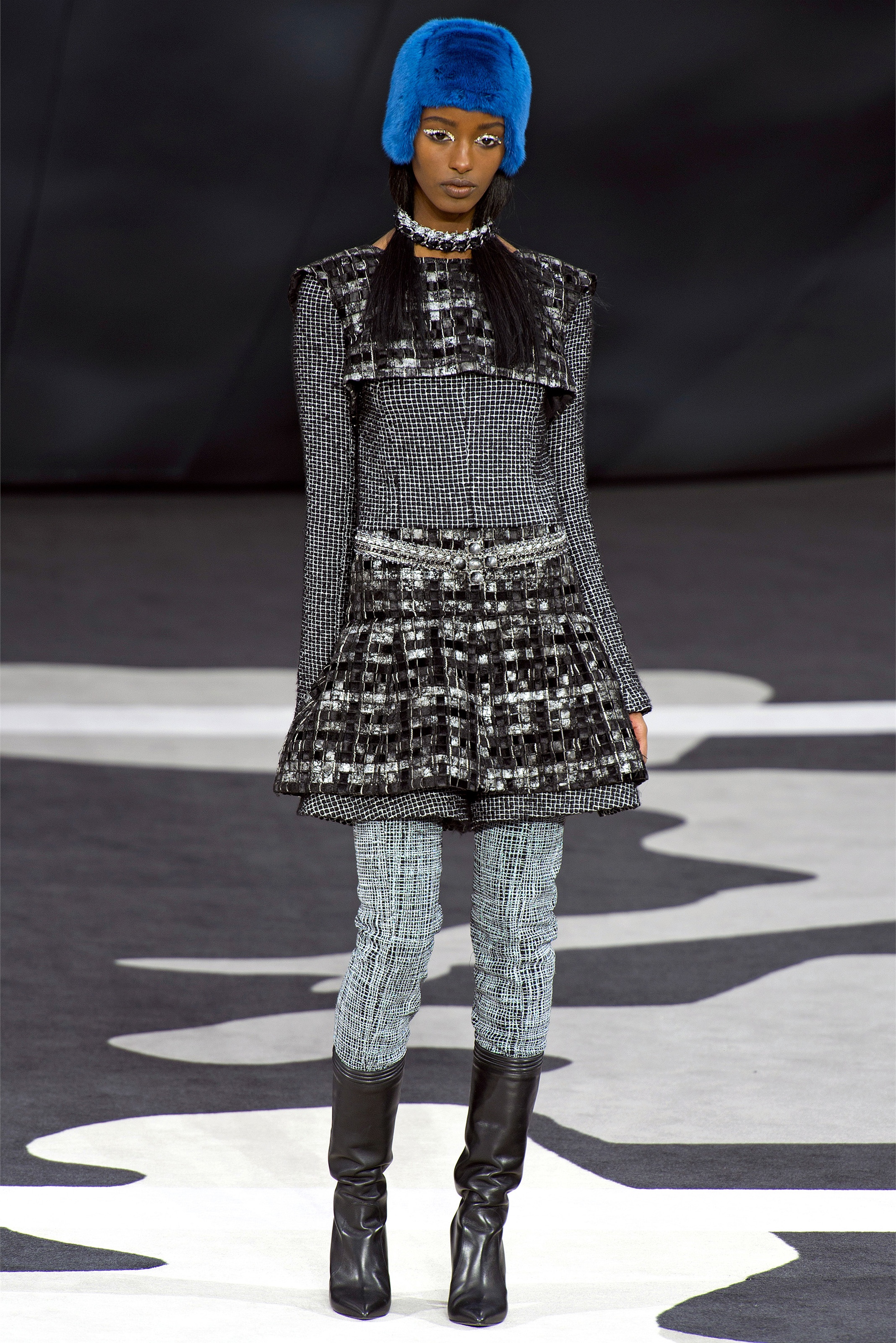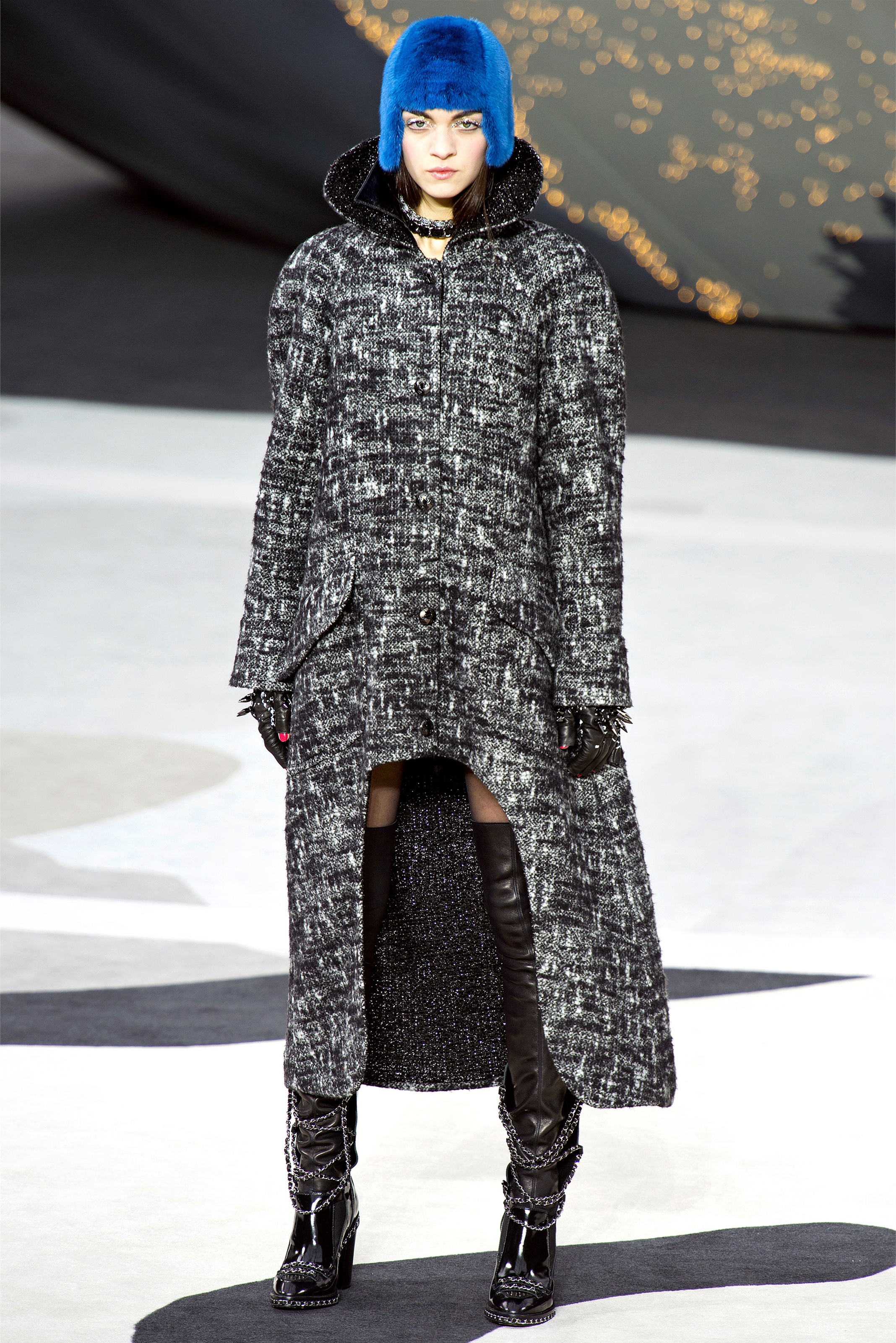 Even though it was night, the darkling was sparkling. "Not depressing," Lagerfeld emphasized. Tweeds glittered, metallic thread brought shine to wovens. Aymeline Valade was entangled in a wonderful, shiny spirographic web. The effect was a little starlight spacey, though that impression might also have been steered by the Cardin-esque helmets some of the models were wearing. (They were, said Lagerfeld, actually facsimiles, in fur, of Anna Wintour's iconic bob.)