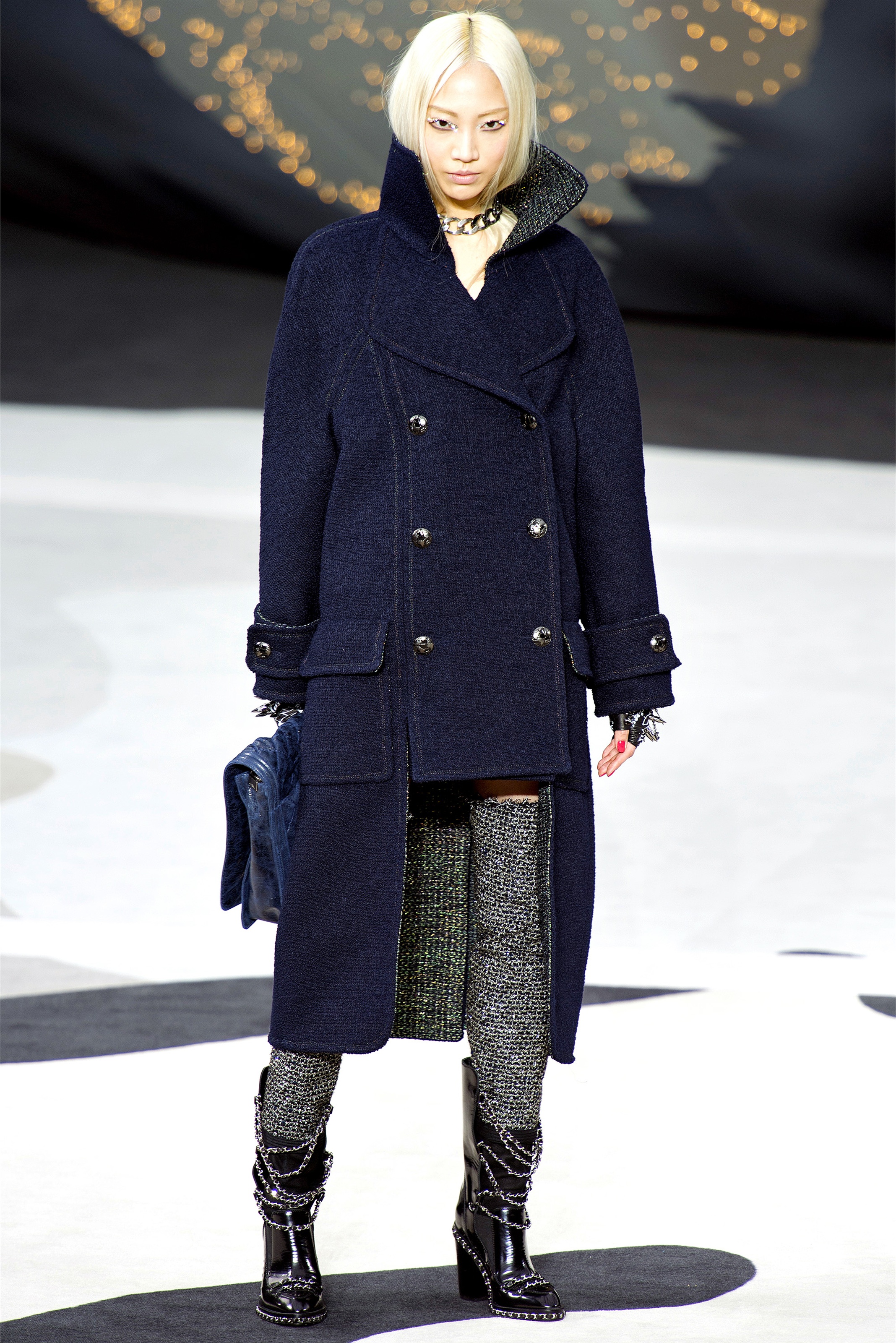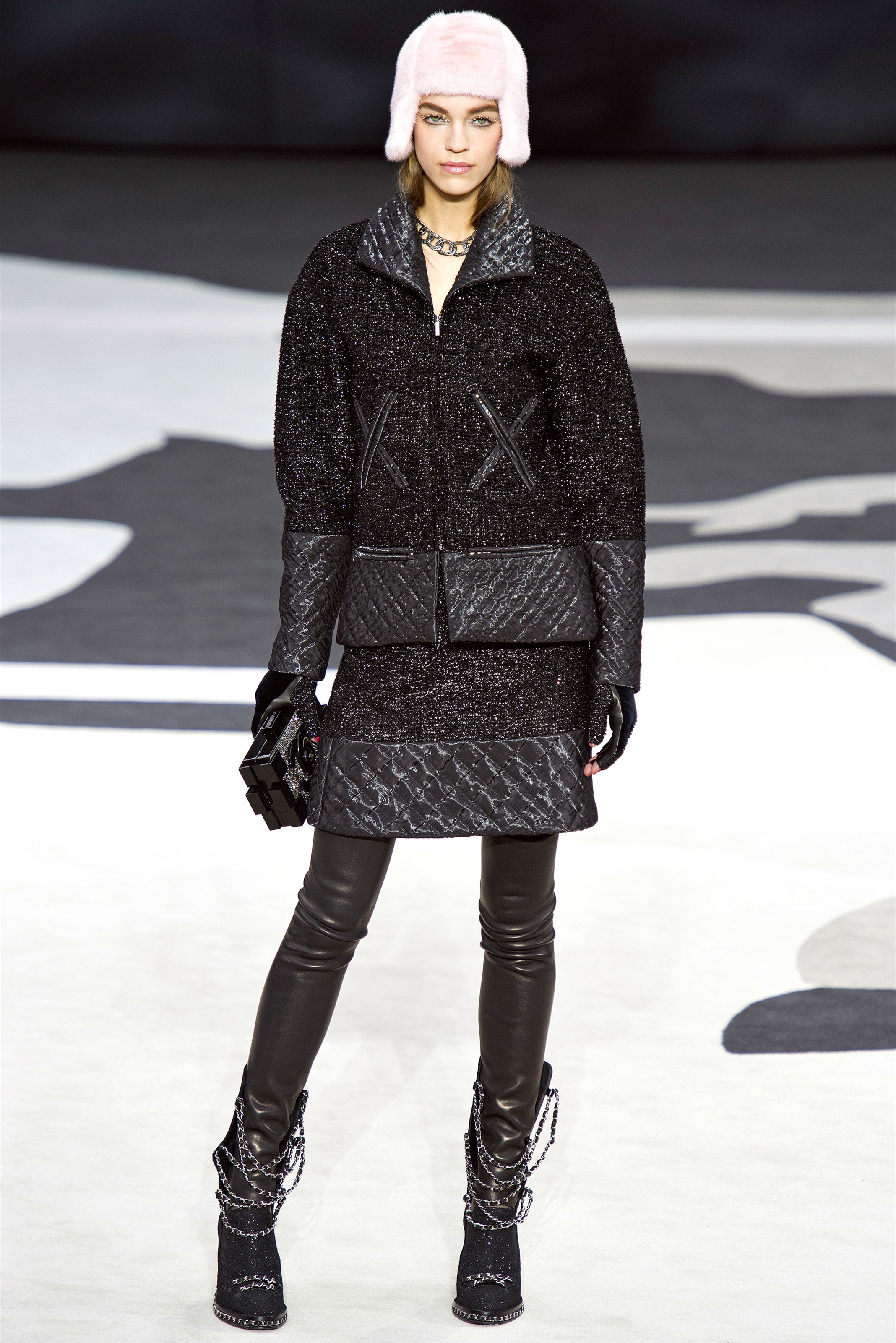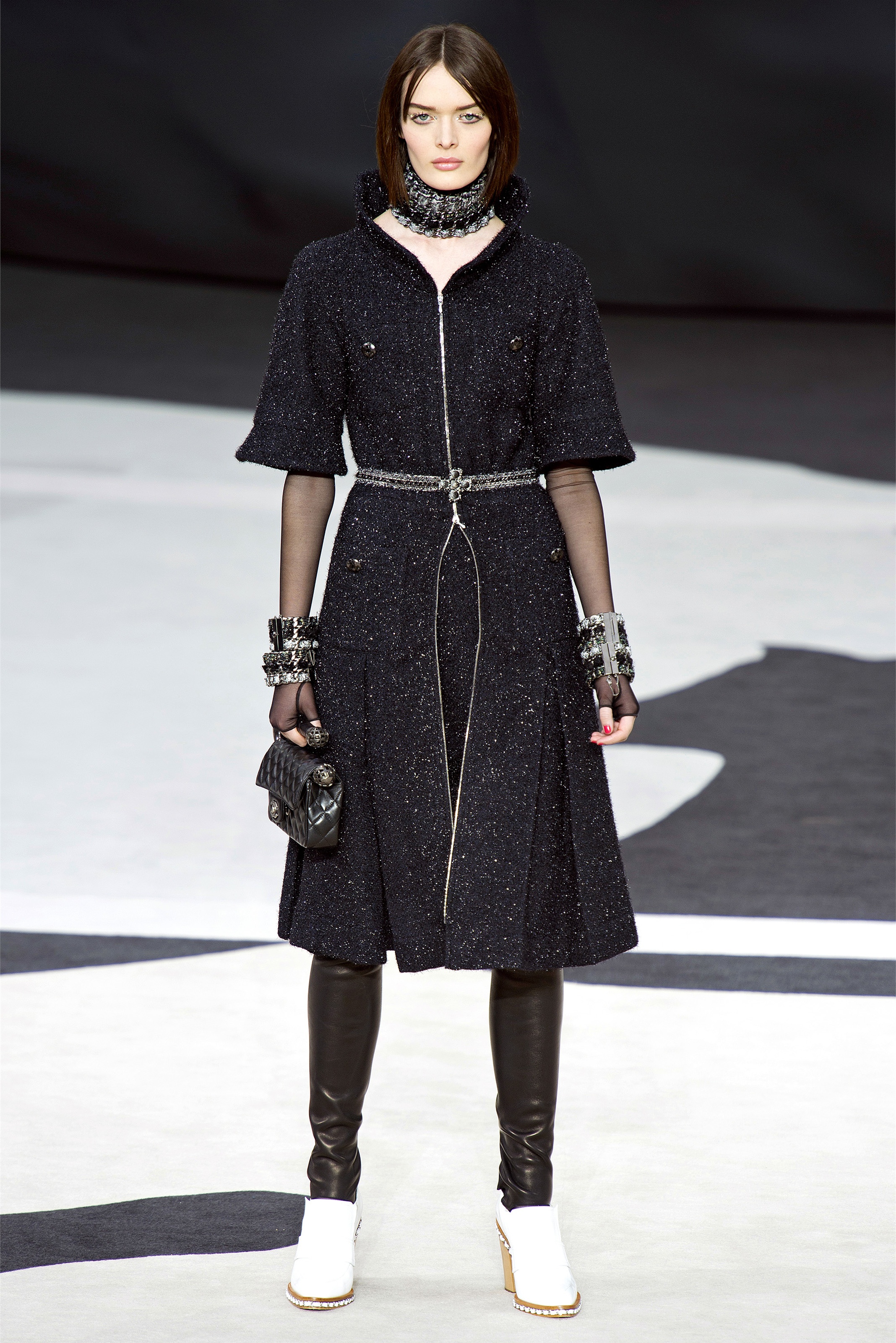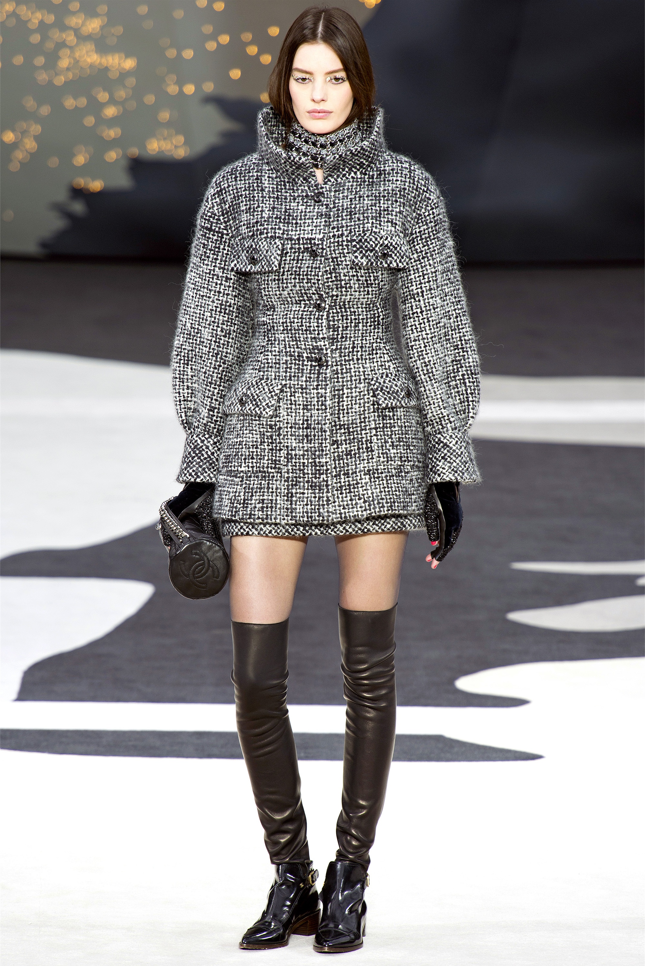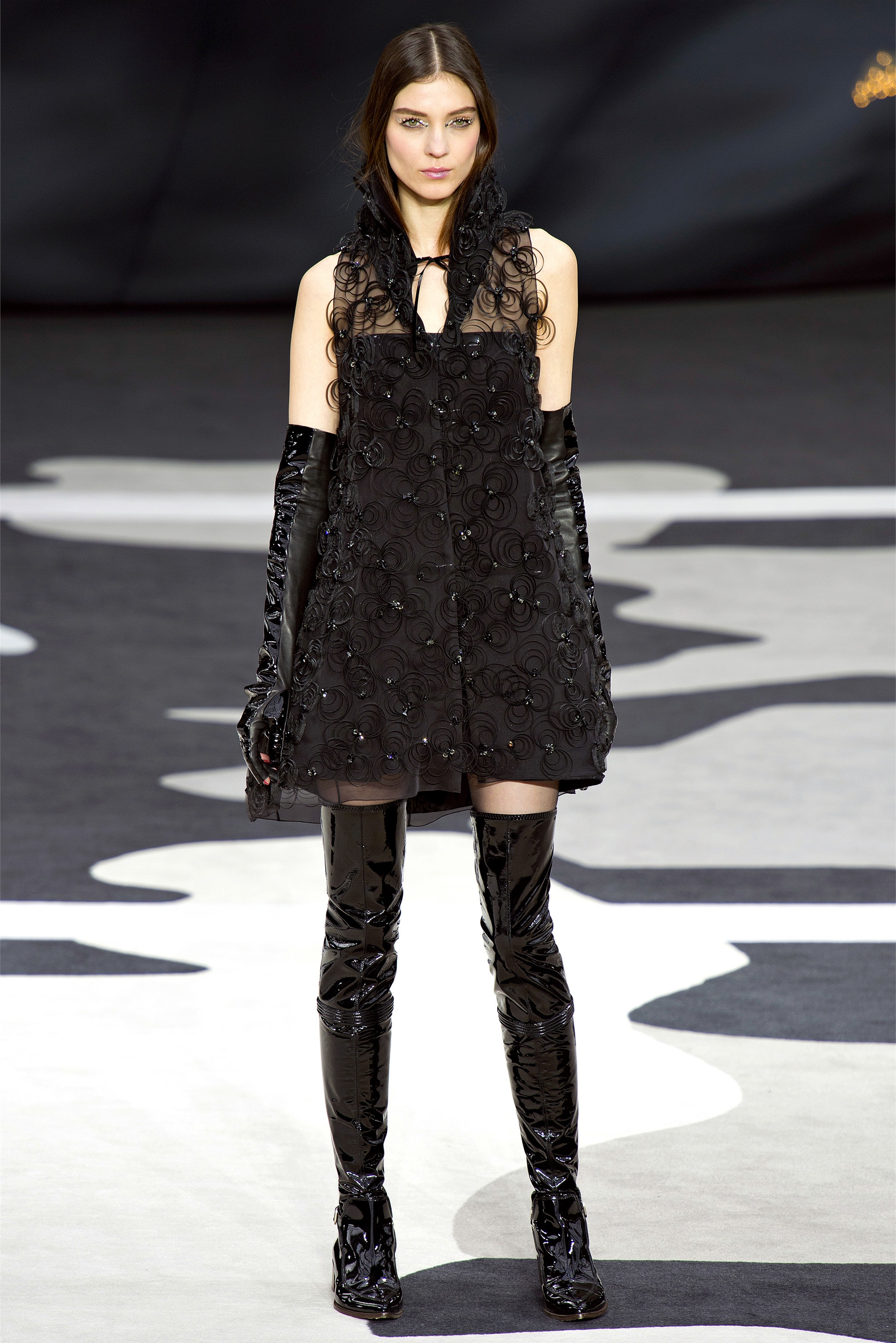 Even though it was night, the darkling was sparkling. "Not depressing," Lagerfeld emphasized. Tweeds glittered, metallic thread brought shine to wovens. Aymeline Valade was entangled in a wonderful, shiny spirographic web. The effect was a little starlight spacey, though that impression might also have been steered by the Cardin-esque helmets some of the models were wearing. (They were, said Lagerfeld, actually facsimiles, in fur, of Anna Wintour's iconic bob.)