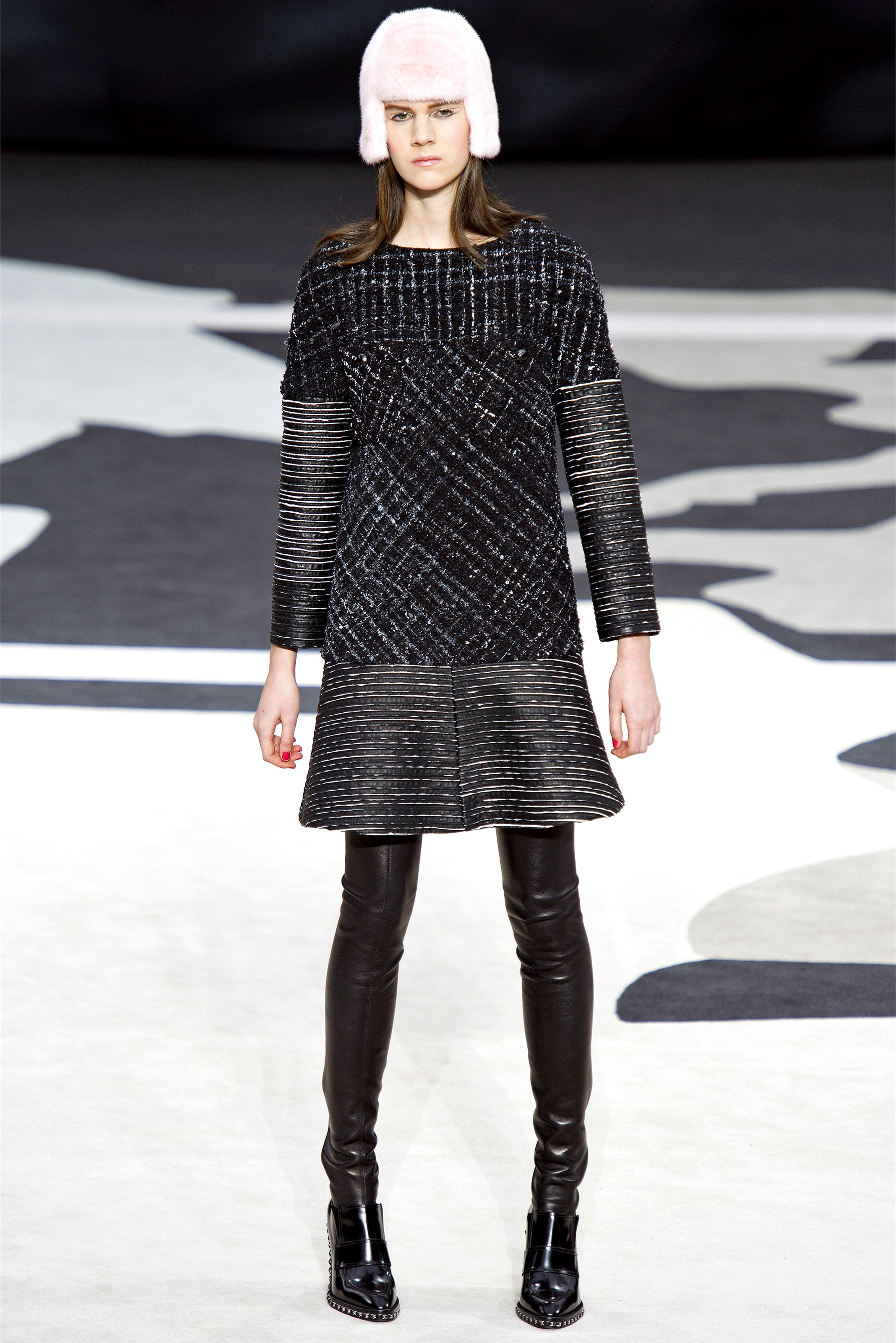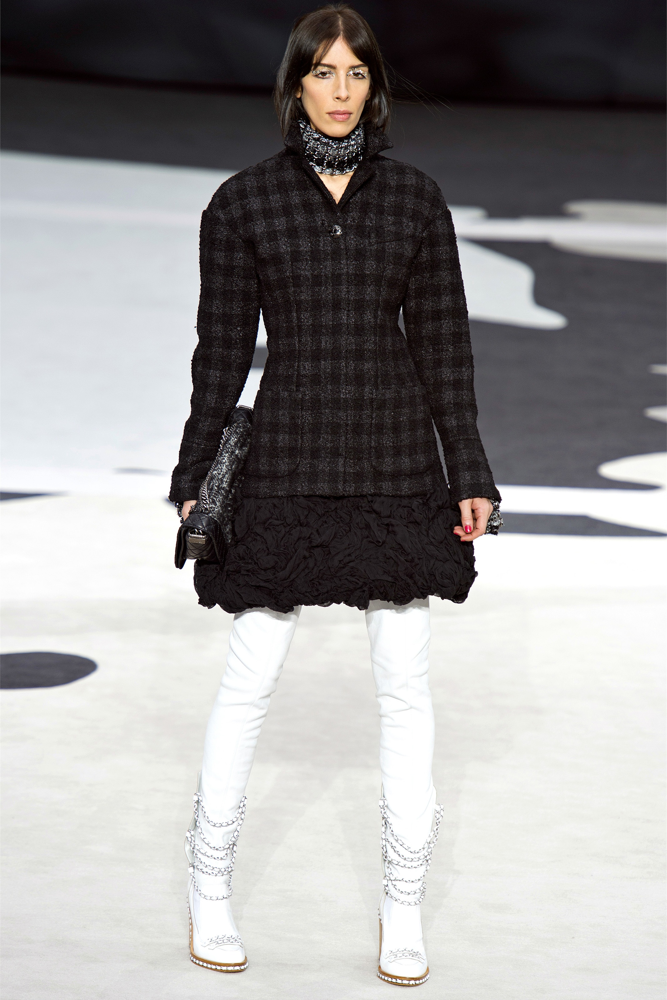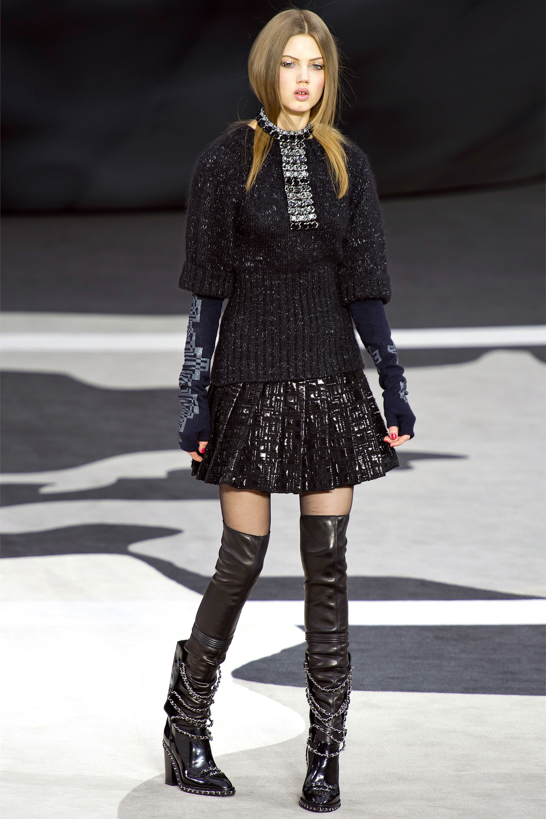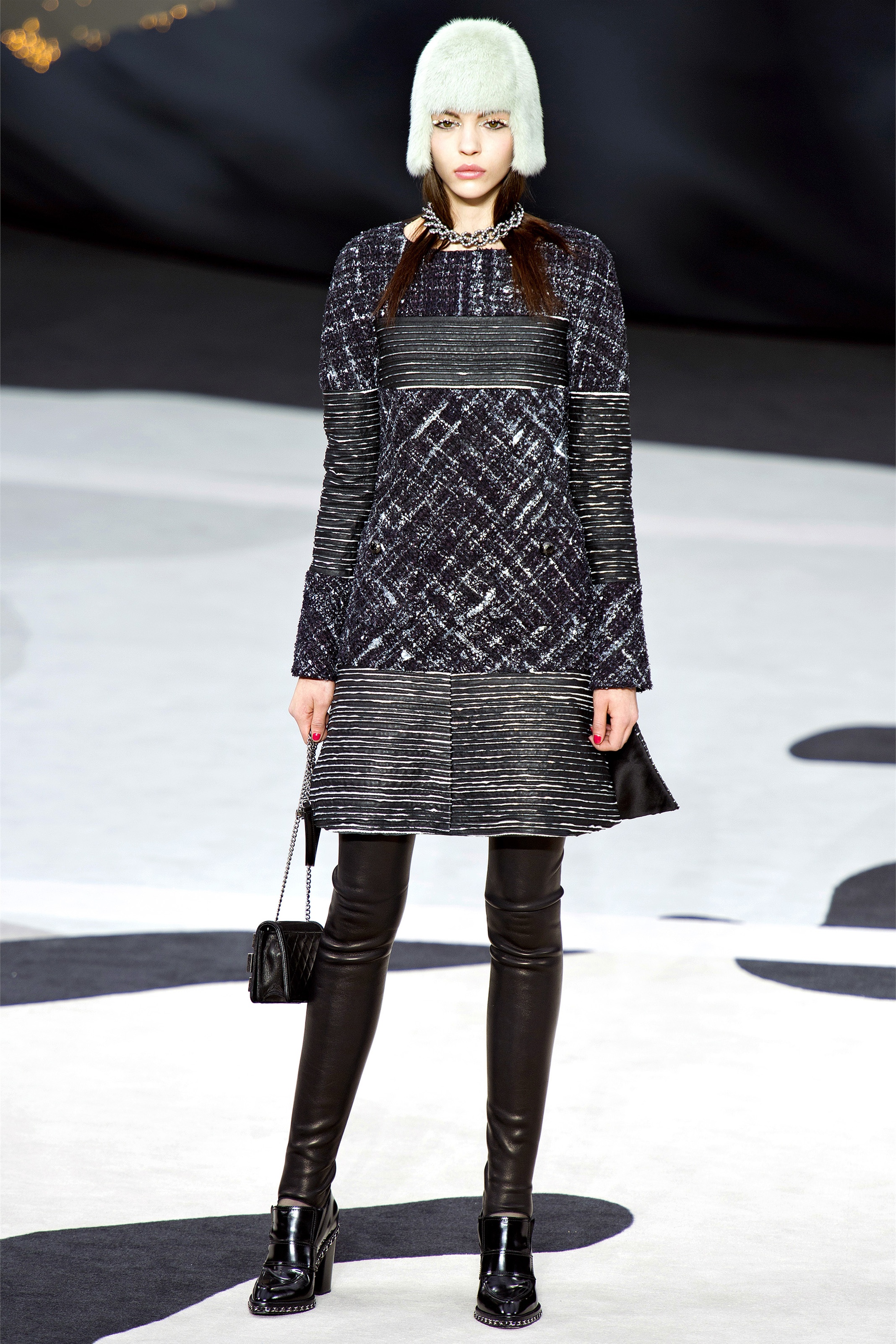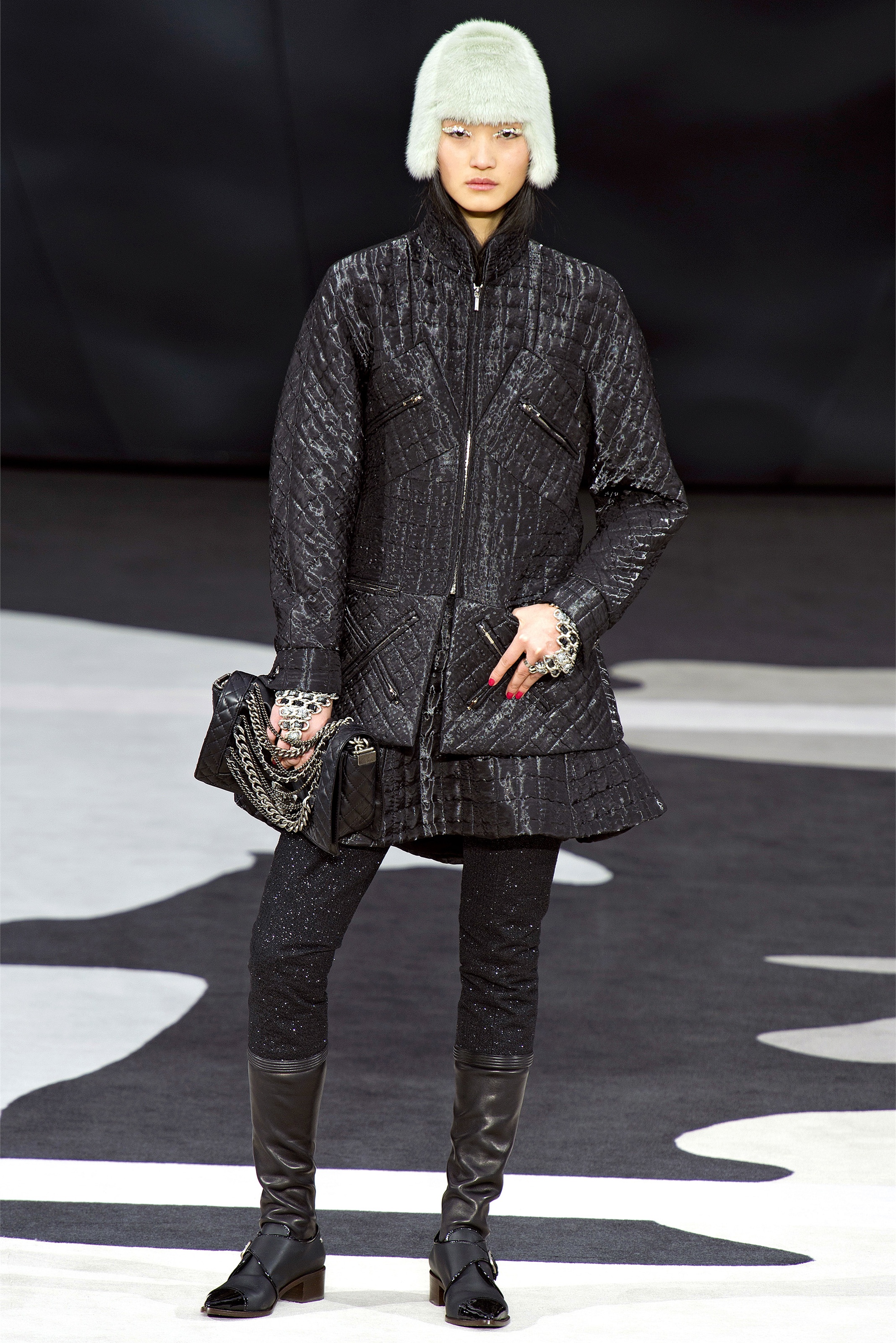 Even though it was night, the darkling was sparkling. "Not depressing," Lagerfeld emphasized. Tweeds glittered, metallic thread brought shine to wovens. Aymeline Valade was entangled in a wonderful, shiny spirographic web. The effect was a little starlight spacey, though that impression might also have been steered by the Cardin-esque helmets some of the models were wearing. (They were, said Lagerfeld, actually facsimiles, in fur, of Anna Wintour's iconic bob.)
