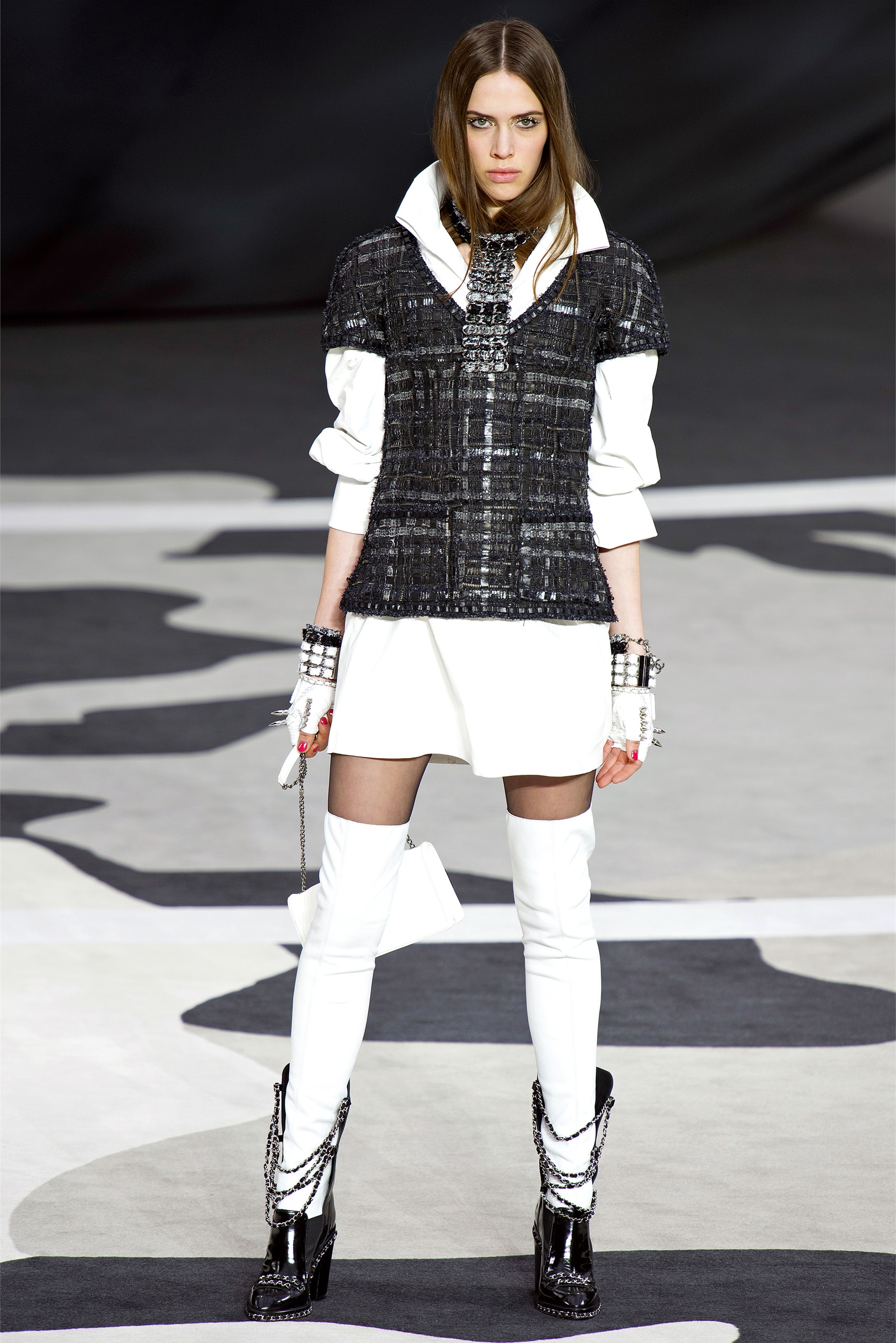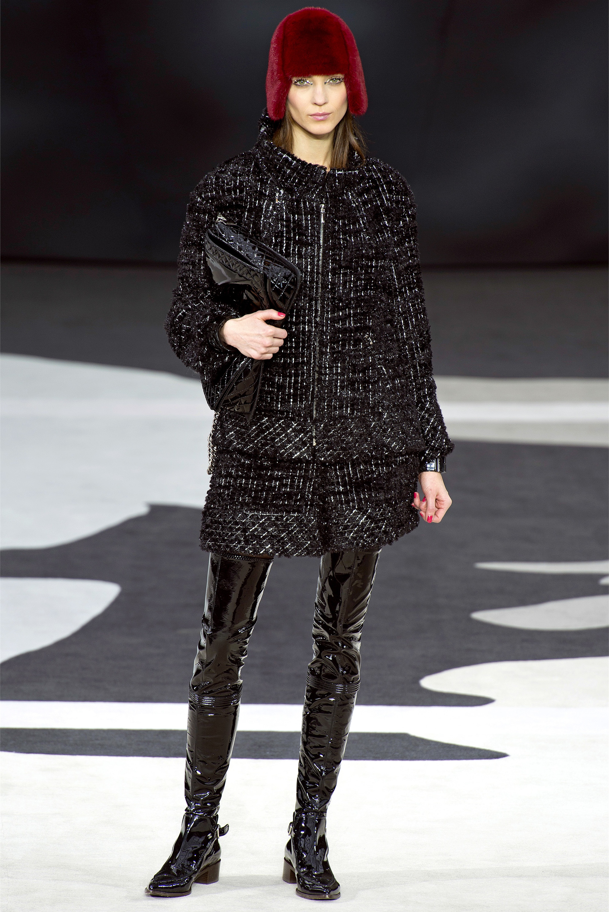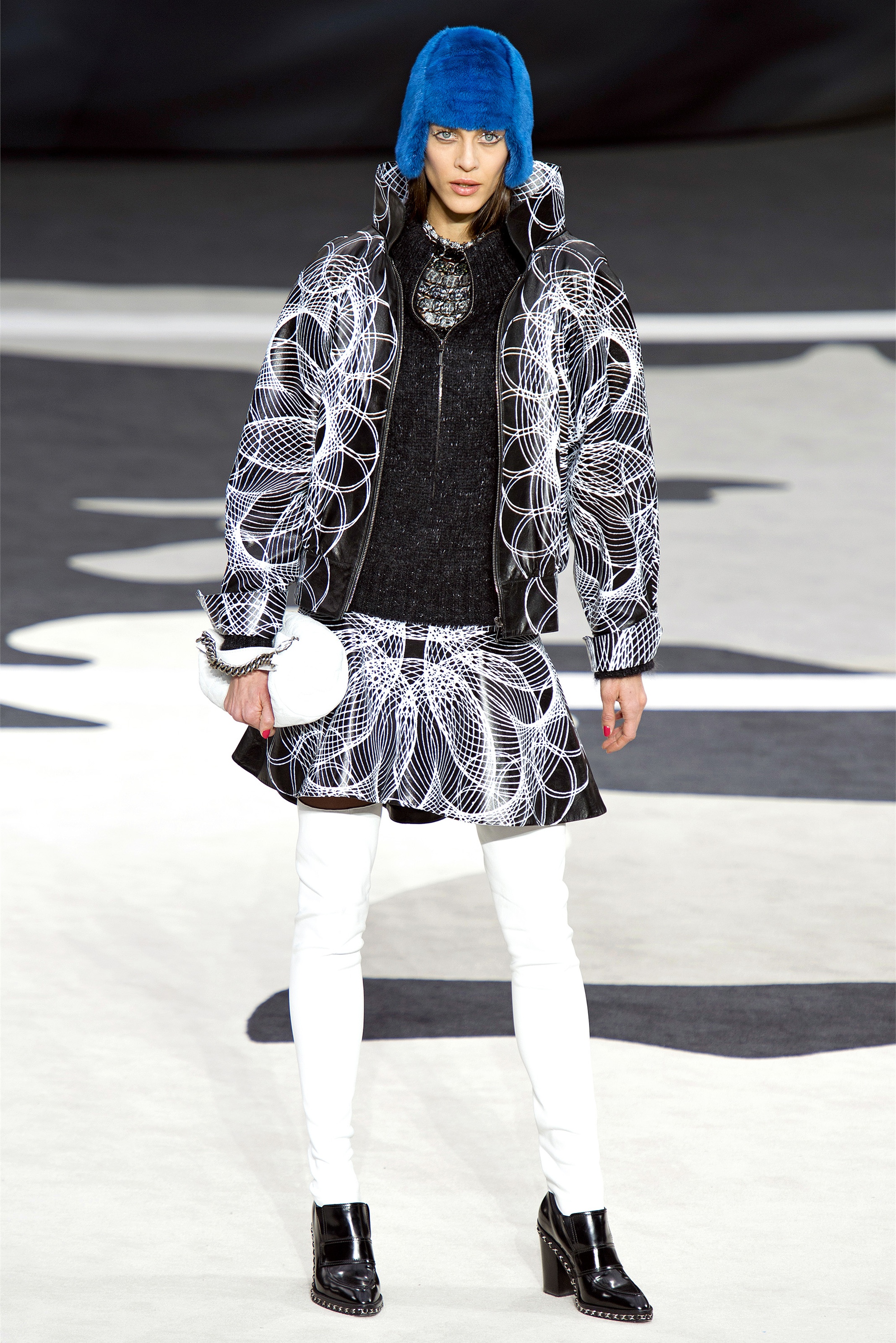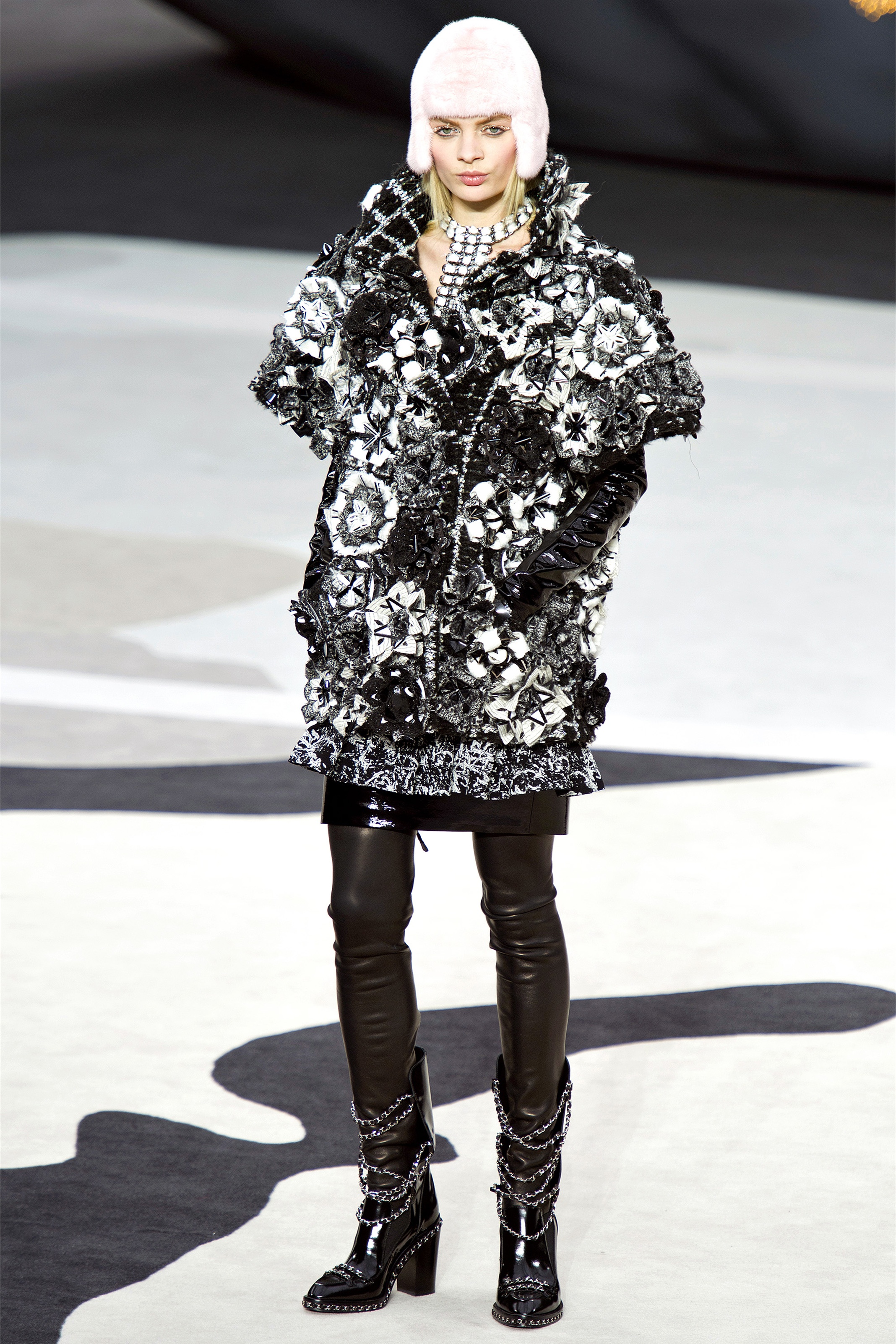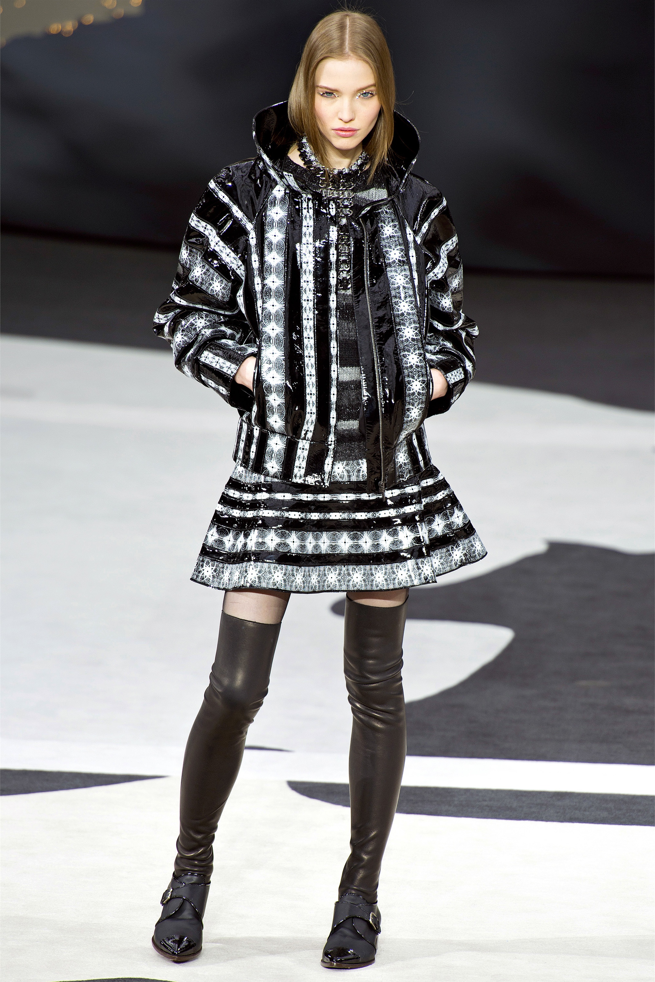 Even though it was night, the darkling was sparkling. "Not depressing," Lagerfeld emphasized. Tweeds glittered, metallic thread brought shine to wovens. Aymeline Valade was entangled in a wonderful, shiny spirographic web. The effect was a little starlight spacey, though that impression might also have been steered by the Cardin-esque helmets some of the models were wearing. (They were, said Lagerfeld, actually facsimiles, in fur, of Anna Wintour's iconic bob.)