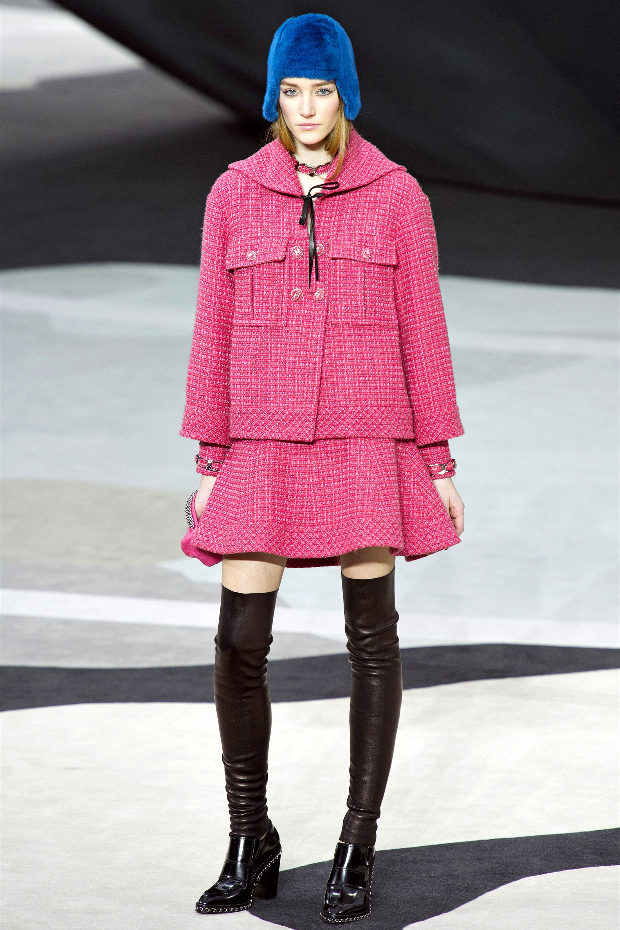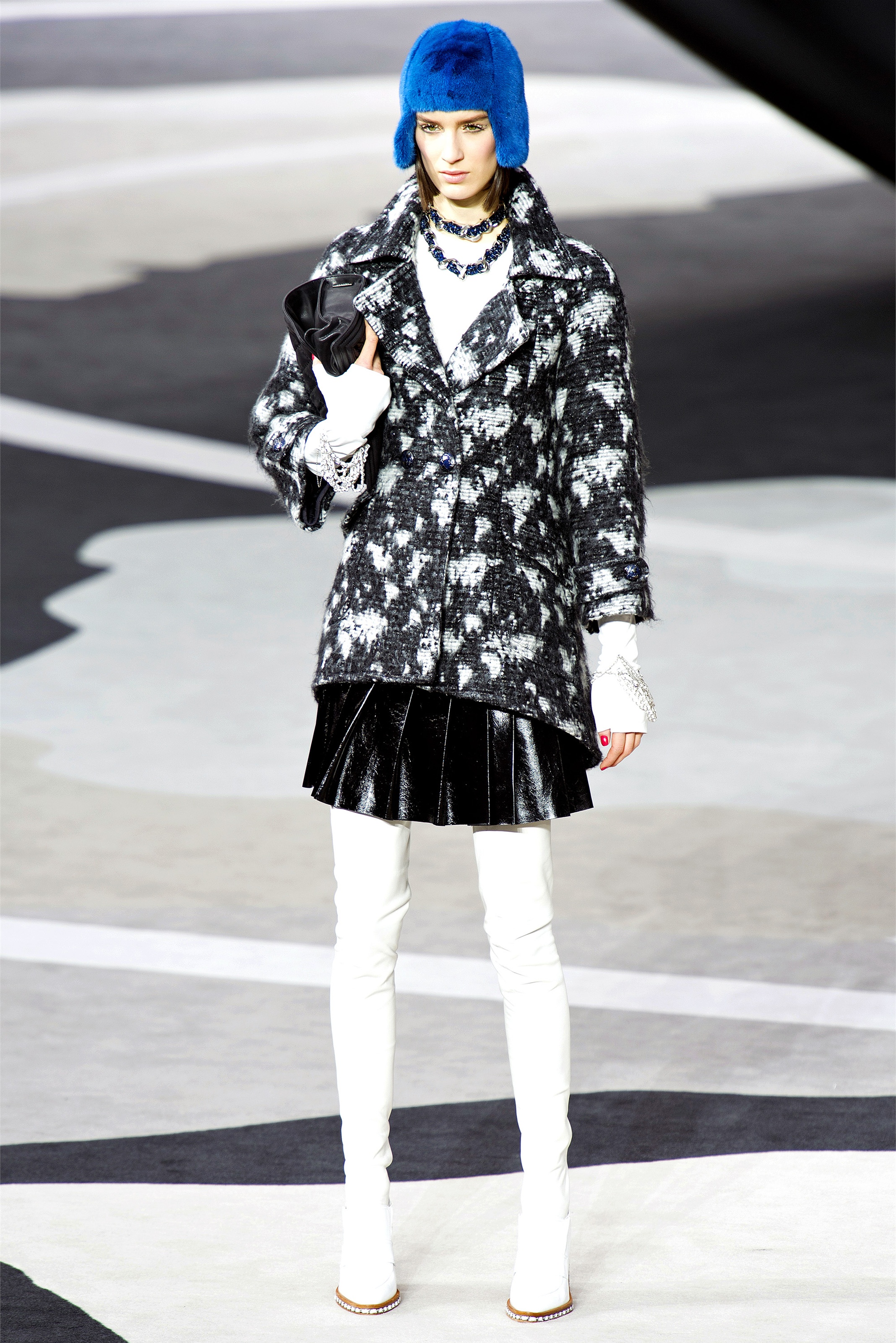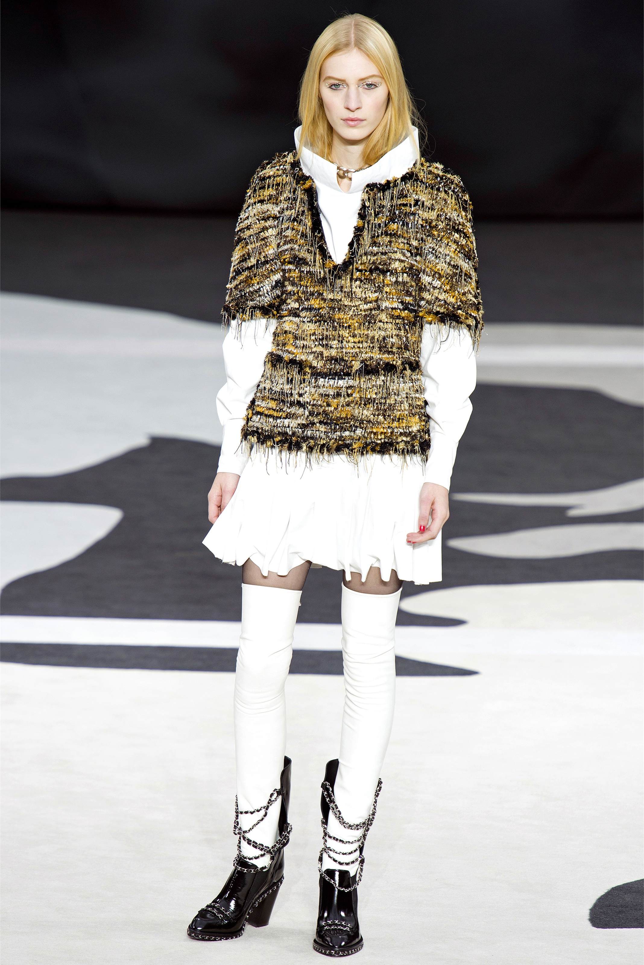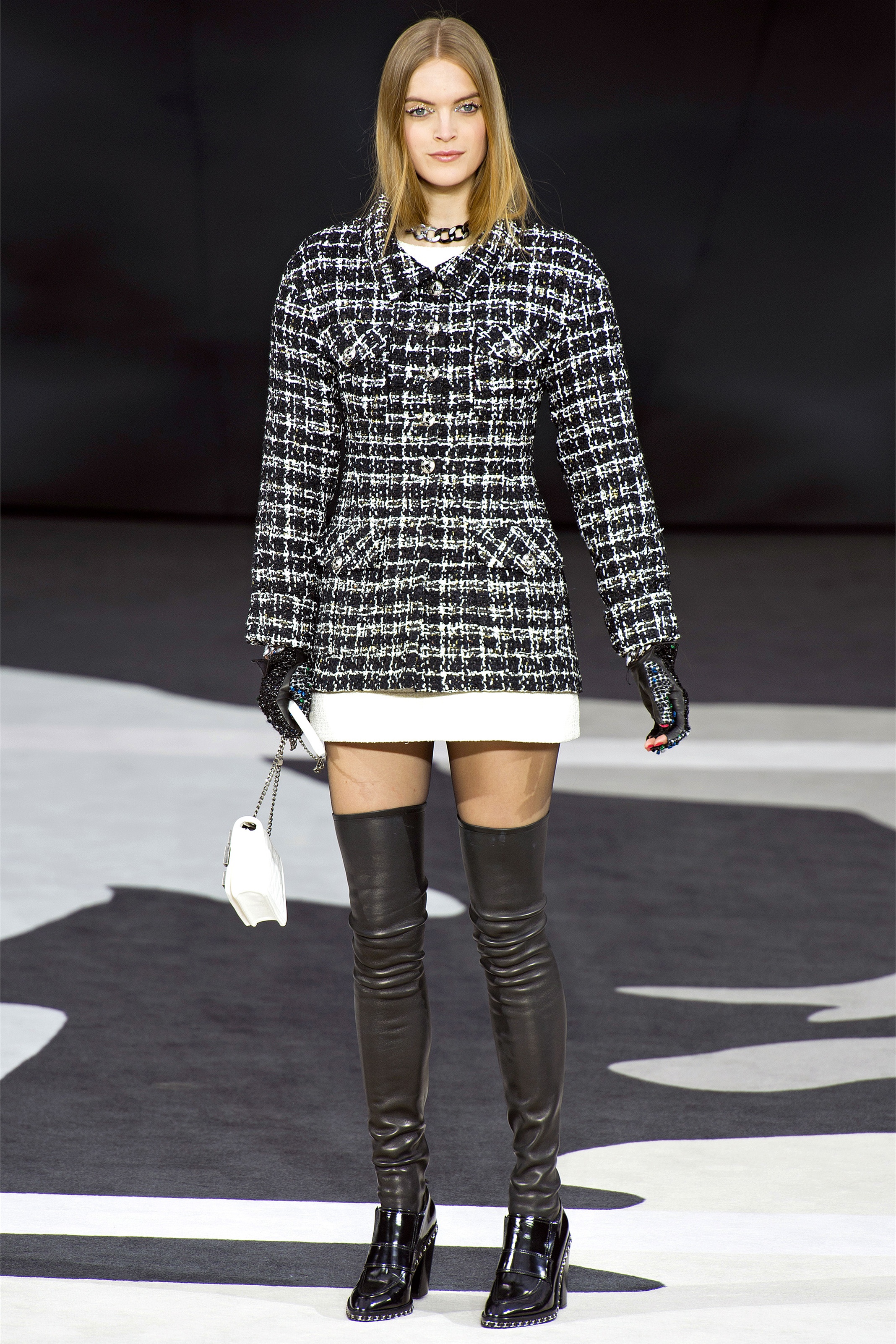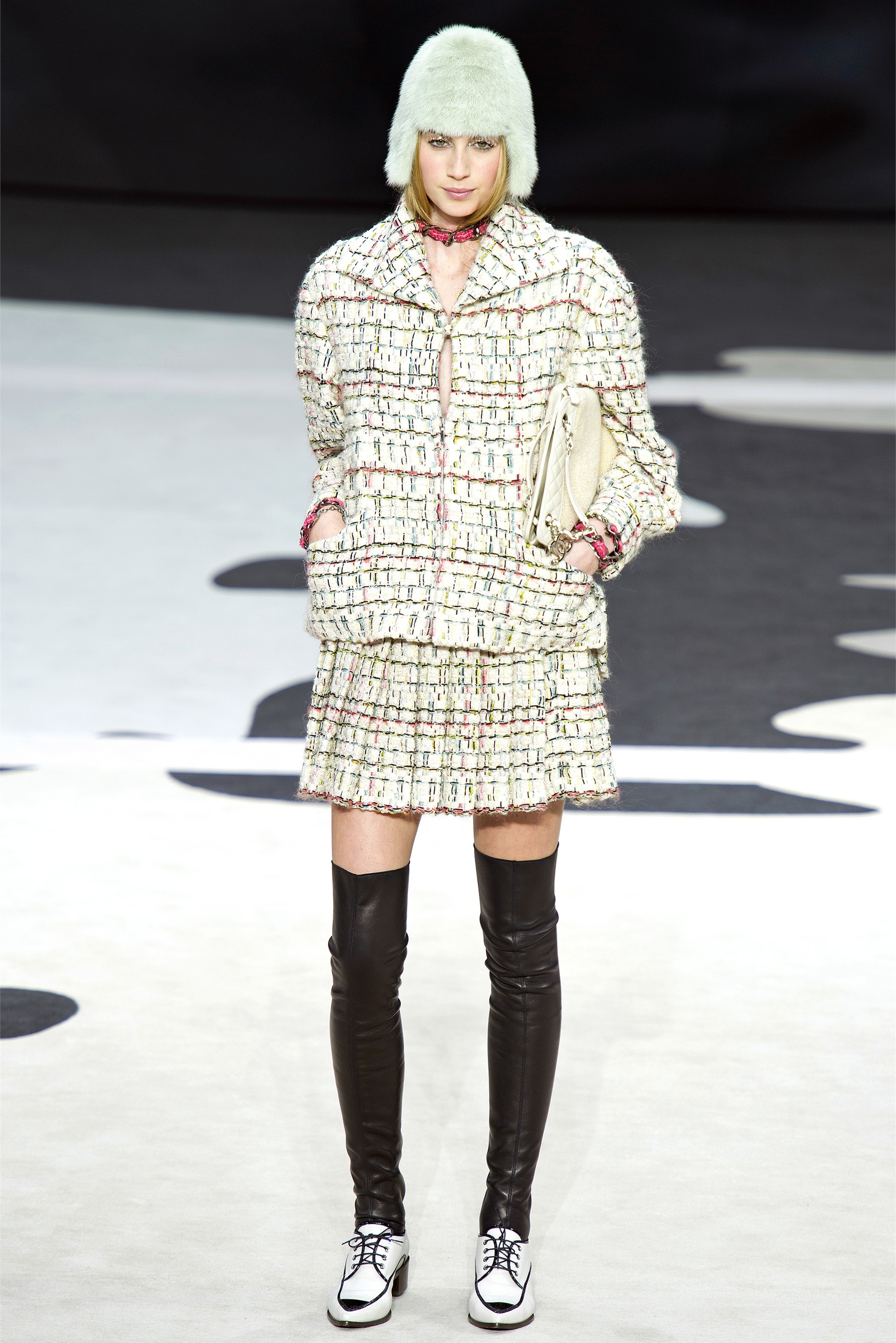 Even though it was night, the darkling was sparkling. "Not depressing," Lagerfeld emphasized. Tweeds glittered, metallic thread brought shine to wovens. Aymeline Valade was entangled in a wonderful, shiny spirographic web. The effect was a little starlight spacey, though that impression might also have been steered by the Cardin-esque helmets some of the models were wearing. (They were, said Lagerfeld, actually facsimiles, in fur, of Anna Wintour's iconic bob.)