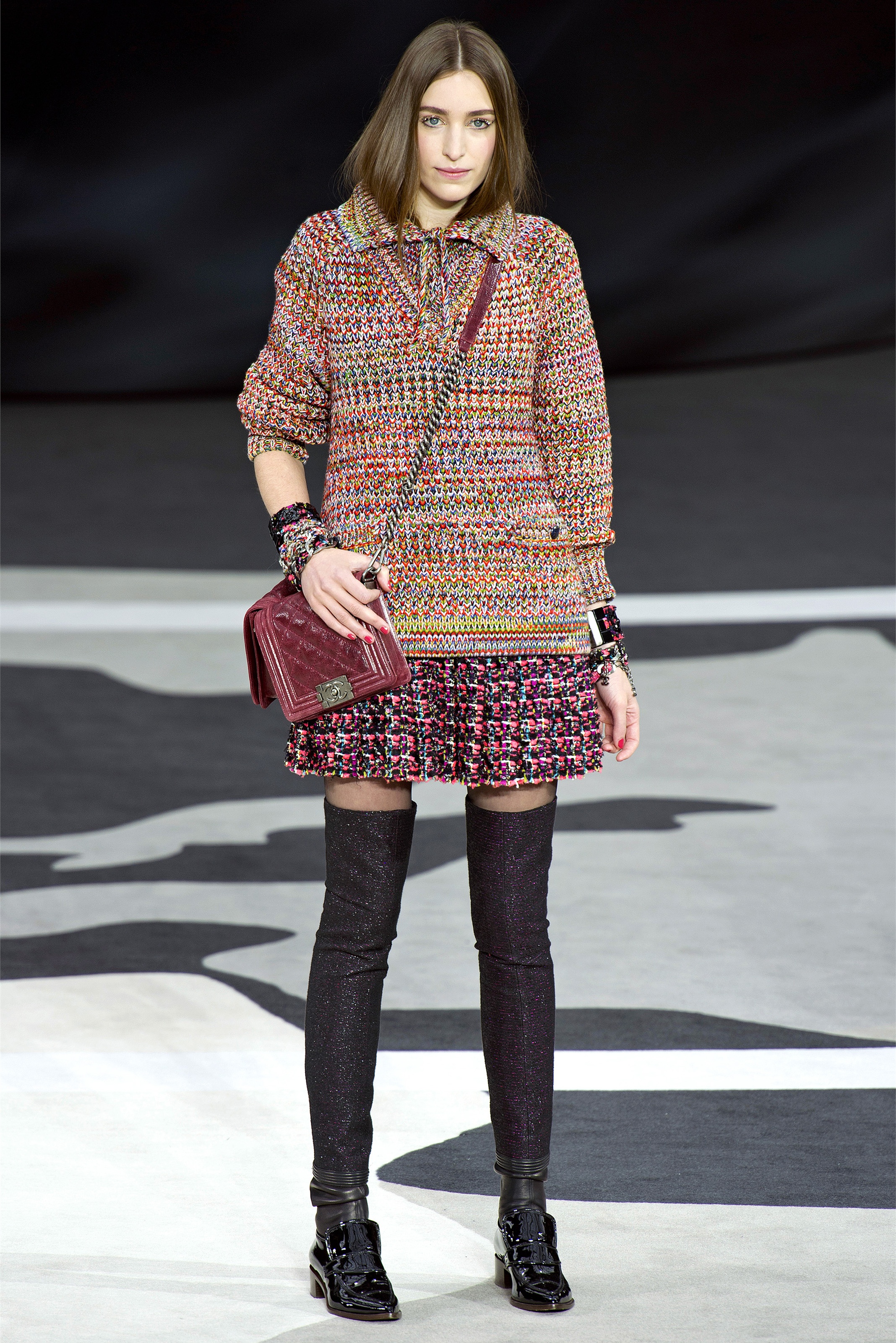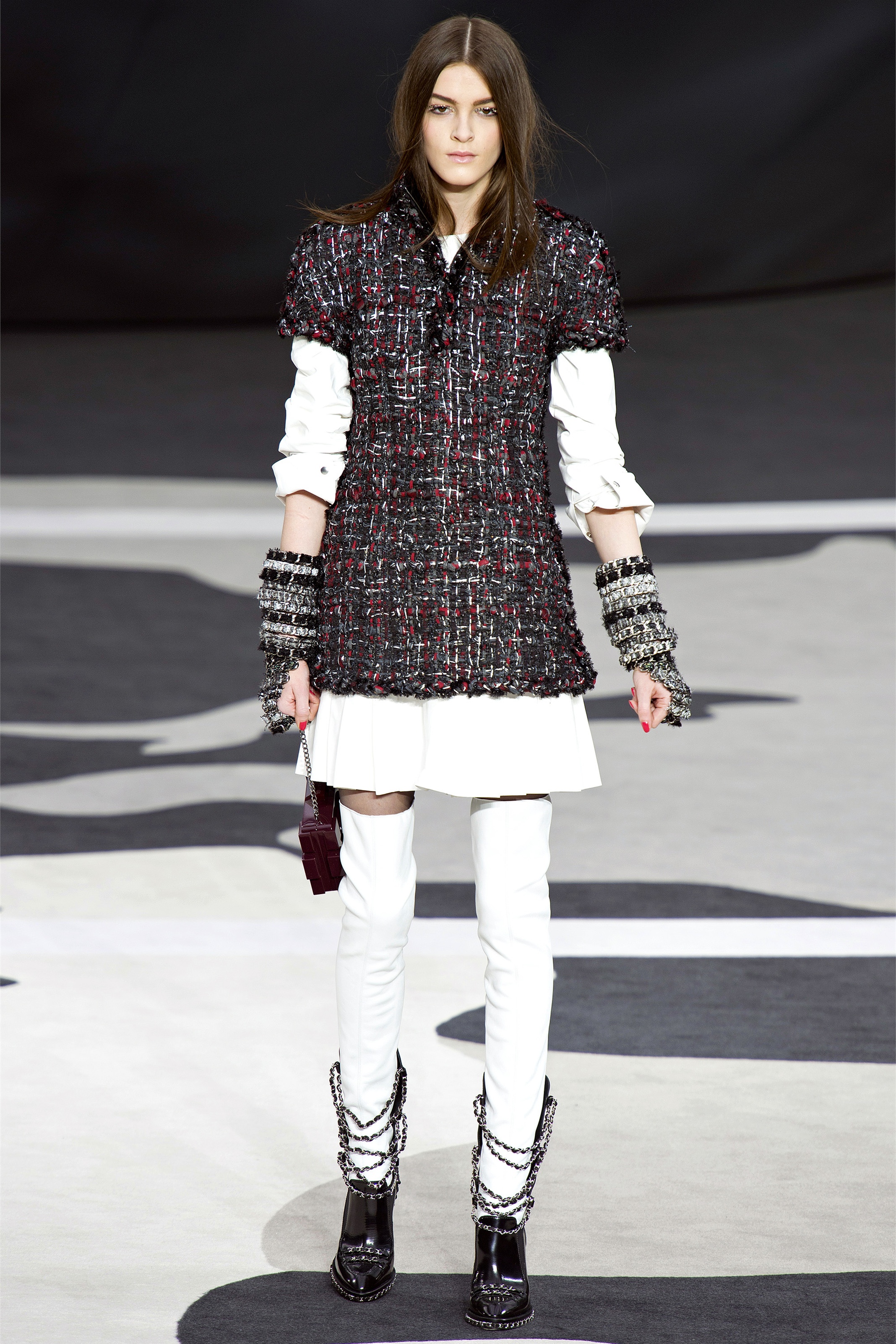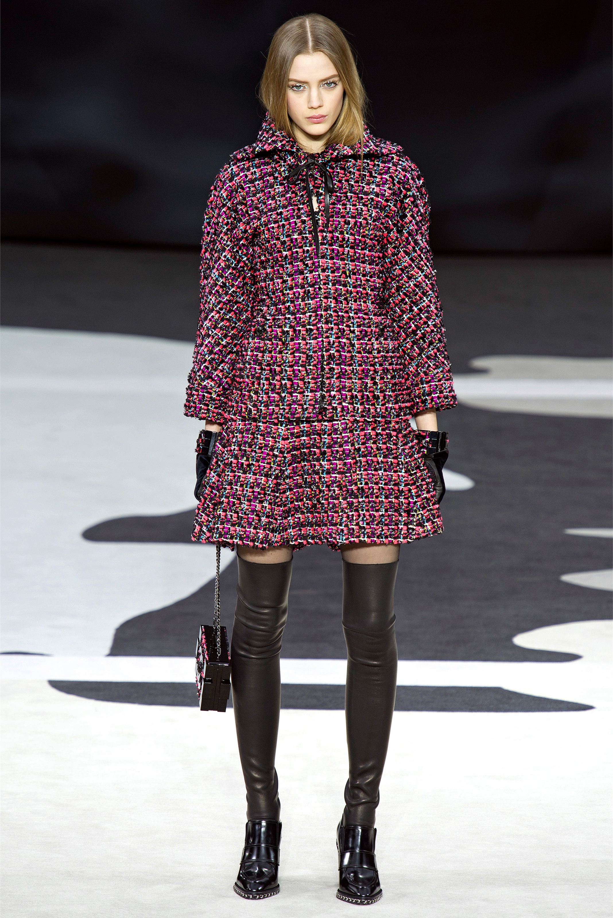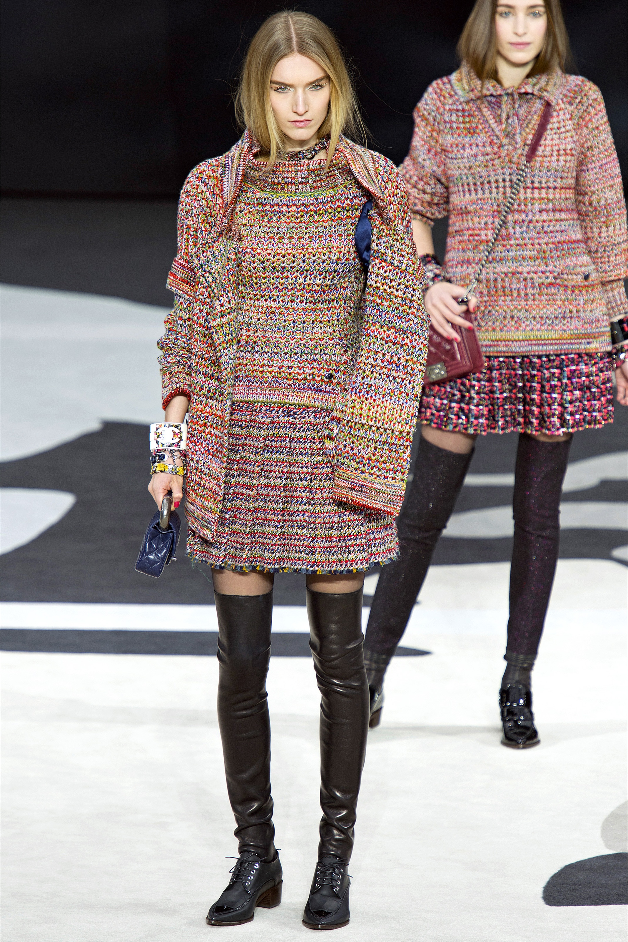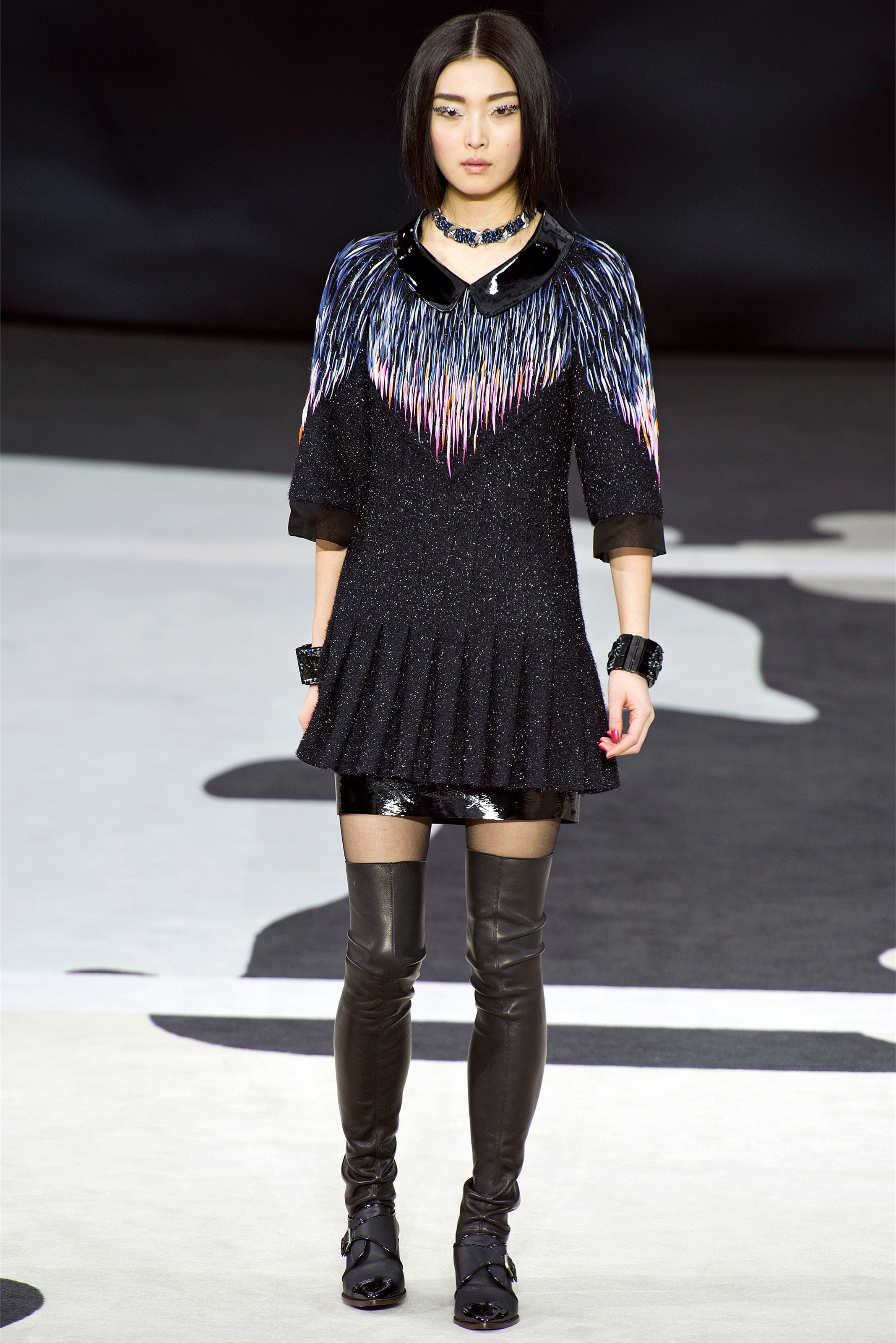 Even though it was night, the darkling was sparkling. "Not depressing," Lagerfeld emphasized. Tweeds glittered, metallic thread brought shine to wovens. Aymeline Valade was entangled in a wonderful, shiny spirographic web. The effect was a little starlight spacey, though that impression might also have been steered by the Cardin-esque helmets some of the models were wearing. (They were, said Lagerfeld, actually facsimiles, in fur, of Anna Wintour's iconic bob.)
