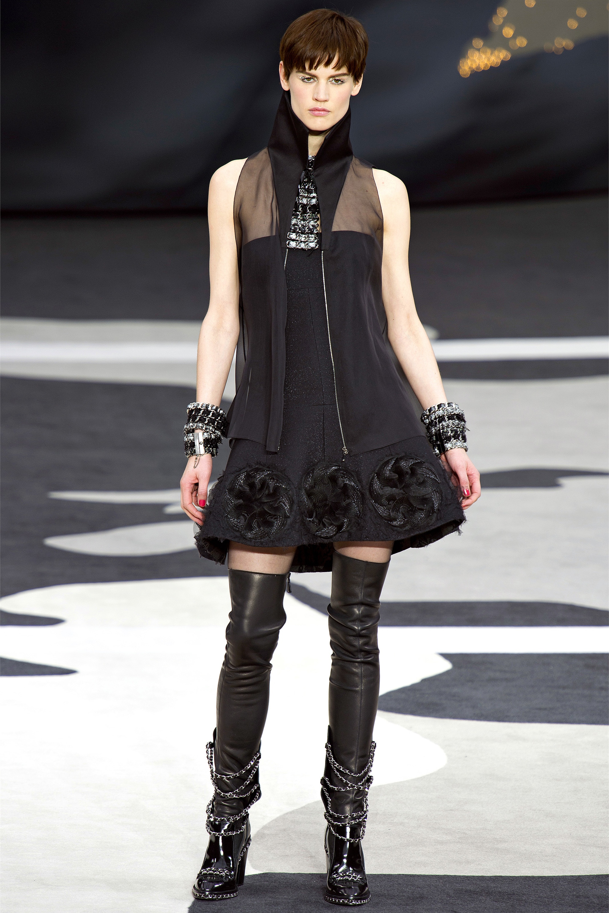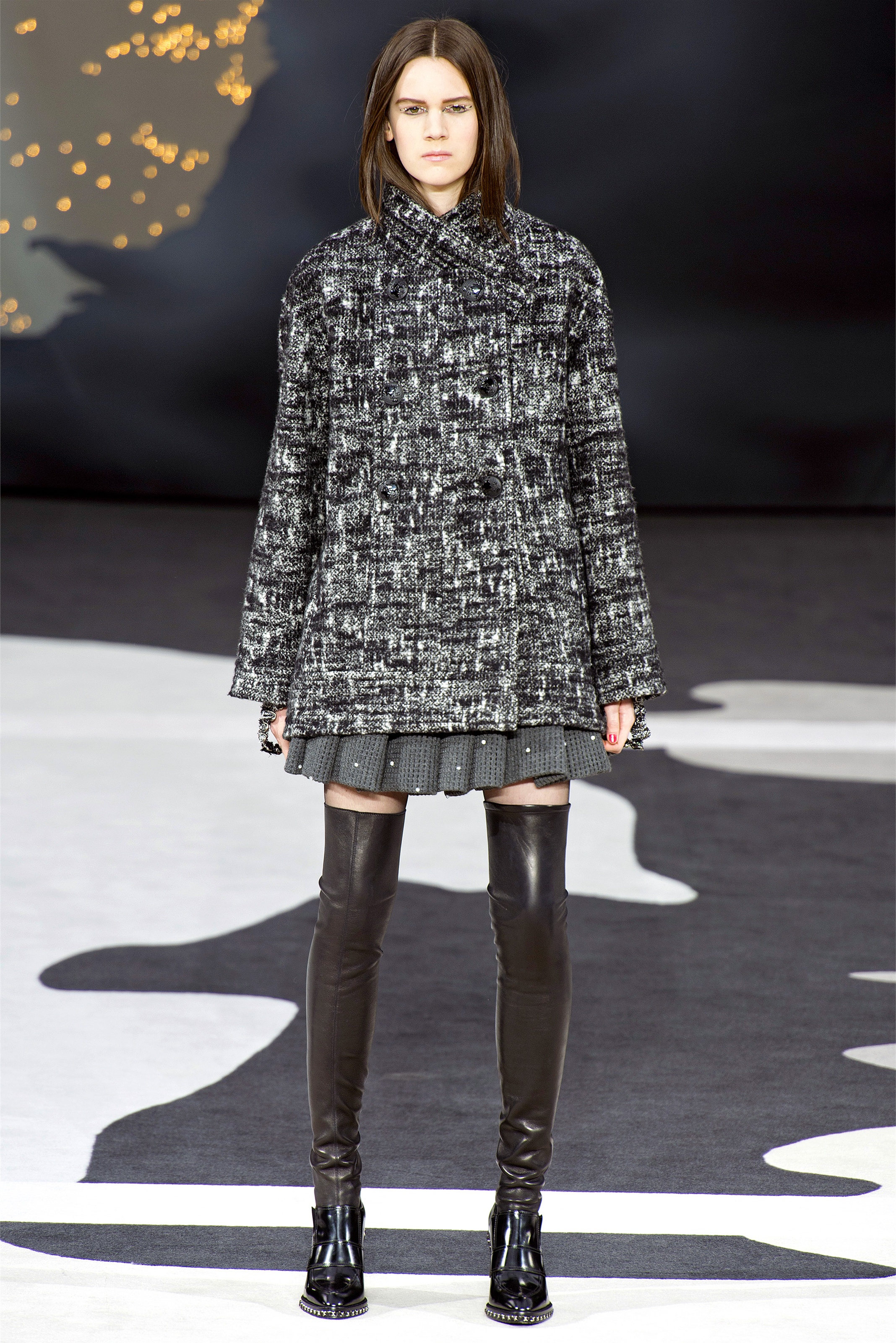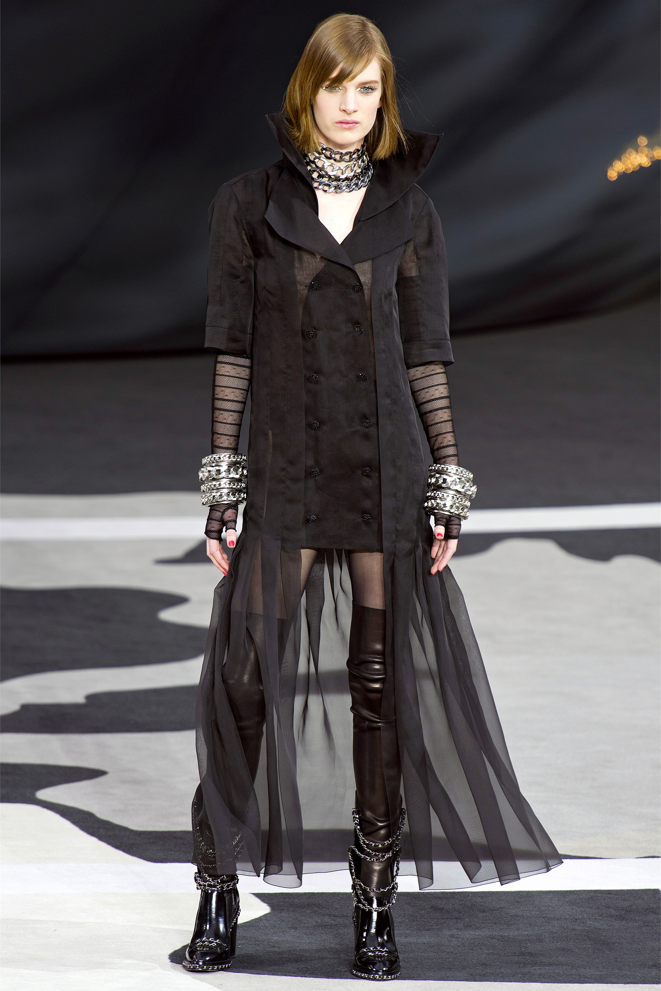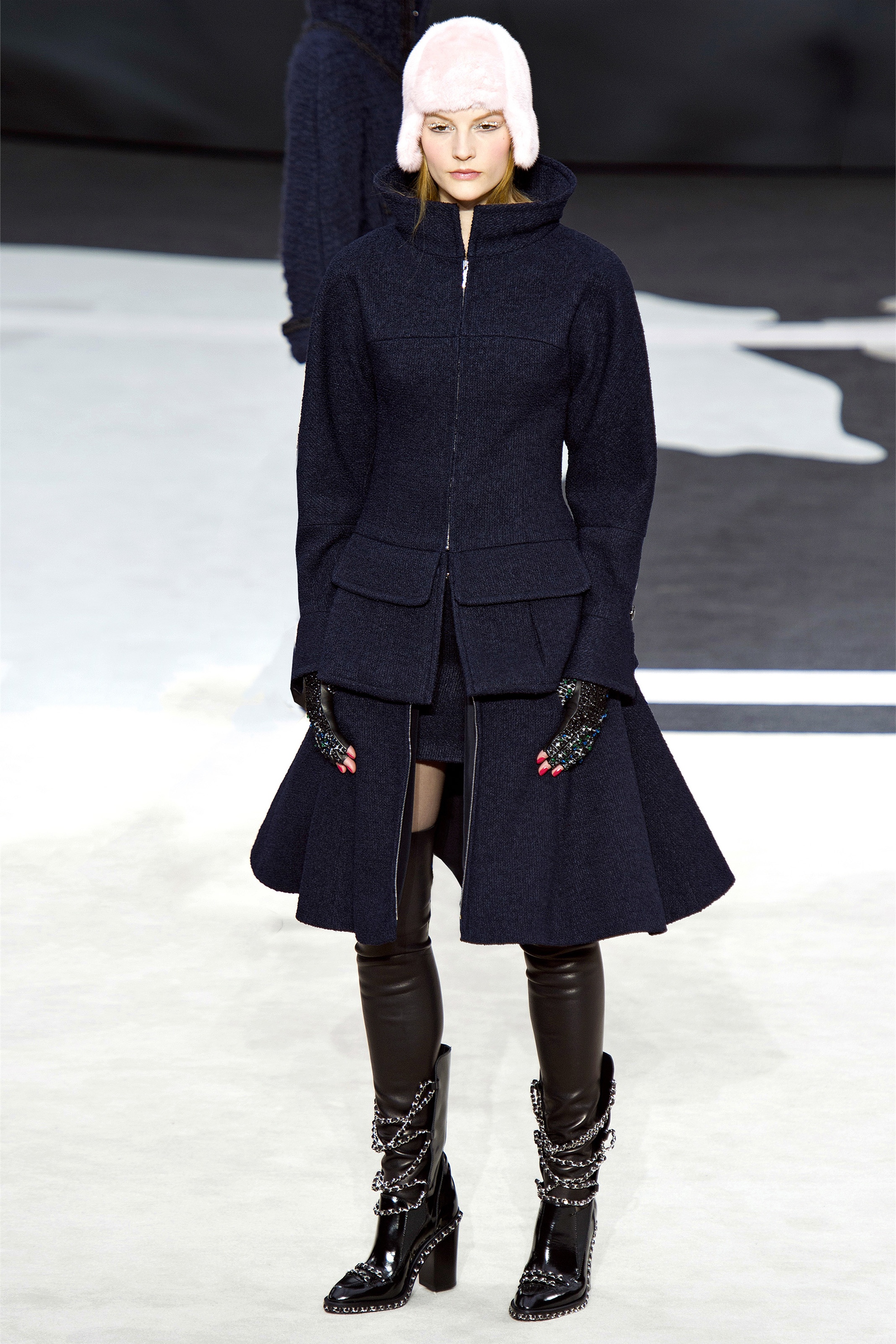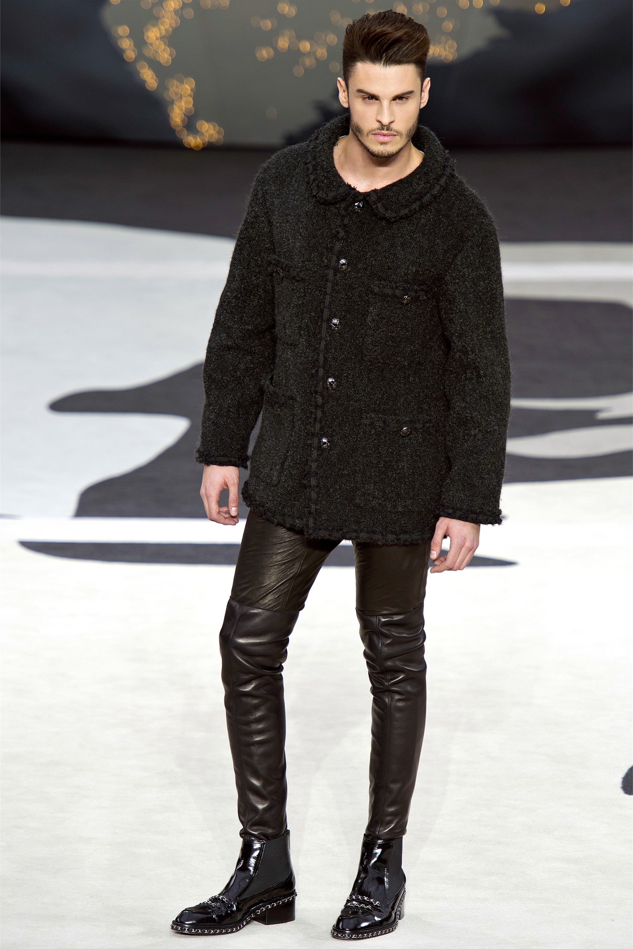 Bouncy confidence hasn't always produced convincing Chanel shows, but here there was a sepulchral undercurrent that was utterly seductive. The globe was dark, as though night had fallen on the world. The clothes were dark, too. And lean: a favorite silhouette fitted to the hip, then flared into a short skirt over leather cuissardes (so much better-sounding than their literal English translation, "waders"). The other key shape was equally streamlined, cut high on the thigh at the front, dipping to mid-calf at the back. This mutant redingote had a slightly libertine flair, which felt more Karl than Coco.