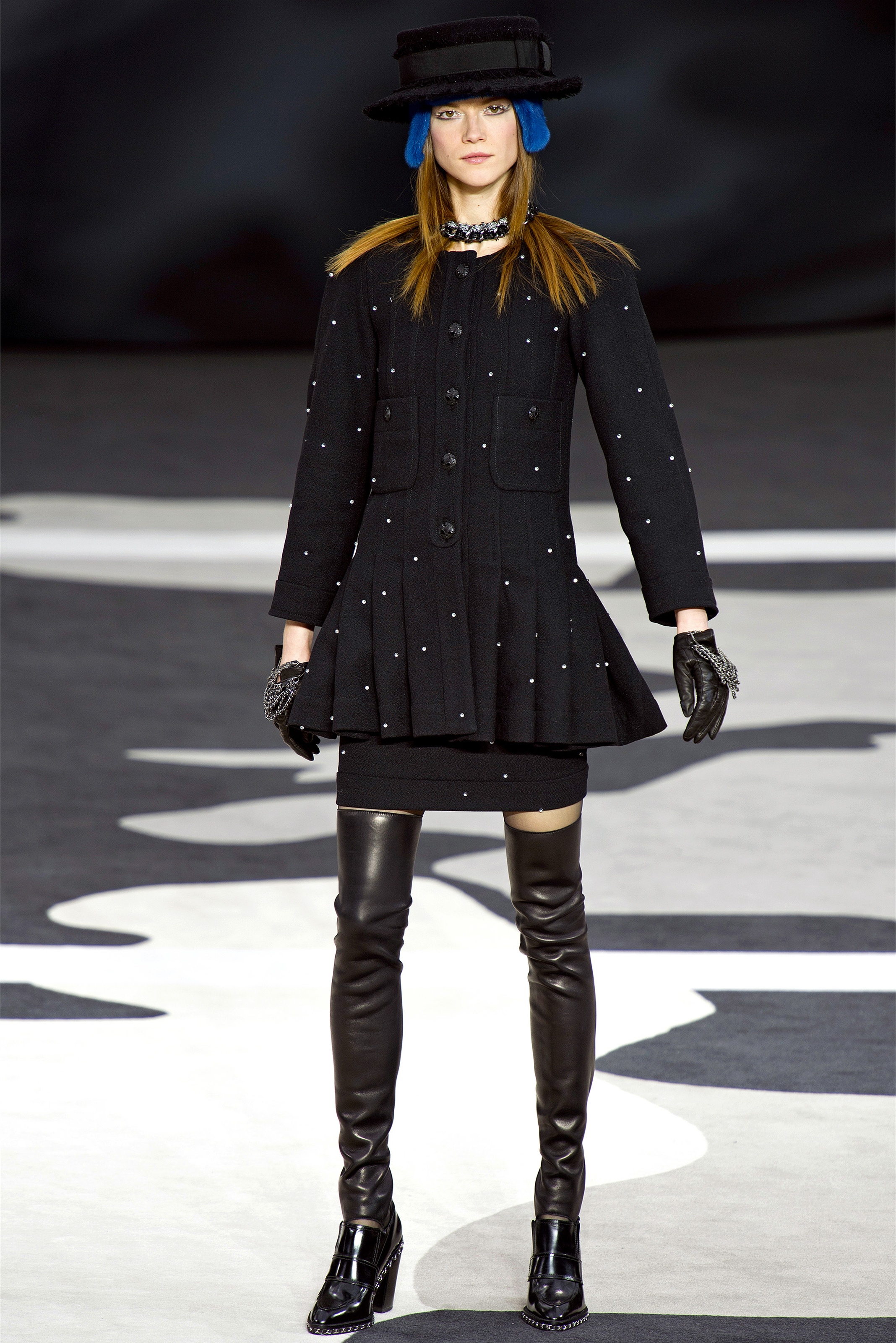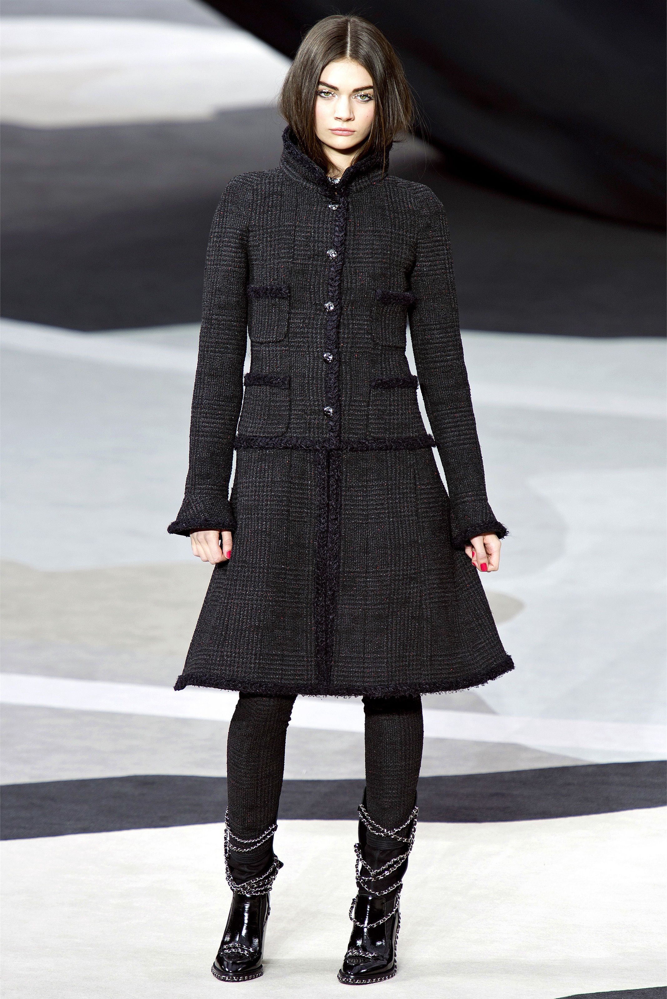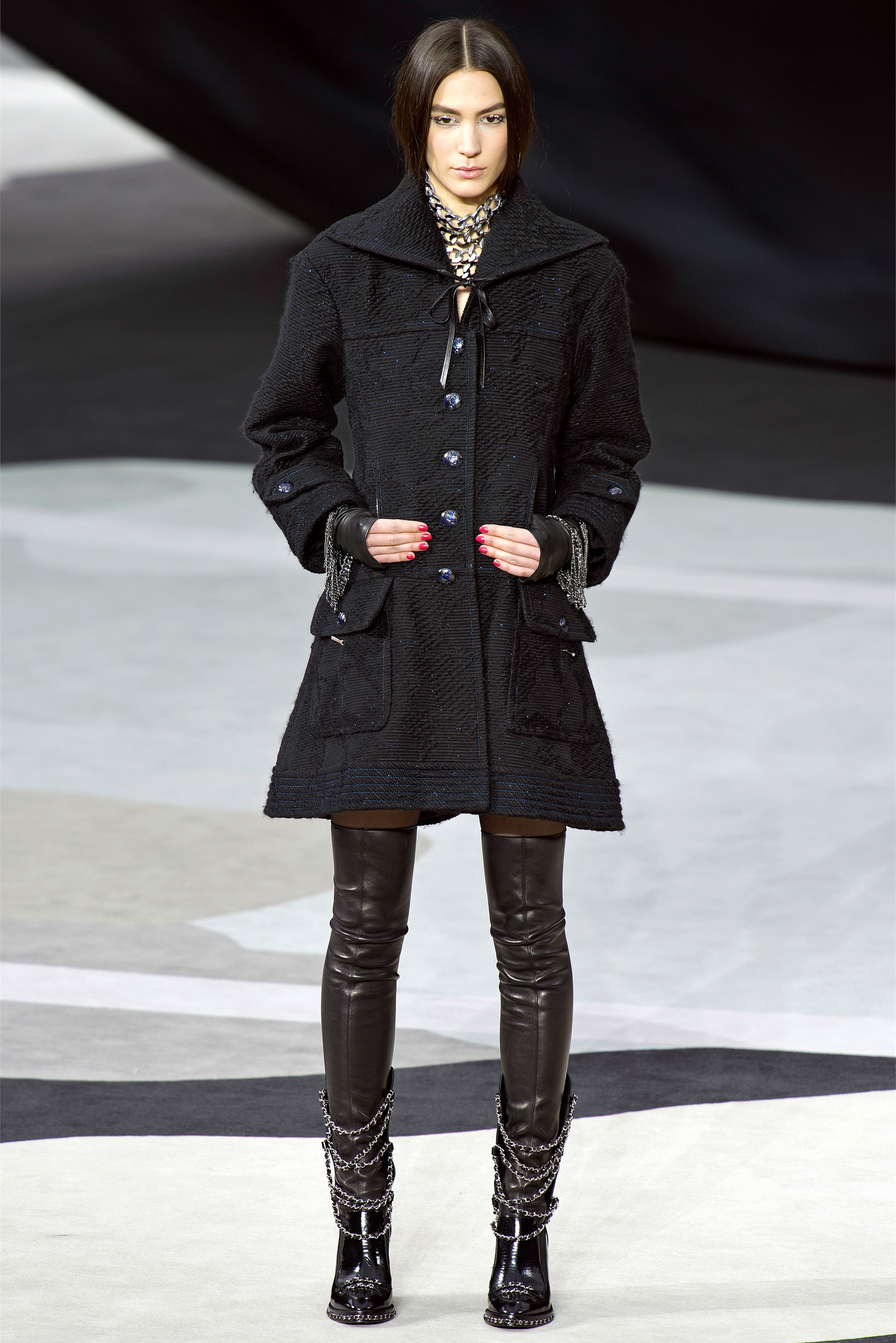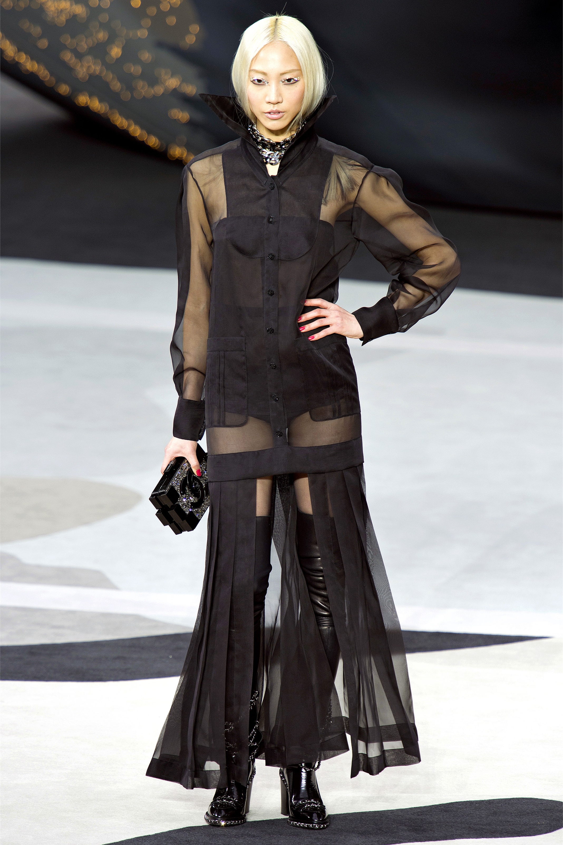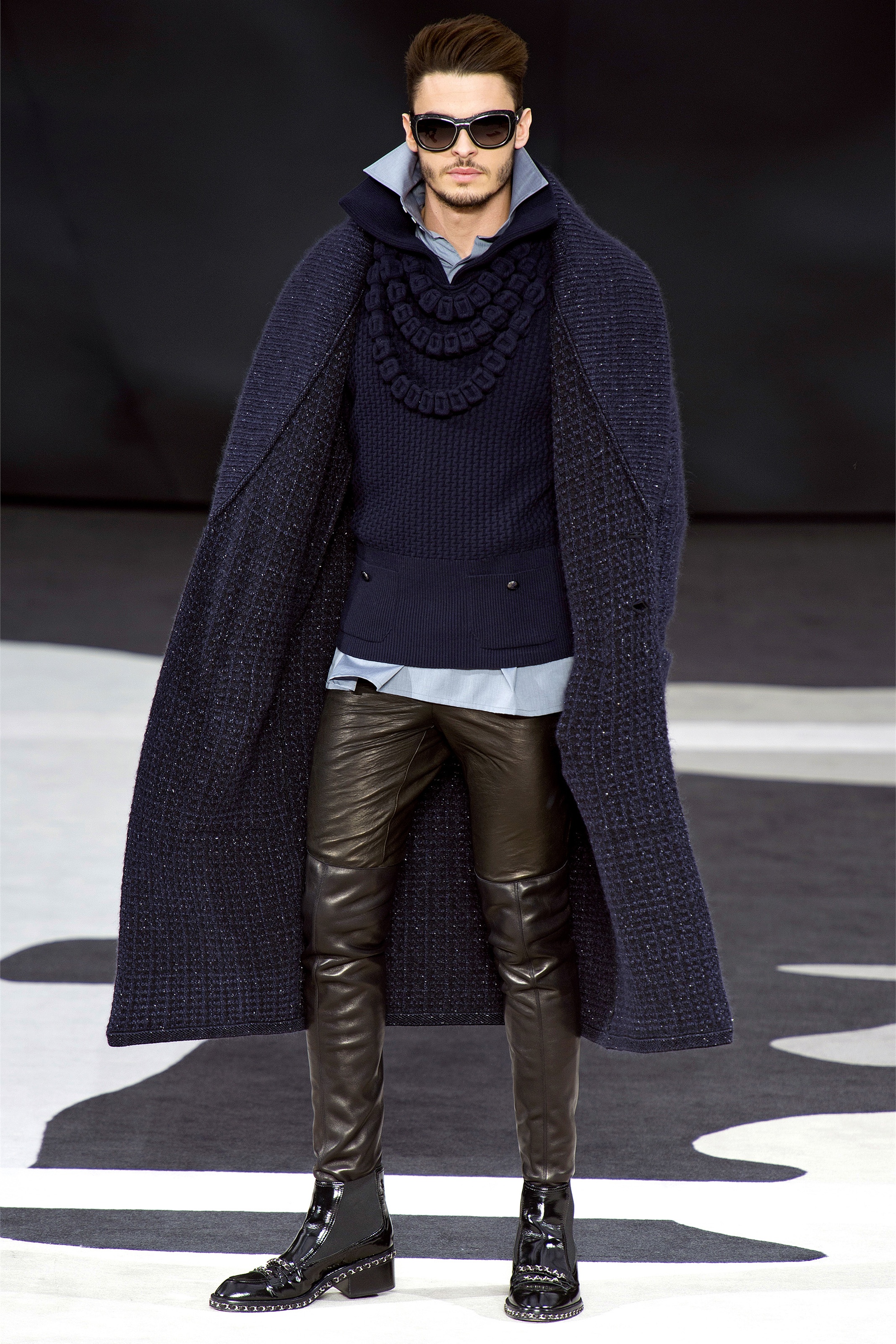 Bouncy confidence hasn't always produced convincing Chanel shows, but here there was a sepulchral undercurrent that was utterly seductive. The globe was dark, as though night had fallen on the world. The clothes were dark, too. And lean: a favorite silhouette fitted to the hip, then flared into a short skirt over leather cuissardes (so much better-sounding than their literal English translation, "waders"). The other key shape was equally streamlined, cut high on the thigh at the front, dipping to mid-calf at the back. This mutant redingote had a slightly libertine flair, which felt more Karl than Coco.