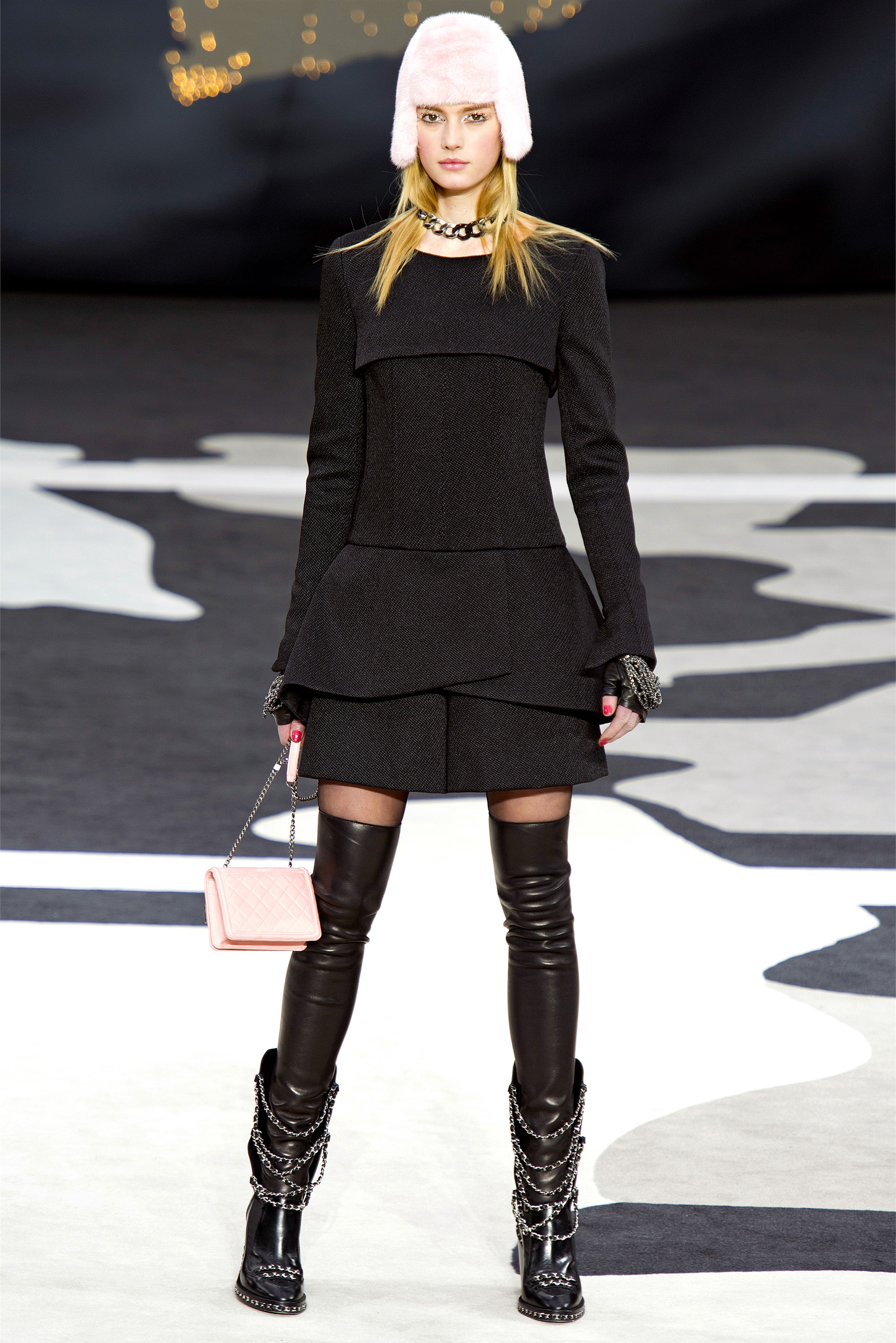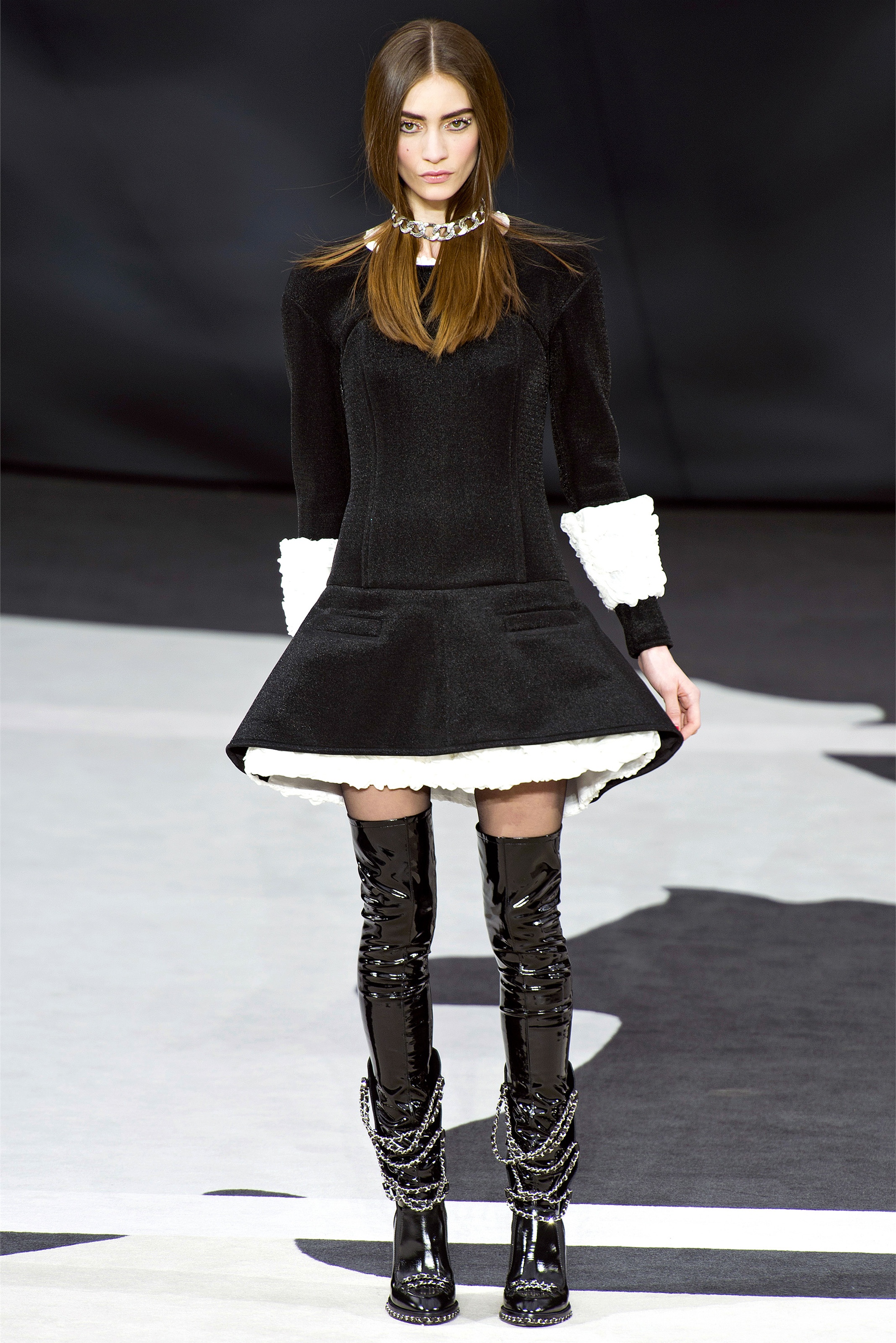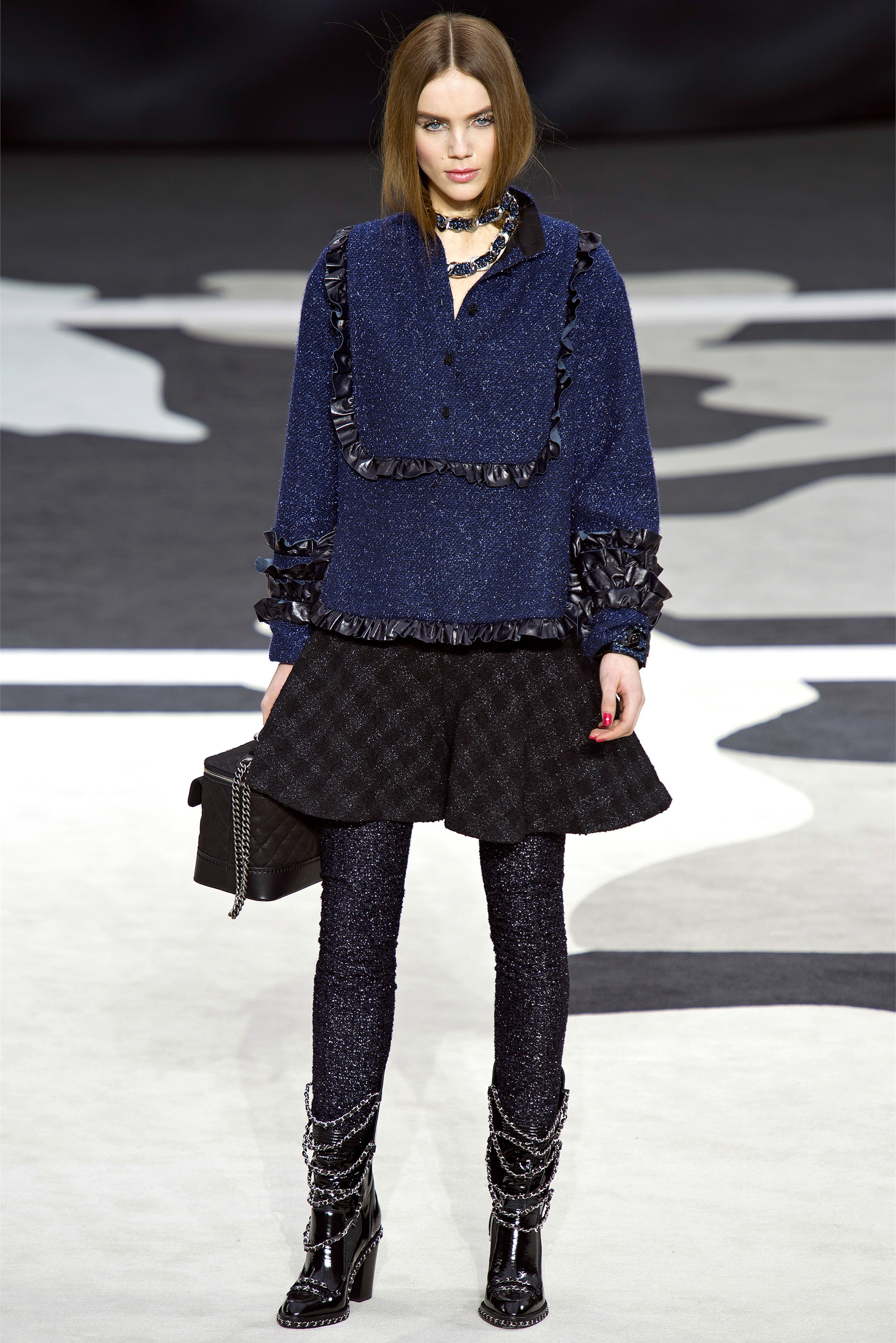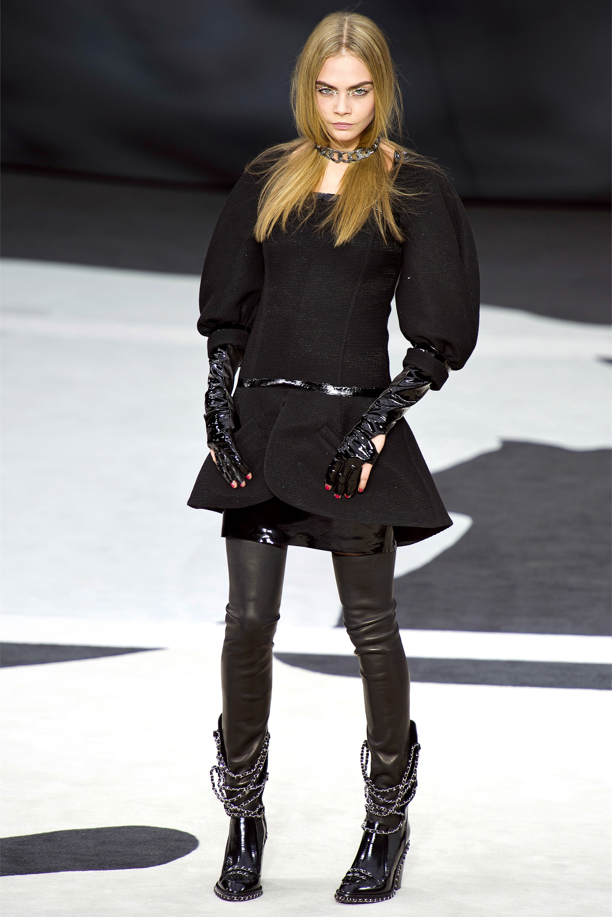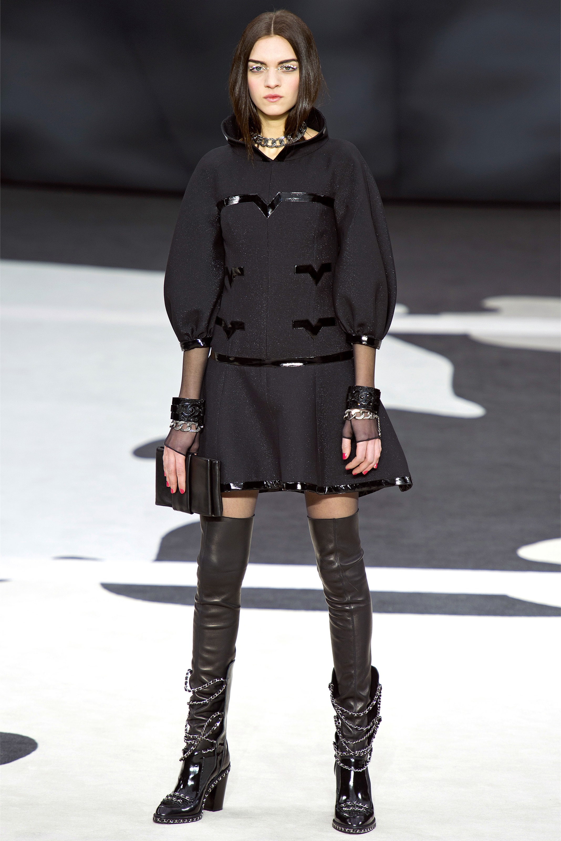 Bouncy confidence hasn't always produced convincing Chanel shows, but here there was a sepulchral undercurrent that was utterly seductive. The globe was dark, as though night had fallen on the world. The clothes were dark, too. And lean: a favorite silhouette fitted to the hip, then flared into a short skirt over leather cuissardes (so much better-sounding than their literal English translation, "waders"). The other key shape was equally streamlined, cut high on the thigh at the front, dipping to mid-calf at the back. This mutant redingote had a slightly libertine flair, which felt more Karl than Coco.
