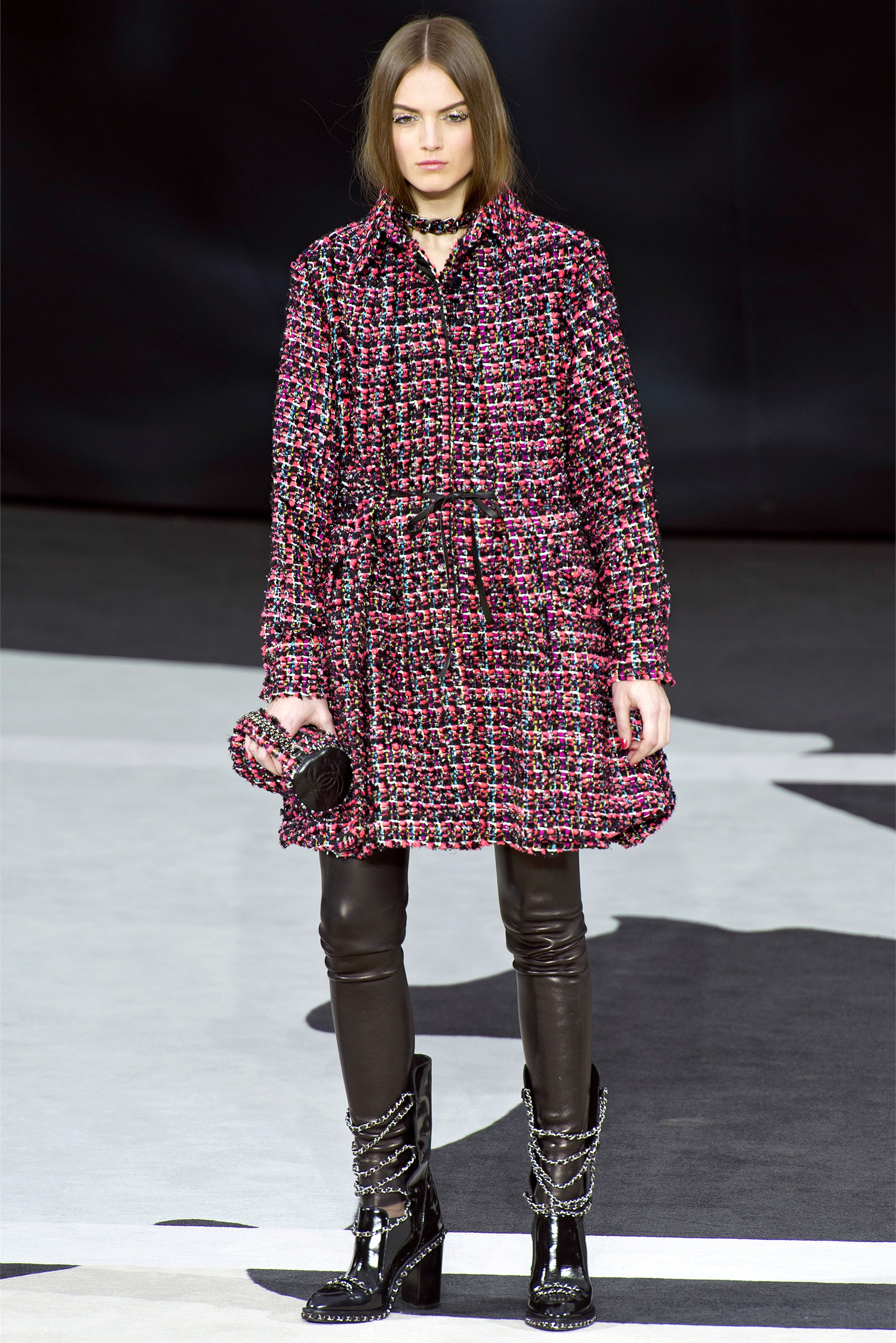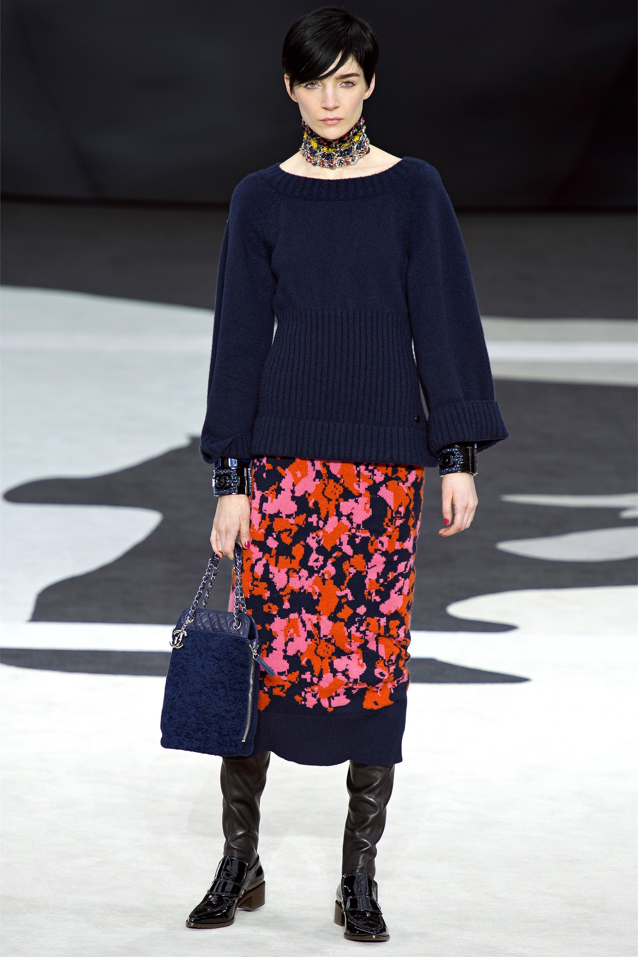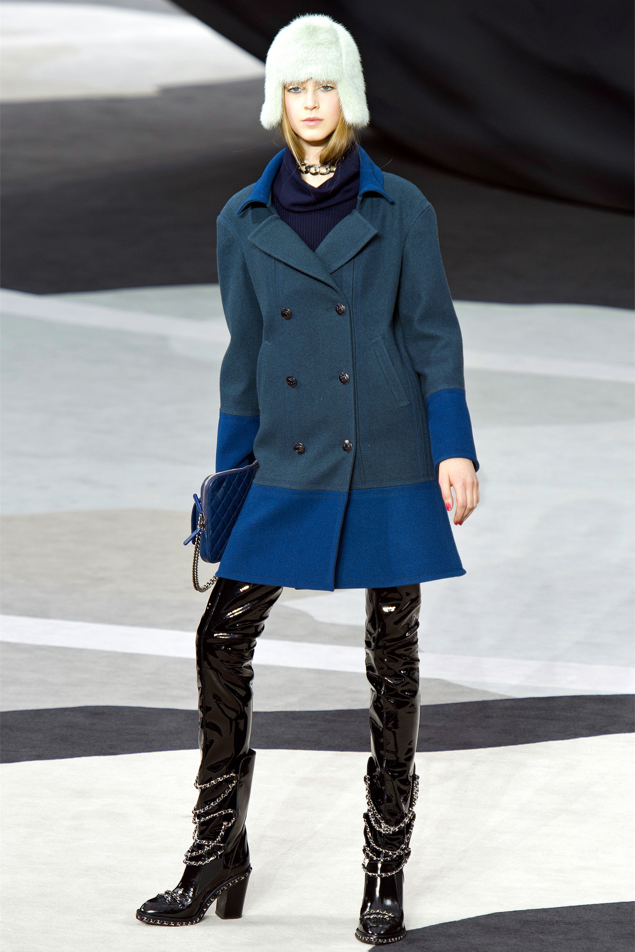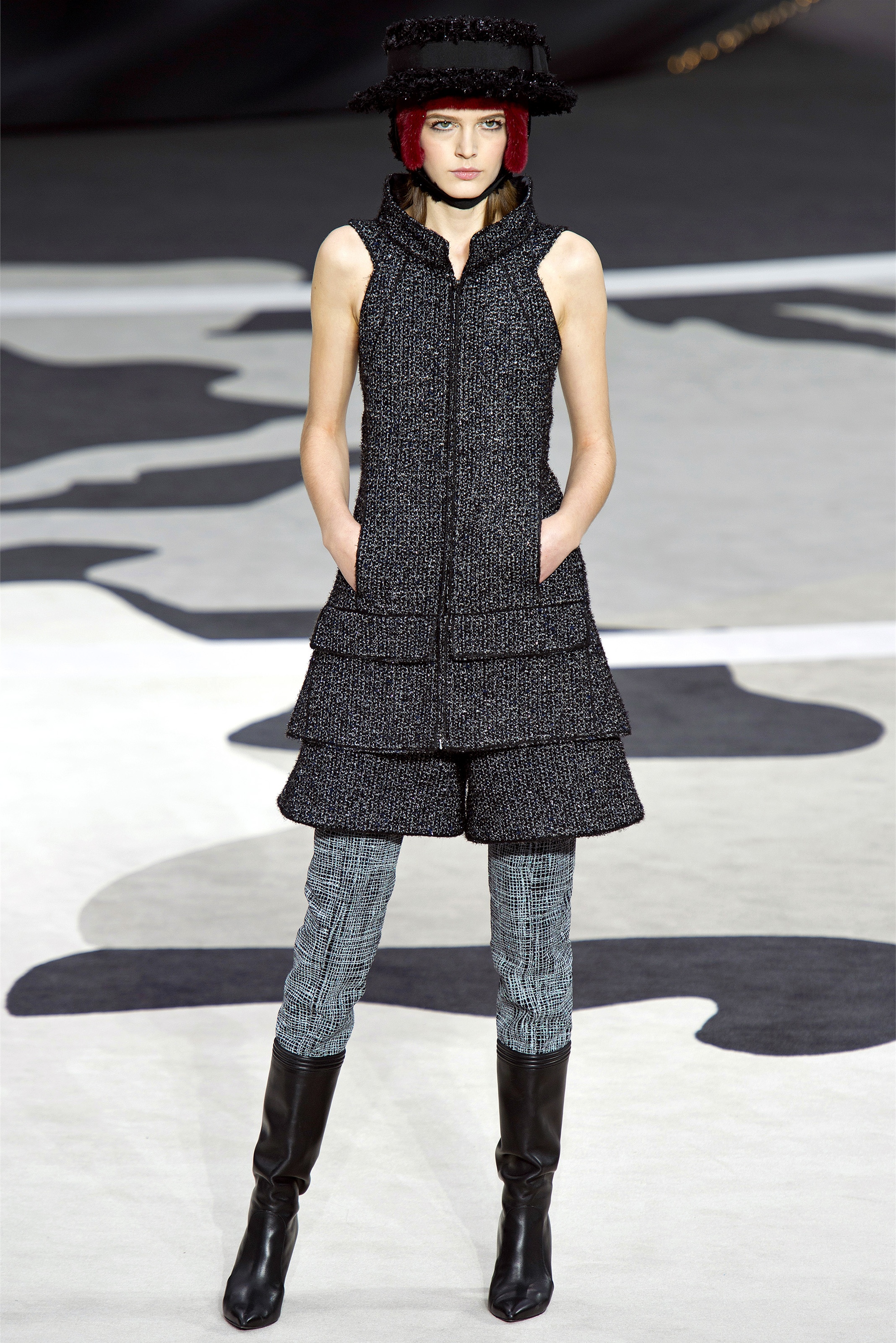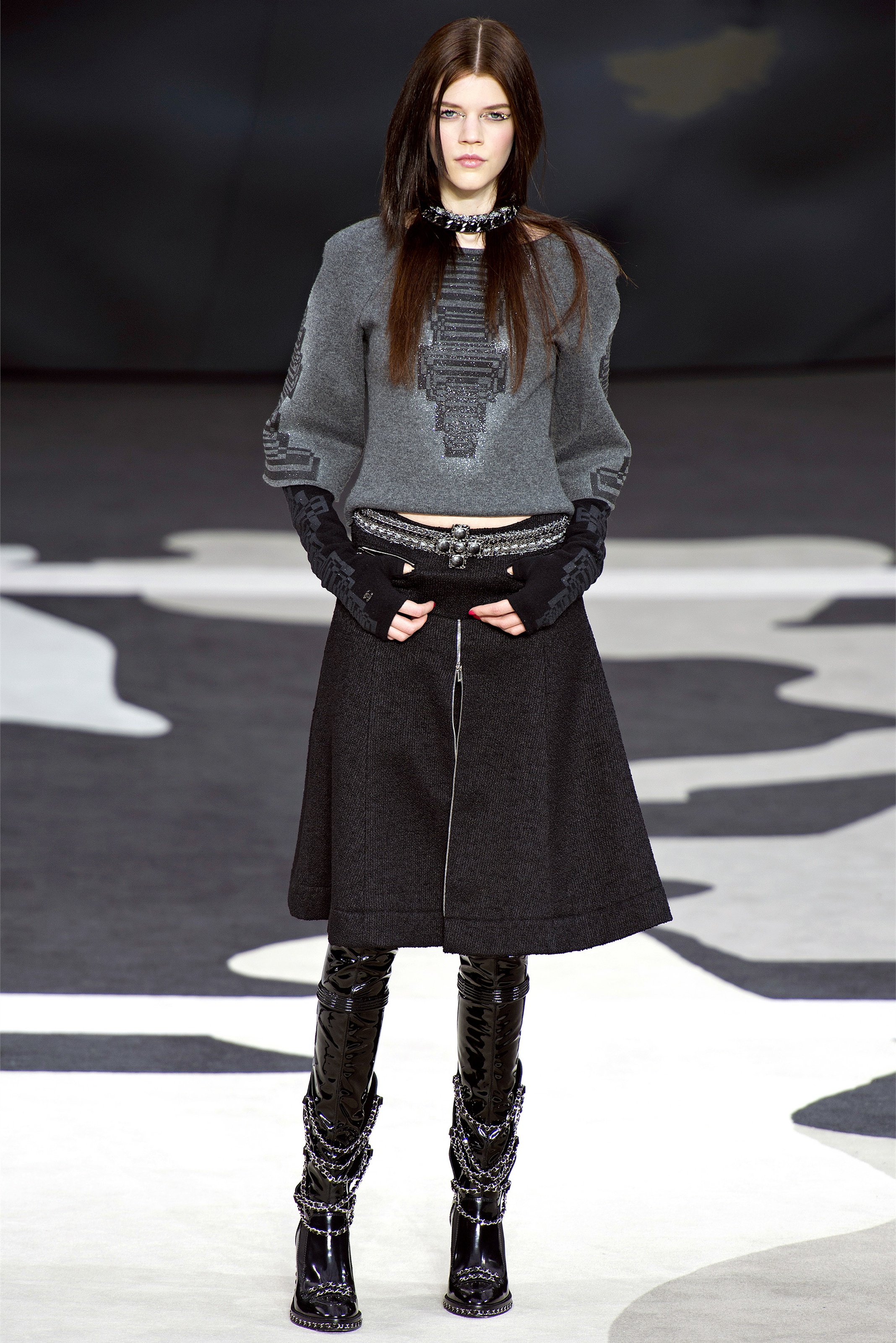 Bouncy confidence hasn't always produced convincing Chanel shows, but here there was a sepulchral undercurrent that was utterly seductive. The globe was dark, as though night had fallen on the world. The clothes were dark, too. And lean: a favorite silhouette fitted to the hip, then flared into a short skirt over leather cuissardes (so much better-sounding than their literal English translation, "waders"). The other key shape was equally streamlined, cut high on the thigh at the front, dipping to mid-calf at the back. This mutant redingote had a slightly libertine flair, which felt more Karl than Coco.