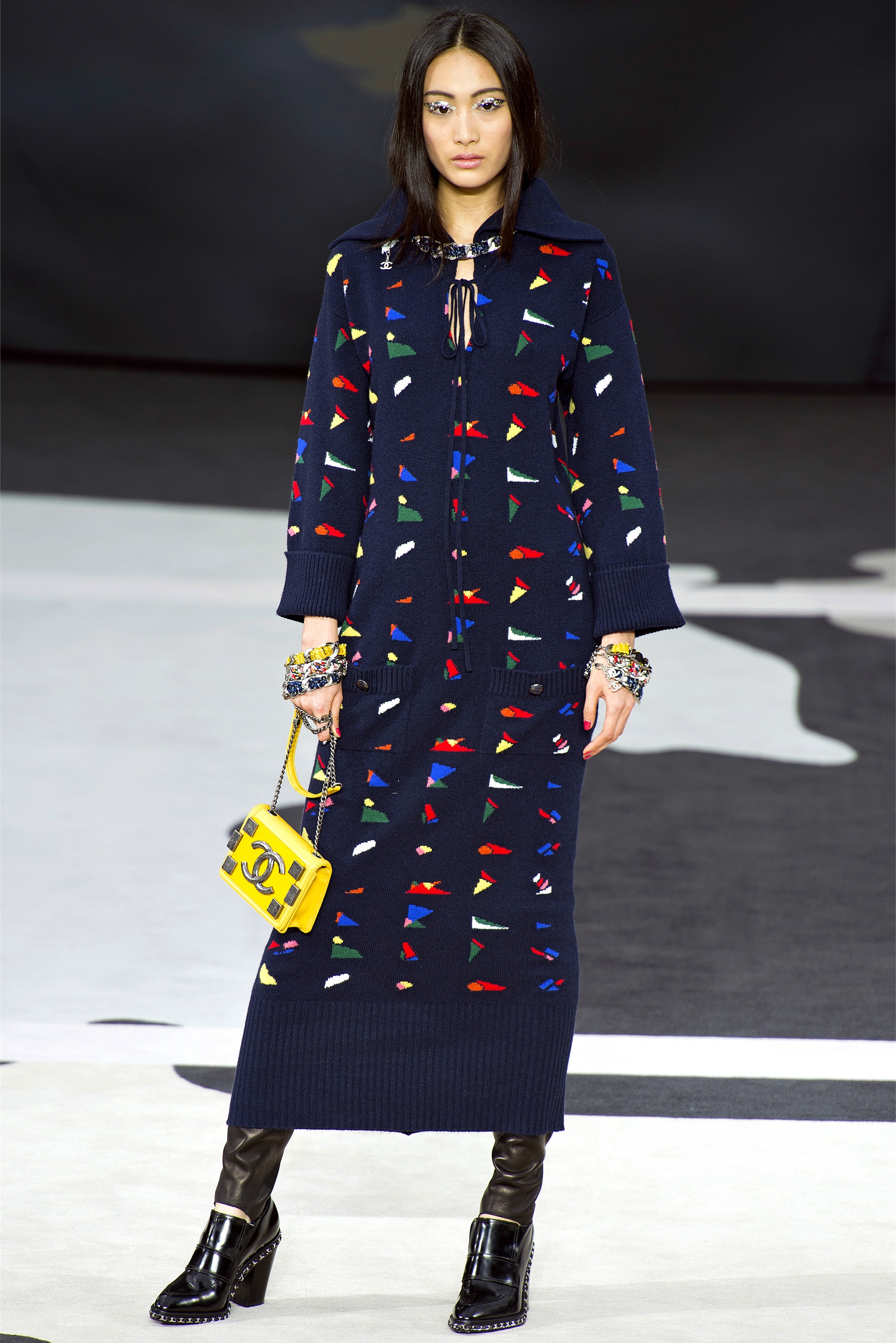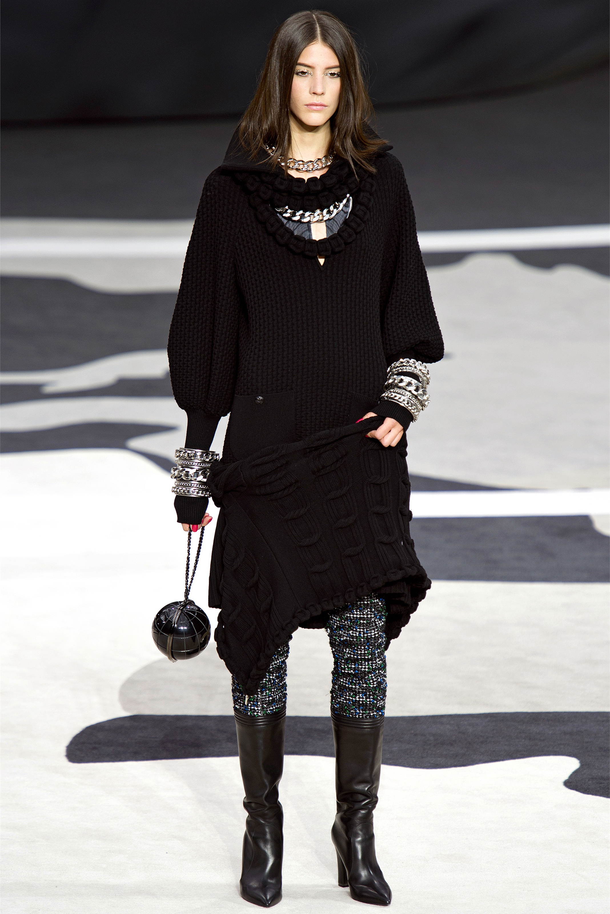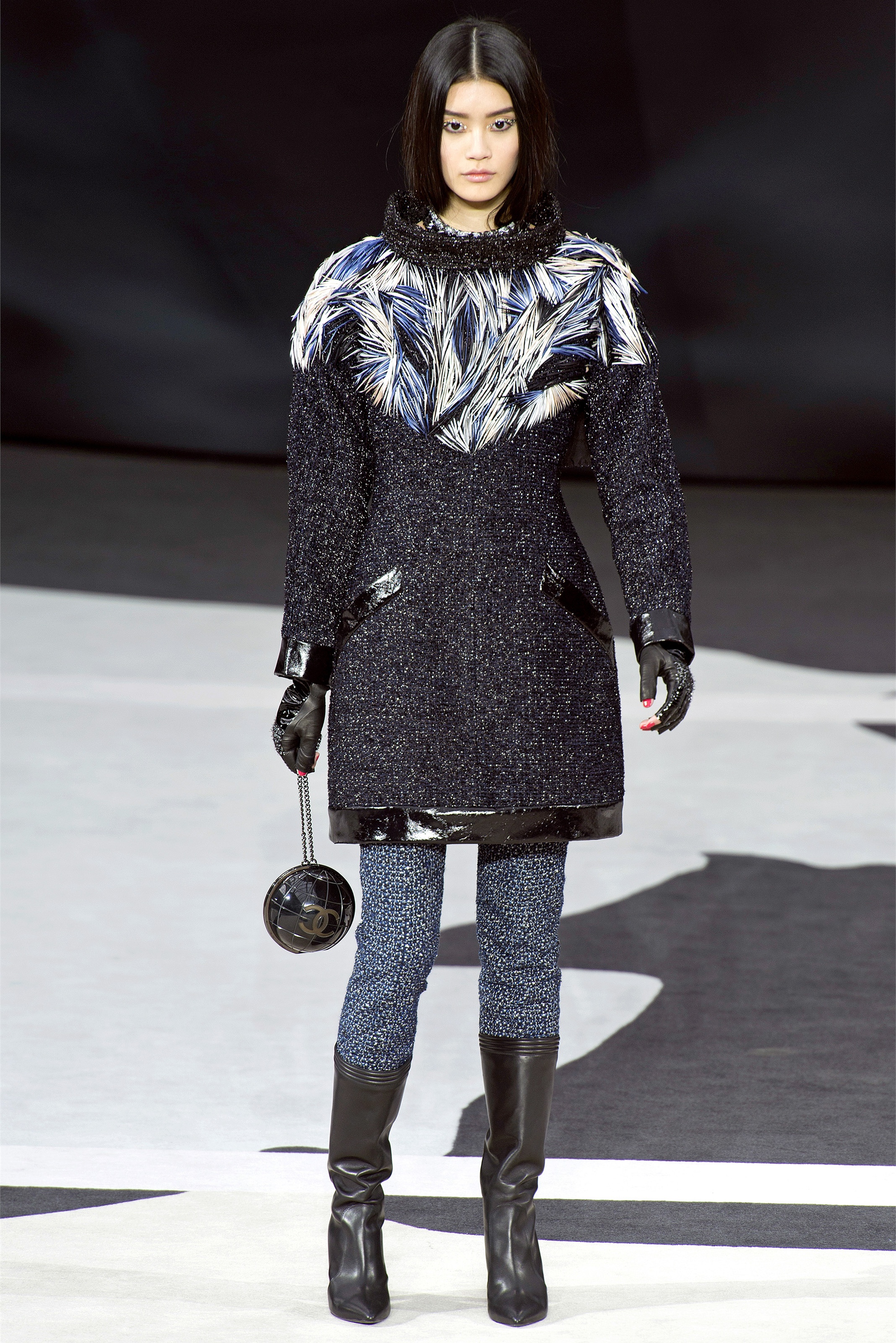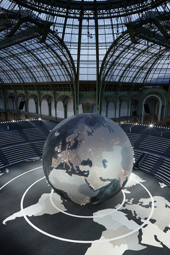 "I've got my feet on the ground, but this collection is up-to-earth, not down-to-earth." While he was speaking, Karl Lagerfeld was strategically placed under the massive globe that majestically revolved, center stage, during the Chanel presentation this morning. So the only way to earth was, in fact, up. But, figuratively speaking, the collection he showed was also "up": one of those confident, energetic, clothes-packed epics that he could probably draw in his sleep. (Not as banal as it sounds—Lagerfeld has often said he awakes from dreams and sketches a collection on the spot. He refers to it as "automatic" designing.)