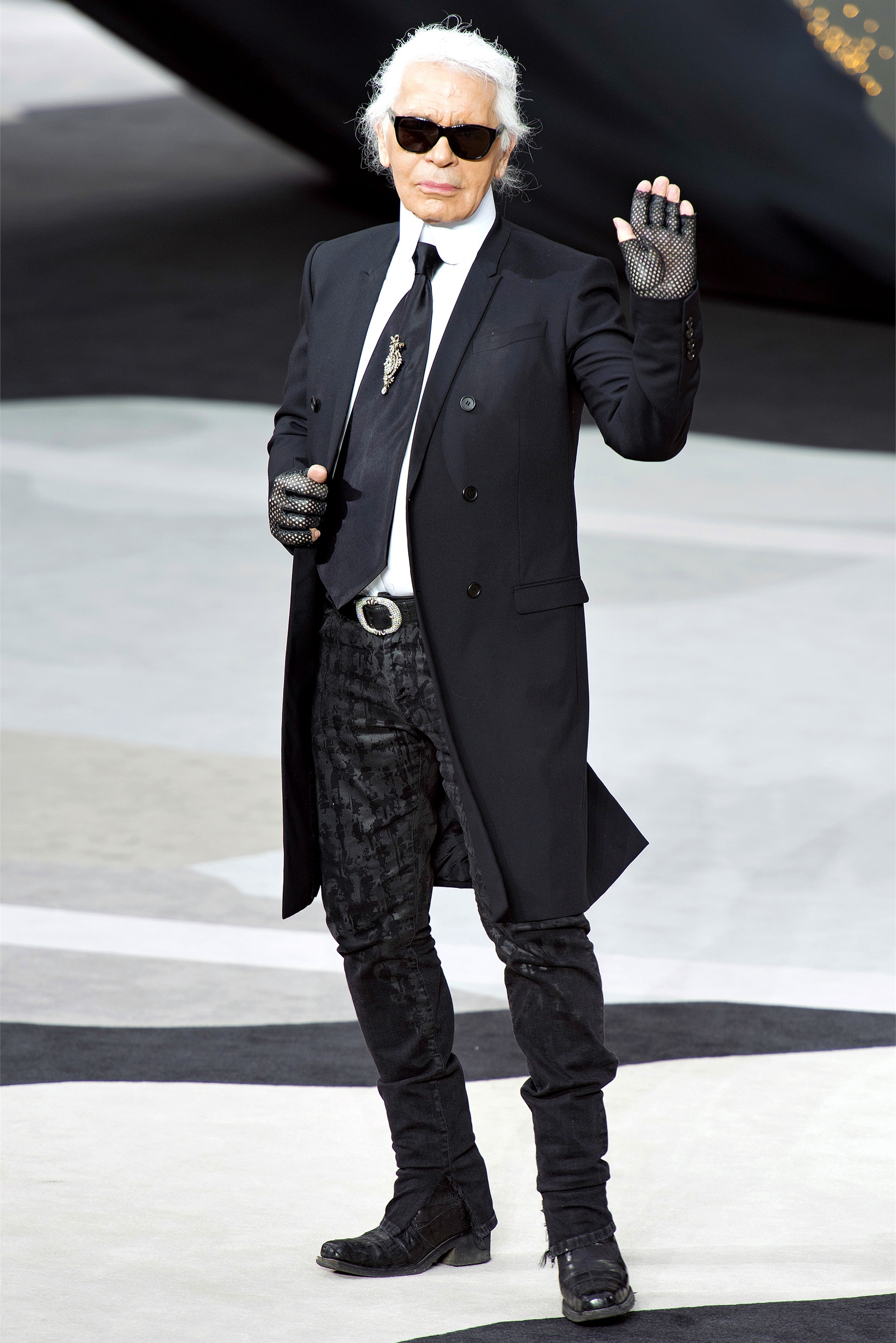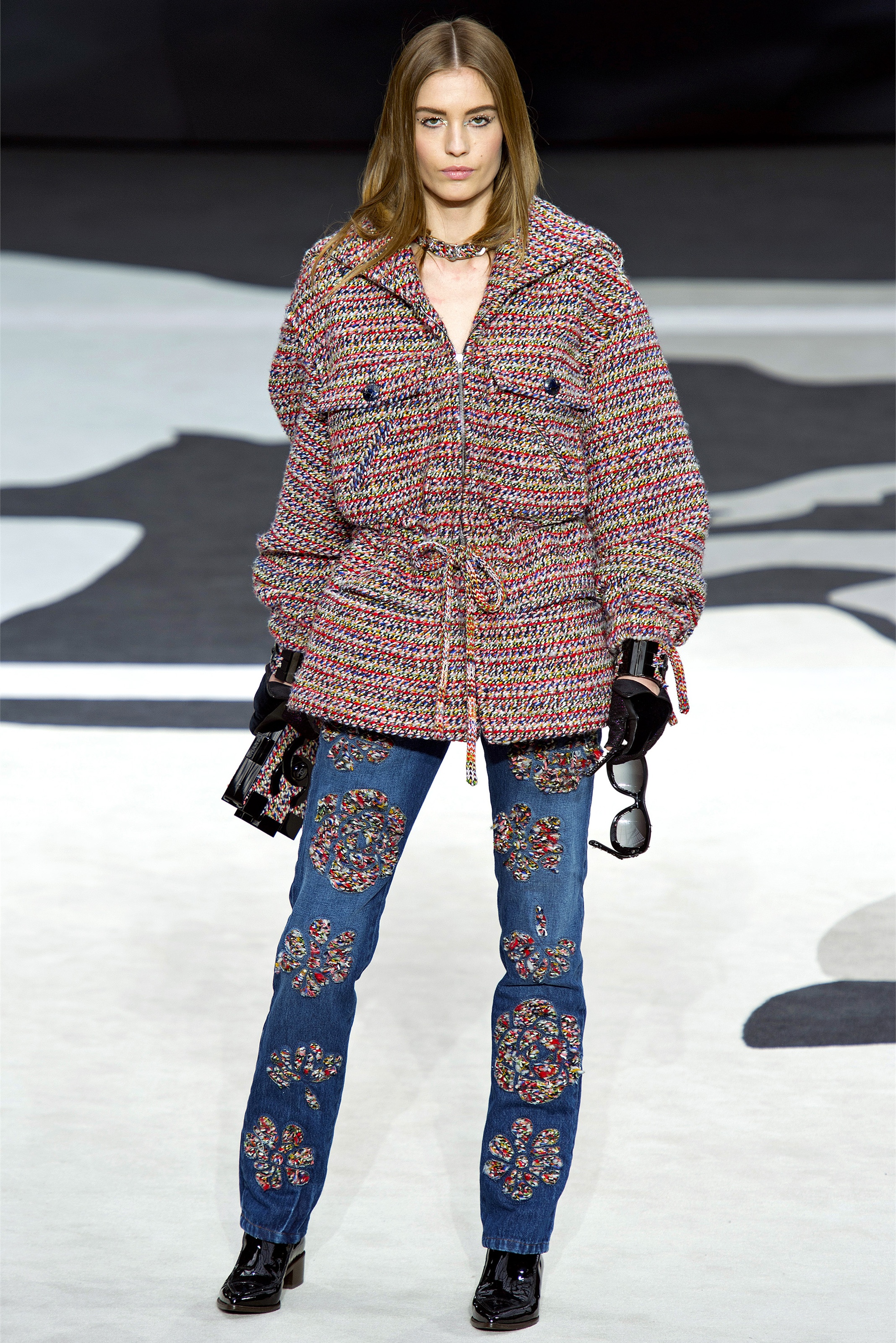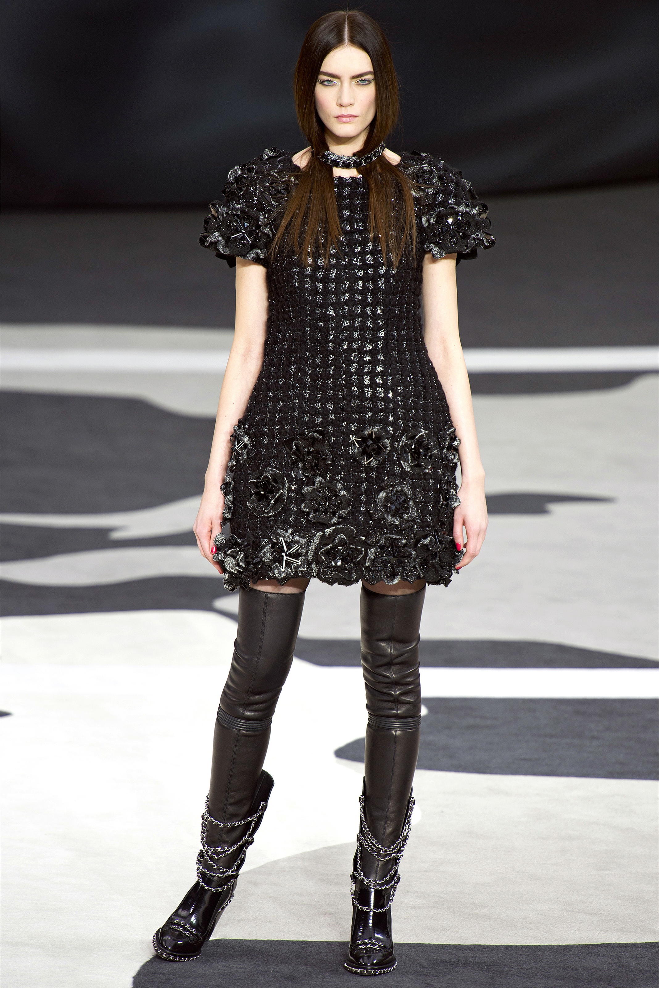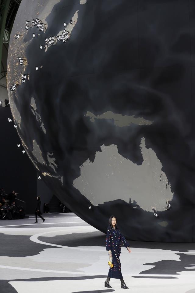 As usual with Chanel, the fabrics defied comprehension. Anything that looked woven was just as likely to be an artful web of embroidery, like the explosions of monochrome flowers toward the end of the show. But, unlike with the couture, we were too far away for specifics, and that sense of distance underscored a point Lagerfeld wanted to make about the size of Chanel's business. The scale of the house's ready-to-wear presentations has often seemed like a metaphor in itself, and today, with the globe that revolved before our eyes, dotted with hundreds of logo-ed flags showing the location of every Chanel shop, it was even more suggestive. If only Lagerfeld had popped out the top at the finale to straddle the planet…he's not usually one to slight a subtext, and Karl-as-Kolossos would simply have reaffirmed his role as the one and only dominator.