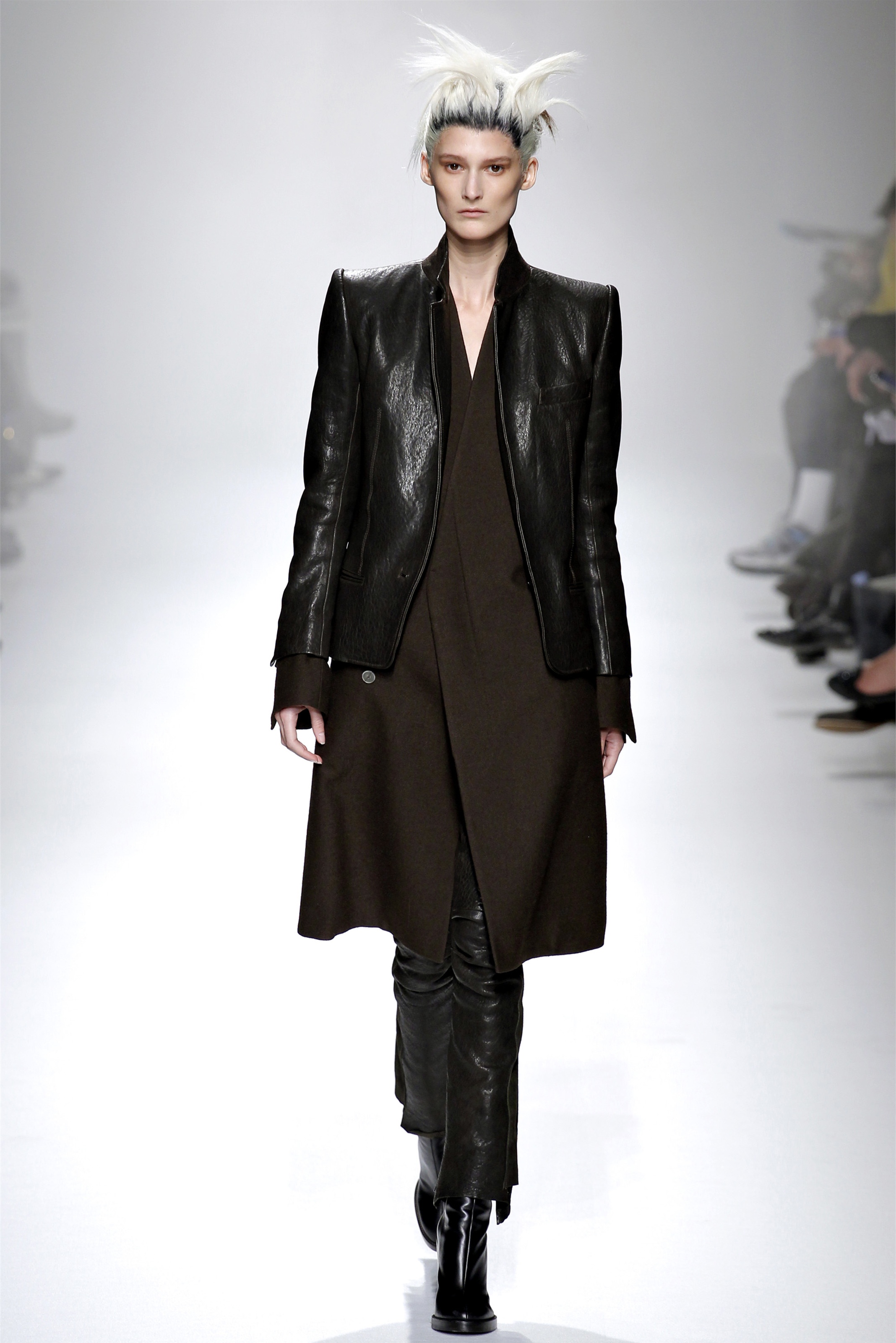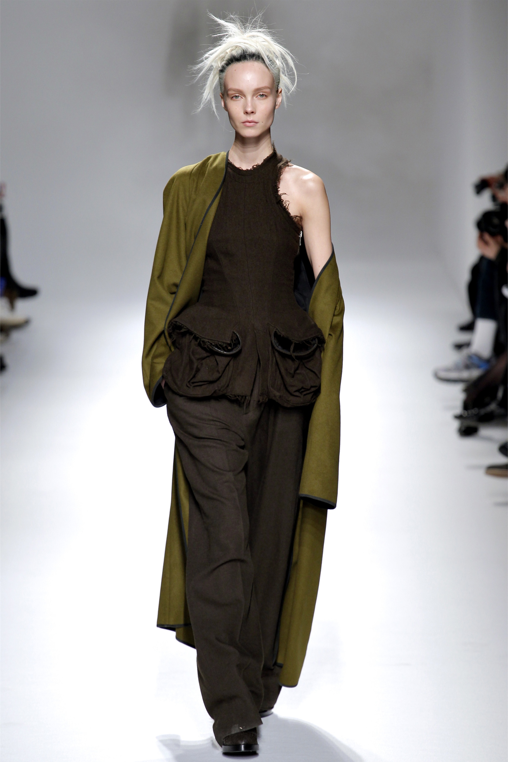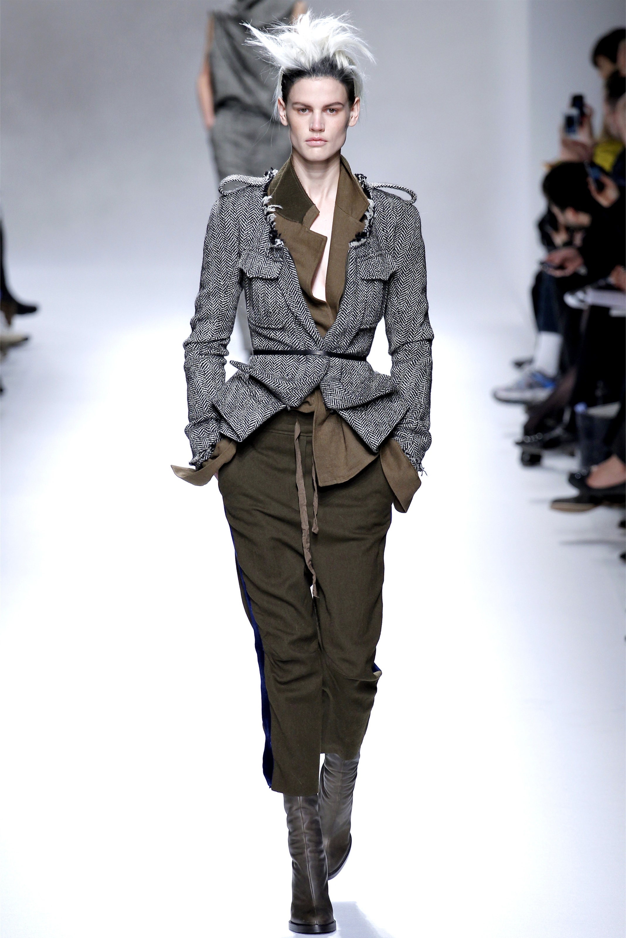 When you see his clothes in the front rows—and we've seen plenty this week, not just on Tilda Swinton—it's the sharper pieces that his customers gravitate to, with strong shoulders and defined waists. Gratifyingly, there was more of that sort of thing on the runway in the form of a houndstooth military jacket with the collar torn off and the seams left raw, or another jacket in surplus brown with purple velvet lining its ruffled peplum.