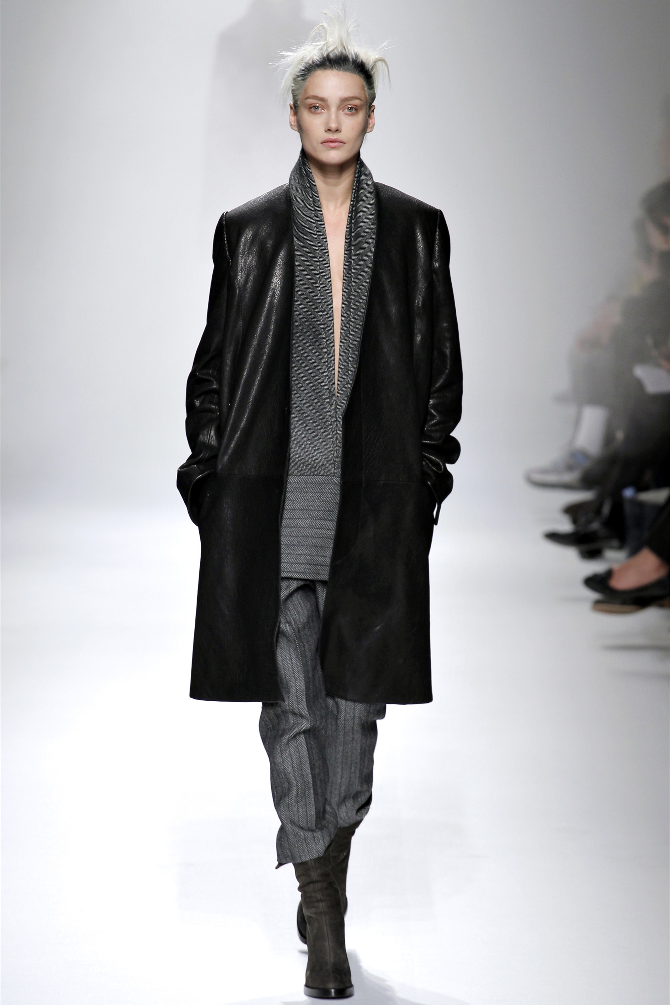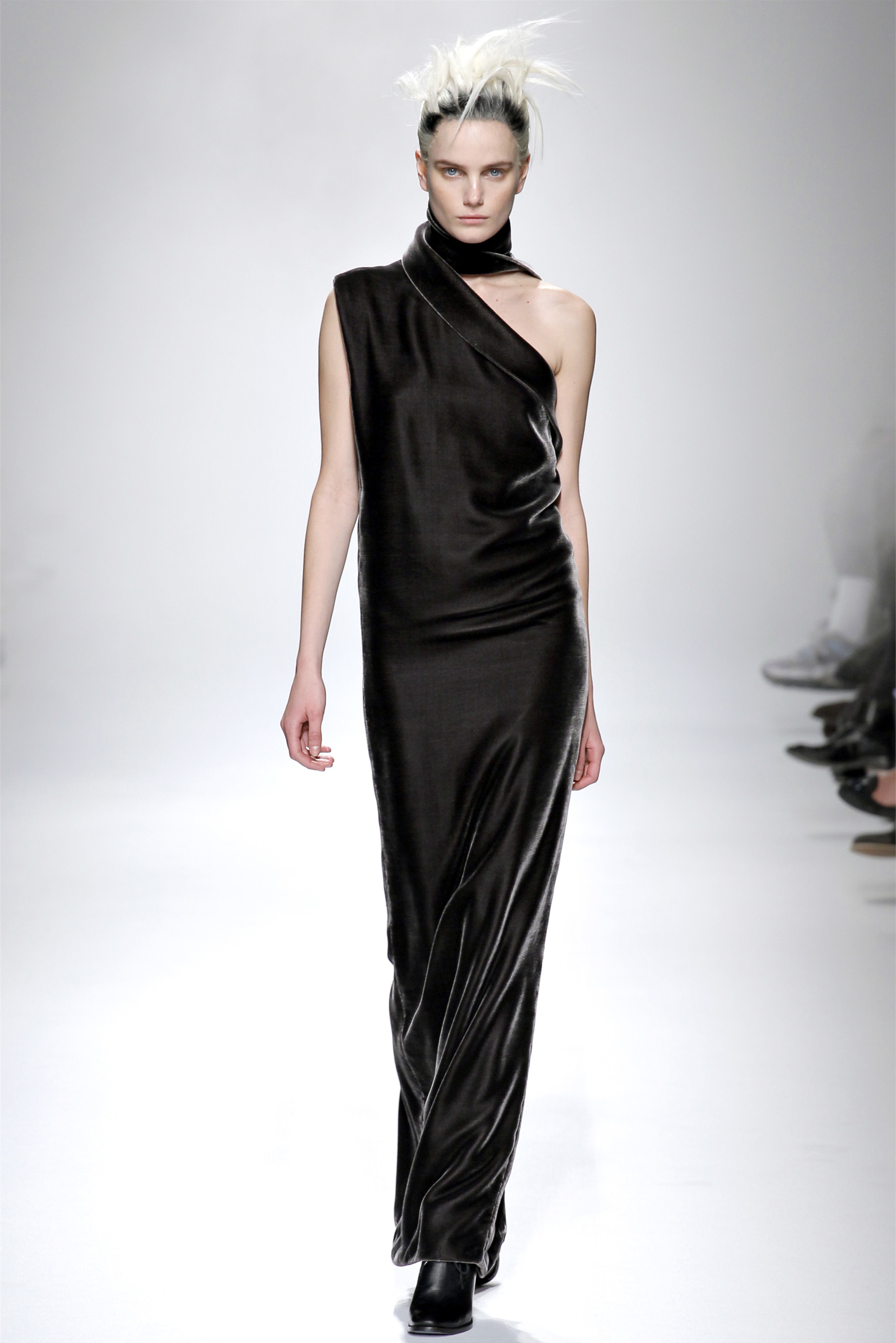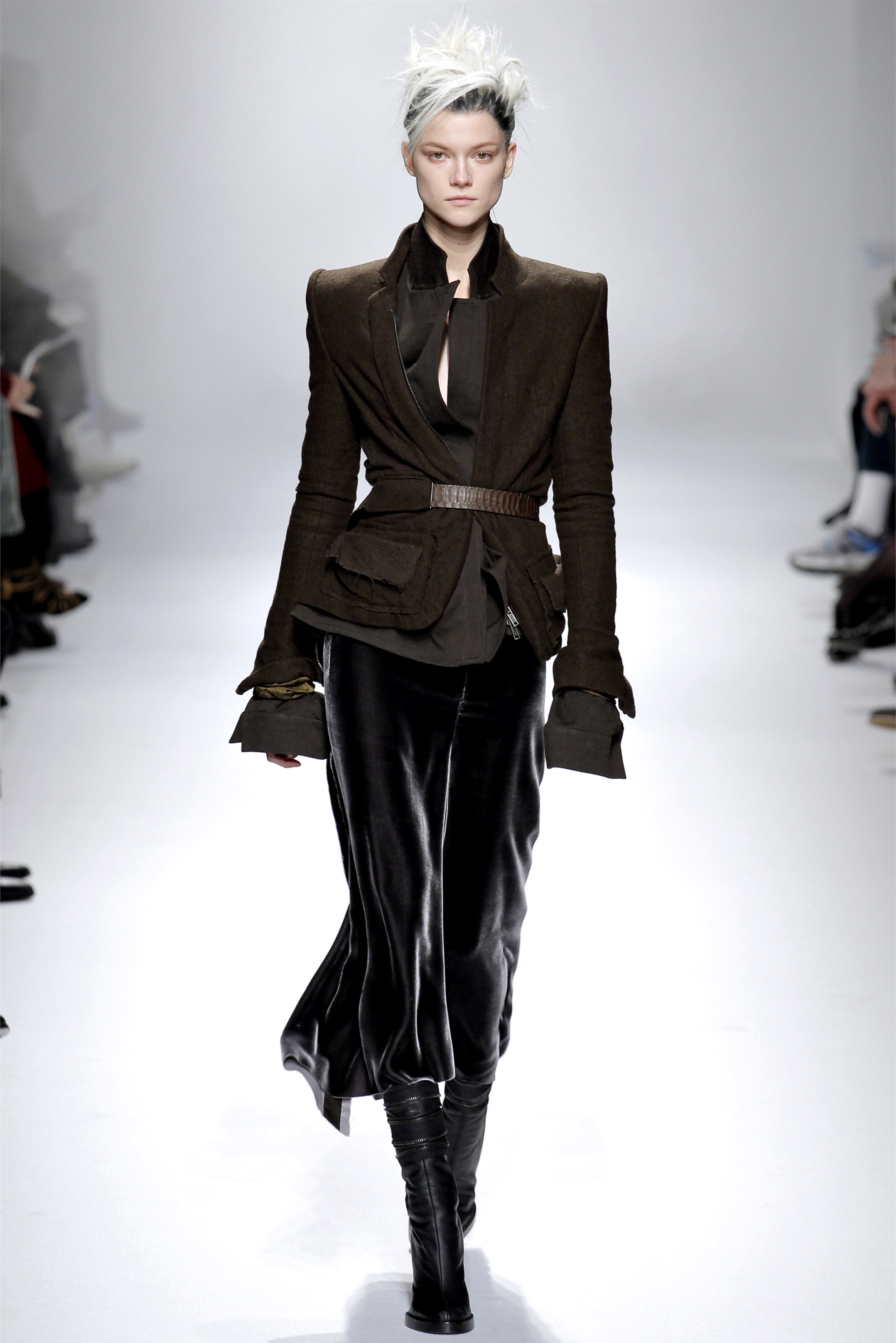 Ackermann reduced his dress offerings to just one for Fall. From a designer famous for straps spilling off shoulders, twisting seams, and trailing hems, the smoky gray panne velvet column gown here was notable for its spare simplicity. Tailoring is where his interests lie at this moment. Some of it was awkwardly oversize, with full-legged pants pooling around the model's ankles, or droopy sleeves extending almost to the knees. Those pieces were moody and evocative as all get out—like a girl in her soldier lover's uniform, or, as the designer suggested afterward, like Marilyn Monroe emerging from the hospital all bundled up against the paparazzi. (Monroe was on the sound track.) But they were also a bit indulgent on Ackermann's part.