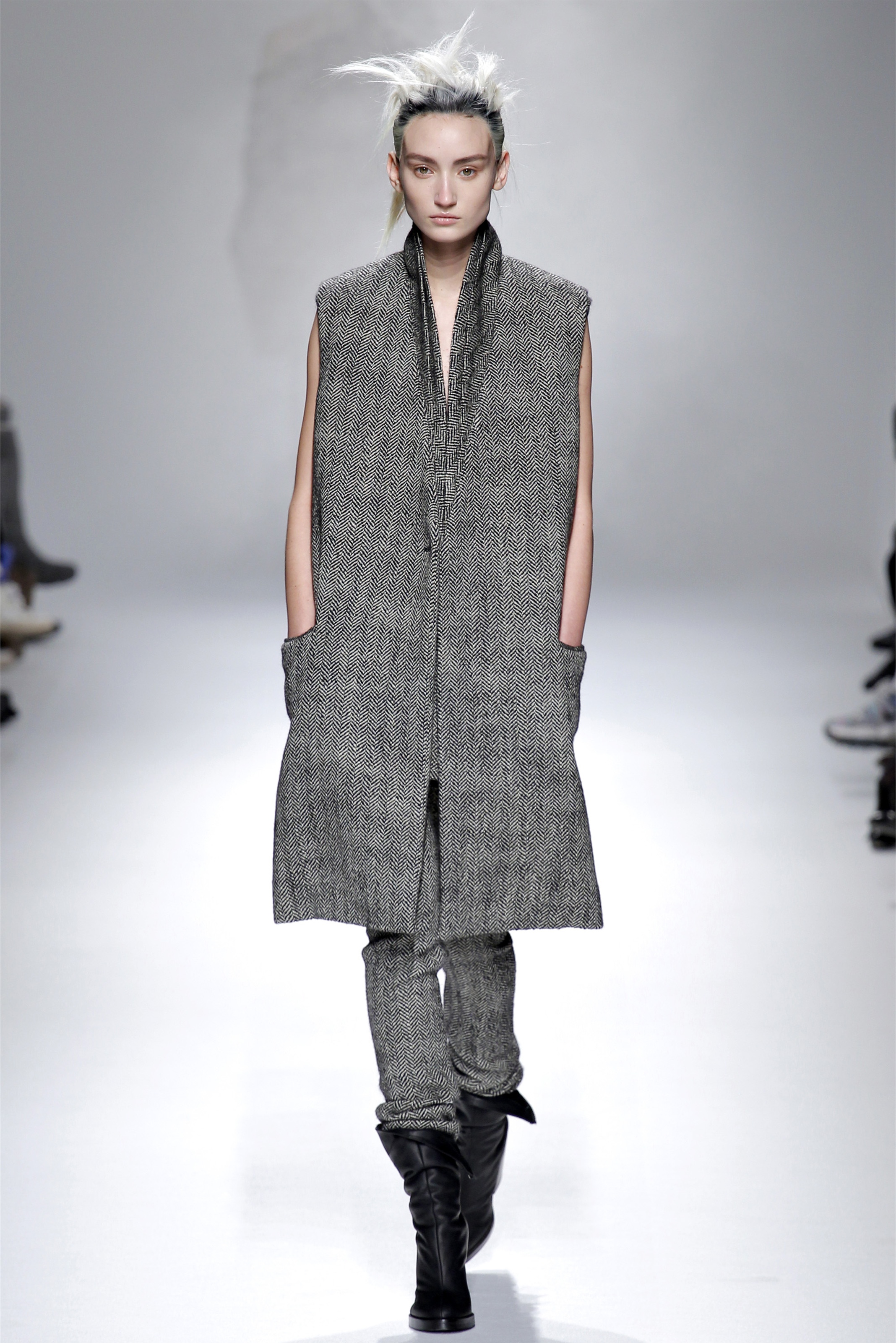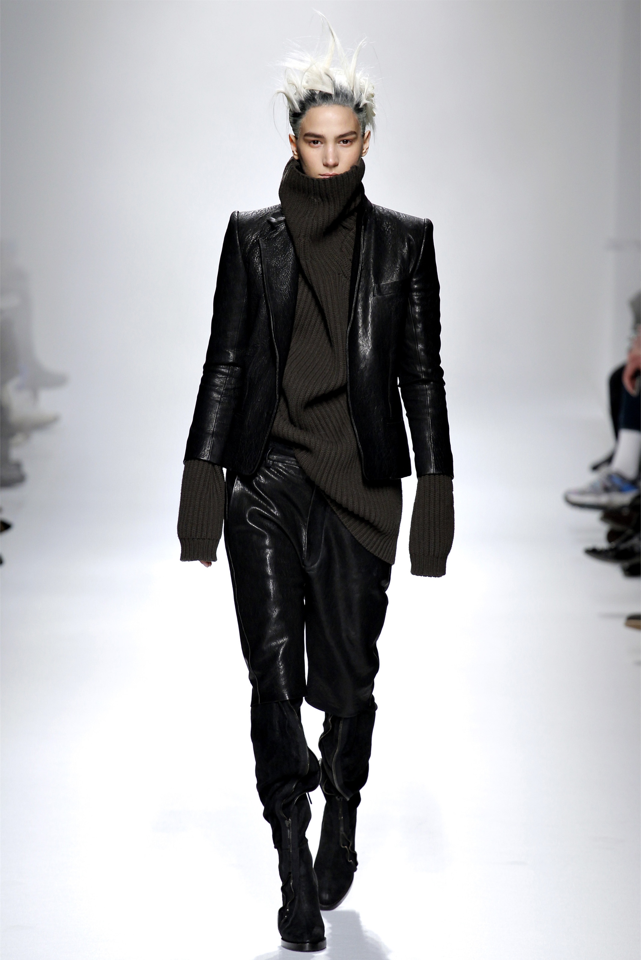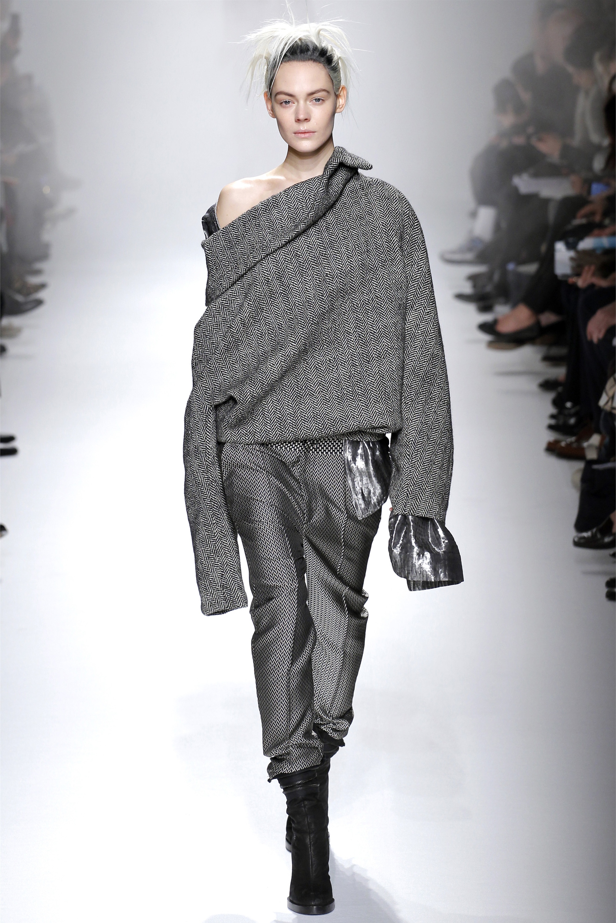 Ackermann reduced his dress offerings to just one for Fall. From a designer famous for straps spilling off shoulders, twisting seams, and trailing hems, the smoky gray panne velvet column gown here was notable for its spare simplicity. Tailoring is where his interests lie at this moment. Some of it was awkwardly oversize, with full-legged pants pooling around the model's ankles, or droopy sleeves extending almost to the knees. Those pieces were moody and evocative as all get out—like a girl in her soldier lover's uniform, or, as the designer suggested afterward, like Marilyn Monroe emerging from the hospital all bundled up against the paparazzi. (Monroe was on the sound track.) But they were also a bit indulgent on Ackermann's part.